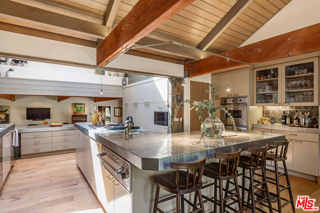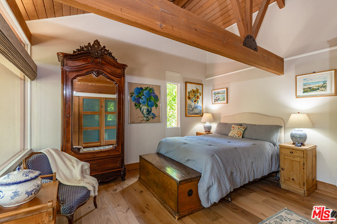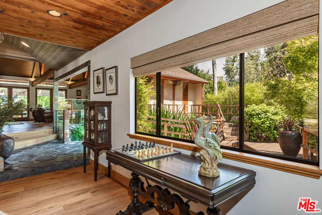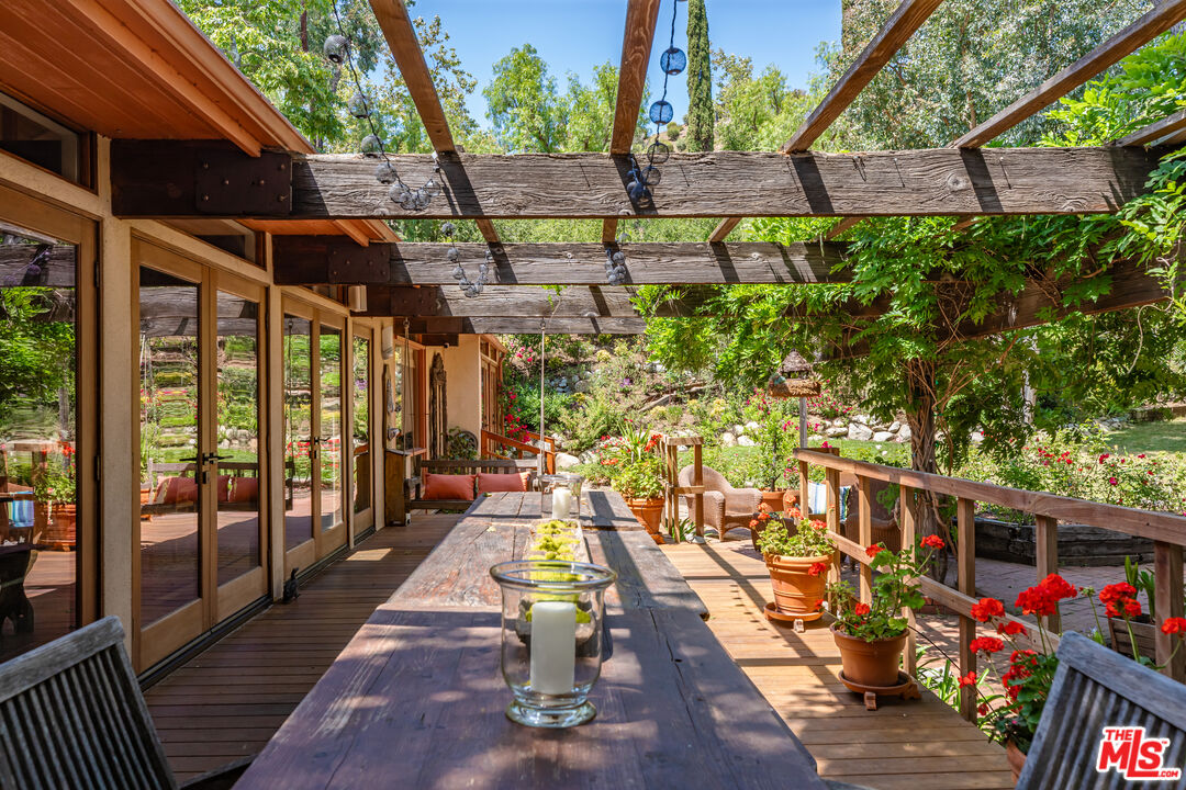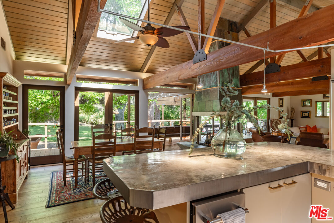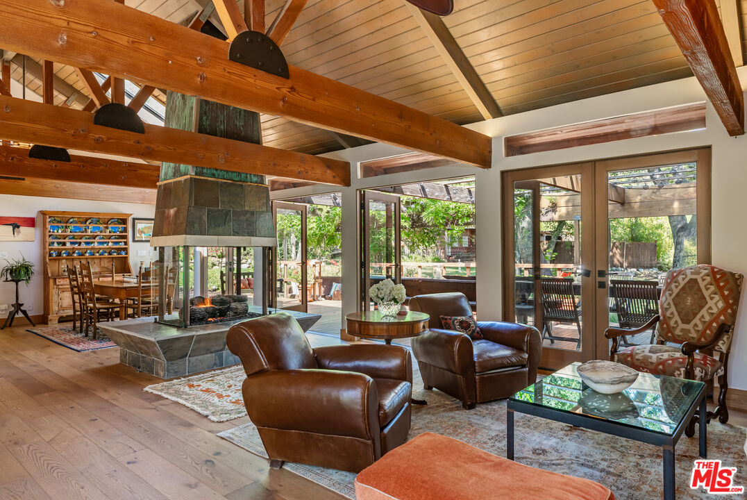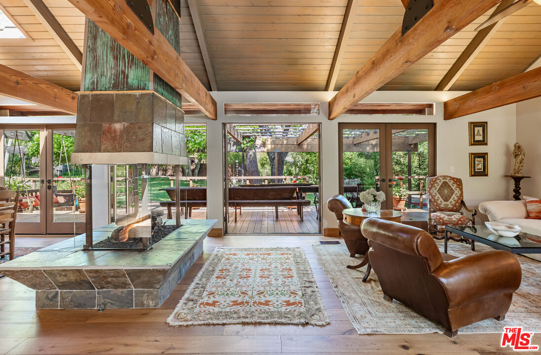 PRIVATE MONTE NIDO ESTATE ON OVER AN ACRE. Only 13 Minutes to Malibu. Tucked at the end of a quiet cul-de-sac and surrounded by majestic sycamore and oak trees, this private Monte Nido retreat sits on just over an acre of flat, park-like grounds offering rare space, privacy, and effortless indoor-outdoor living just minutes from Malibu. This beautiful single-level architectural home blends thoughtful design with natural surroundings. French oak floors, soaring wood-beamed ceilings, and a dramatic four-sided fireplace anchor the open living space, while a wall of French doors connects the interior to the lush backyard and pool, filling the home with natural light. The chef's kitchen features concrete countertops, custom cabinetry, and premium appliances, including double ovens, warming drawer, ice machine, Sub-Zero refrigerator and freezer, and two dishwashers. Skylights illuminate the adjacent dining area.The flexible floor plan offers four bedrooms and four bathrooms, thoughtfully arranged for privacy. The newer primary suite features soaring ceilings, custom built-ins, French doors that welcome morning light, and a spa-like bath with soaking tub and heated floors. A step-down family room opens directly to the backyard and pool. The resort-style grounds, designed by renowned landscape architect Nick Williams, include a pool with a rock waterfall, flowering gardens, mature oak trees, fruit trees, a rose garden, and a charming chicken coop. A unique rock-wall pool bath opens to an outdoor shower and private garden. The fourth bedroom can also serve as a den, office, or creative space.A rare canyon sanctuary where architecture, privacy, and nature come together. Ideally located just minutes from Malibu Creek State Park's hiking trails, the vibrant restaurants, shops and beaches of Malibu, Calabasas Commons and the 101 Freeway. Situated in the award-winning Las Virgenes School District.