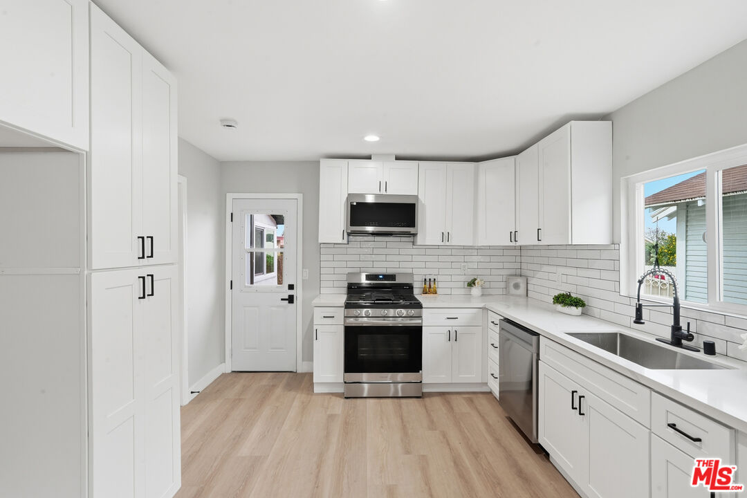 Beautiful two bedroom two bathroom home newly remodeled. New vinyl flooring, new kitchen, windows, bathrooms, and paint. Spacious living room and dining room with lots of natural light throughout. Laundry room attached with space for storage. Property is gated with a shared driveway. Large backyard ideal for entertaining, gardening, or use to park additional vehicles. Conveniently located to shopping centers, grocery stores and freeway. Minutes To downtown LA.