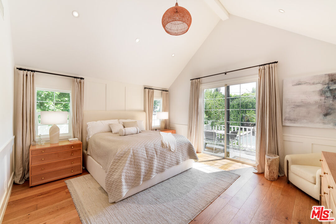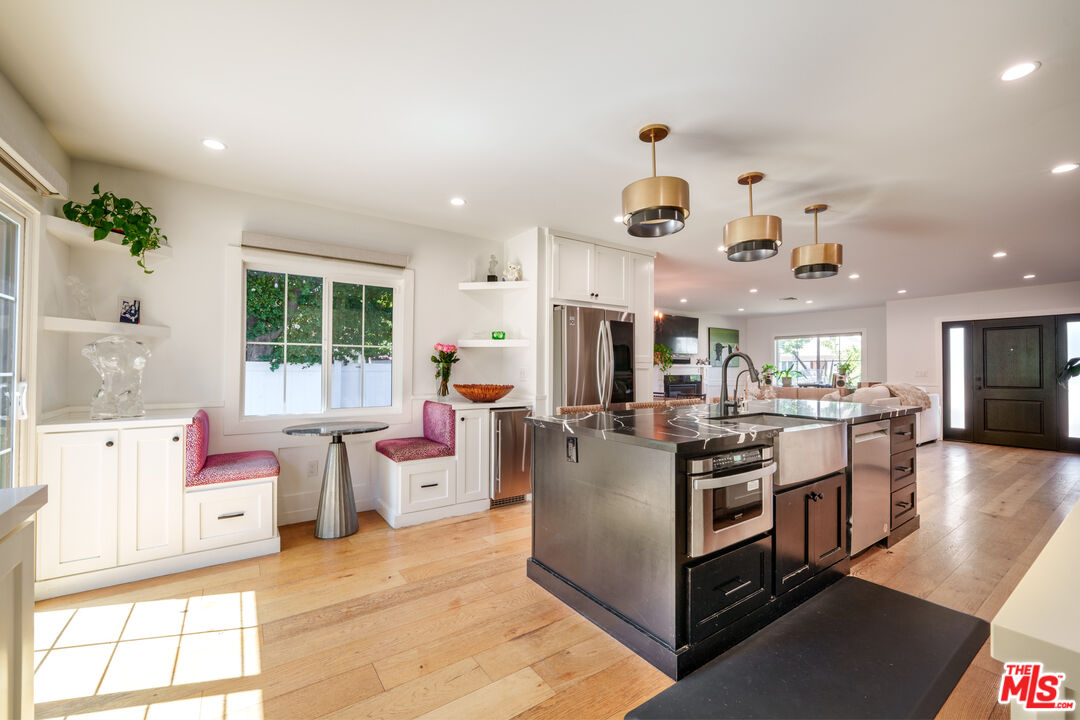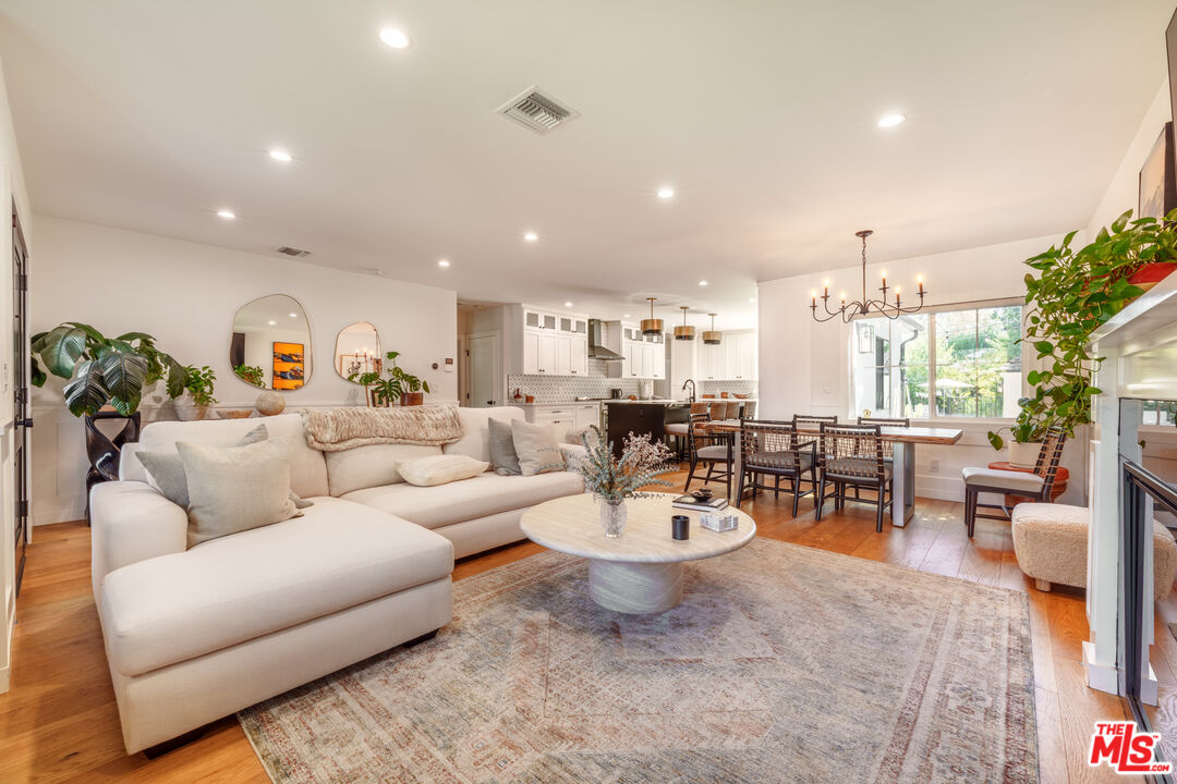 Modern Farmhouse Retreat adjacent to Toluca Lake. Tucked behind manicured hedges and a gated entry, this turnkey 3-bedroom, 3-bathroom residence which was remolded in 2020, blends modern luxury with warm architectural charm. The home is thoughtfully designed for both intimate living and grand entertaining with seamless indoor-outdoor flow and beautifully curated spaces throughout. The covered front porch offers the perfect space for relaxing or reading a book in the fresh air. At the heart of the home, sun-drenched open living areas connect effortlessly, creating a light-filled environment that celebrates both architecture and landscape. The gourmet kitchen is a chef's dream, featuring high-end appliances, including a 5-burner gas stove, a spacious island, a custom built-in banquette and custom cabinetry, flowing into the dining and family area for easy entertaining. The living room with wainscoting throughout also offers a decorative Simplifire to warm winter nights. The primary suite is a serene sanctuary, boasting vaulted ceilings, a spa-inspired ensuite bath with a glass shower, large soaking tub, dual illuminated mirrors and sinks, and Toto toilet, a walk-in closet, and a private patio overlooking the backyard oasis. Outside, experience the ultimate California lifestyle with a solar powered saltwater pool, spa and outdoor shower, a fire pit, BBQ, multiple lounging and dining areas, and lush landscaping including mature hedges, King & Queen palm trees, and avocado, orange, plum, lemon, lime, and pomegranate fruit trees throughout the property. The spacious front and back yards with custom outdoor lighting offers lush landscaping and room for pets and children to roam and play safely within the gates. A detached one-car garage has been converted into a versatile flex space with plumbing and electrical, ideal as a gym, office, or potential guest suite and can easily be converted back to a garage if desired. There's also room to park up to seven cars in the driveway. Alarm and security systems with cameras throughout the grounds. This charming home is just minutes from all that Studio City, Toluca Lake and Valley Village has to offer with an array of restaurants, shops and studios (Universal, Disney and Radford), all nearby.