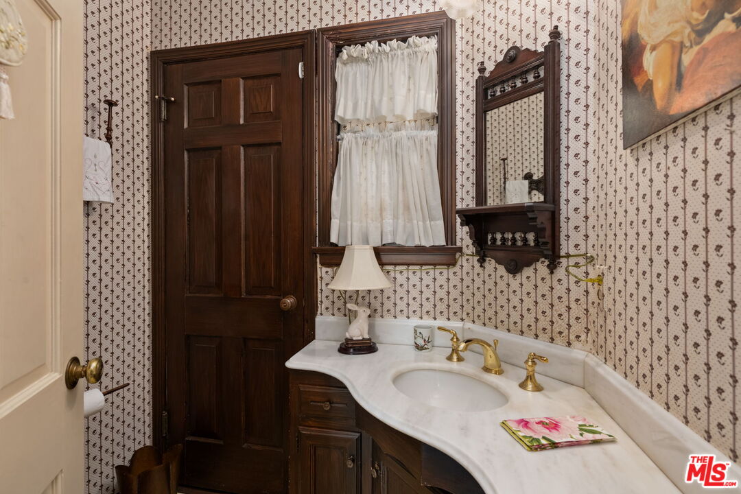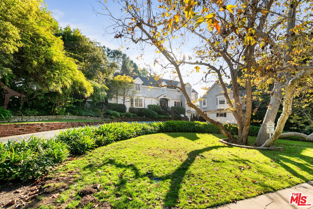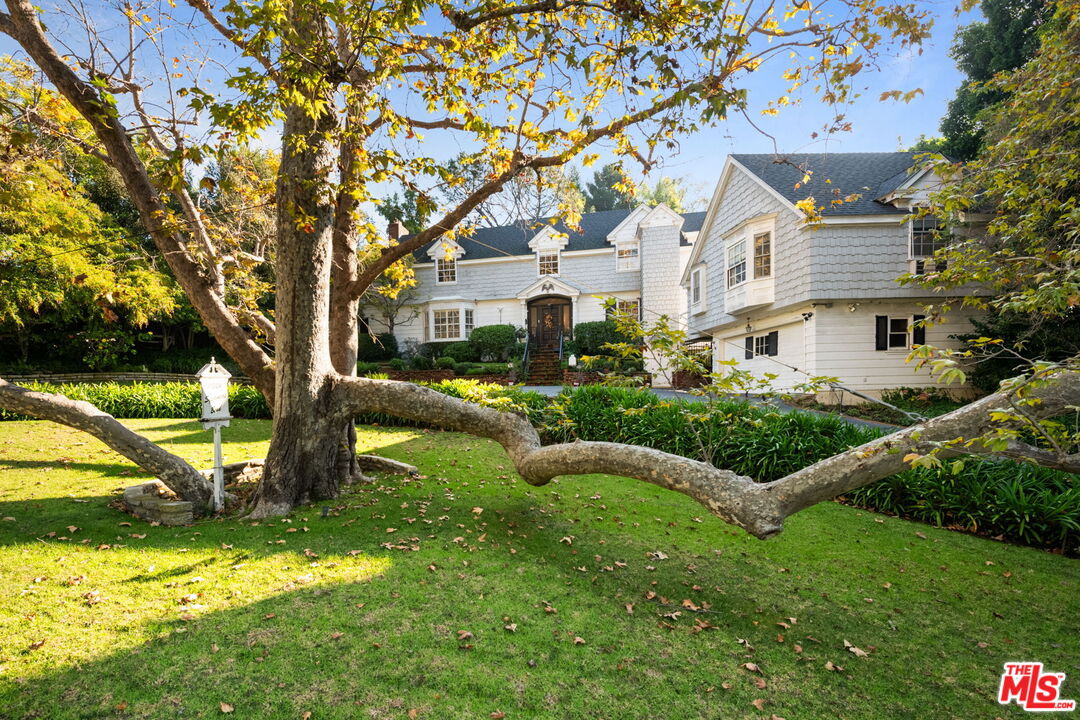 Sunset Boulevard's much admired Sycamore Bend is now available for purchase for the first time in over sixty-three years. Shingle-clad and built originally in 1941, its infinitely charming traditional architectural elements have been lovingly cared for and carefully preserved over the years. Impressively set back from the street up a gentle, grassy knoll and framed by a majestic Sycamore, this wonderful home is surrounded by full mature landscaping and accessed easily by a convenient circular driveway. A welcoming formal foyer leads to the sunny living room with its crown, dentil moldings, stately fireplace, bay window and French doors leading out to the backyard. Peg-and-groove hardwood floors grace much of the first floor. The charming den, with its beamed ceilings, brick fireplace and built-in cabinets also has a wet-bar with a soda fountain. It also leads out to the backyard. The formal dining room, with its wainscoting, crown moldings and bay window has room for two tables. The country kitchen has wood paneled cabinetry, some with glass-faced doors, original period hinges, wood beamed ceiling, stainless steel appliances and a very sweet breakfast nook. A very cozy, yet spacious, downstairs ensuite bedroom has beamed ceilings, paneled walls and its own bath. A service area/laundry room and a powder bath complete the first floor. A lovely staircase leads to the upstairs landing and to three terrific bedrooms. The primary, with its tall pitched and beamed ceilings, has a romantic fireplace, a large bath with a separate tub and shower and an unusual amount of closet space for its vintage. It also has a very nice sitting room, perfect as an office, small gym or even as a nursery. The upper terrace, taking in peaceful views of the backyard, can be accessed from here. Two additional, cheerful, amply-sized family bedrooms share a full bath. The peaceful backyard is maturely wooded and has a large, covered porch for easy al fresco entertaining. There's also a wide expanse of grass for kids to play upon. Added much later but in careful keeping with the style of the main house, a guest house also graces this special property. It features a full kitchen with a breakfast bar, laundry facilities and a very comfortable living area with tall, pitched and beamed ceilings, a bay window with a window seat, plenty of built-ins, an open bedroom nook and a loft, perfect for use as an office or as a second sleeping area. In the main house, an elevator effortlessly accesses all the way up from the driveway level to the first and second floors. There's a two-car garage and plenty of off-street parking in the circular driveway including a covered carport for the Guest Unit. There is extensive storage space in both the attic and in the cellar. Inclusion in the Warner Avenue Elementary School district. All this, moments from UCLA and from Westwood, Brentwood, Century City and Beverly Hills and all the fine shopping and dining each area affords. Please ask listing agent about quoted square footage. Although neither Broker nor any of its Agents nor Seller guarantee the accuracy here, according to an appraiser's measurement (please see attached floor plan in photos section of the listing), the Main House measures 3,257 square feet and the Guest Apartment measures 679 square feet for a total of 3,936 square feet. See agent about exclusions, please.