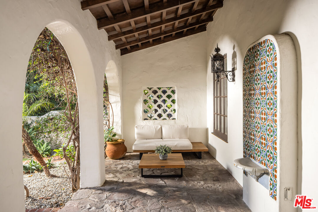 Tucked behind a veil of lush greenery and mature palms, this Spanish Revival sanctuary exudes the soul of Old Hollywood while embracing the ease of contemporary living. From the moment you enter through its arched gates, the property unfolds like a private garden estate -- framed in cascading bougainvillea, terracotta details, and the gentle sound of water echoing through an expansive front courtyard.Inside, the home balances romance and restraint. Light pours through paned windows, illuminating the warmth of plaster walls, hand-carved doors, and burnished wood floors that trace a timeless rhythm throughout. Each archway feels intentionally composed -- leading from intimate sitting rooms to airy gathering spaces, where iron sconces and Moorish lanterns glow softly at dusk. The kitchen and dining spaces invite connection, designed for meals that stretch into conversation, their windows opening to gardens thick with tropical foliage. Upstairs, the primary suite feels like a retreat within a retreat -- sun-dappled and serene -- with tree-lined views and a richly tiled bath, complete with soaking tub and dual vanity, that nods to the home's heritage.Outdoors, the estate reveals a scene of pure enchantment. A mosaic-tiled fountain anchors the sparkling pool, surrounded by lush greenery, multiple entertaining areas and lantern-lit palms against the evening sky. A shaded patio offers a ping-pong table, in addition to a tranquil space for dining with a BBQ grill. A barrel sauna and shaded lounging corners evoke resort-like seclusion, blending the serenity of a hidden spa with the charm of a Mediterranean garden.More than a home, this is an atmosphere. Situated in a sought-after pocket just moments from Los Angeles' premier shopping, dining, and nightlife, this residence captures the essence of California living.