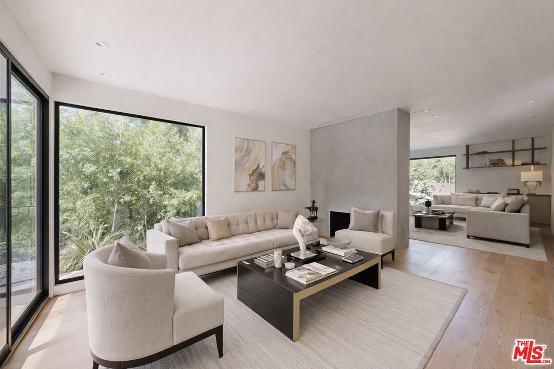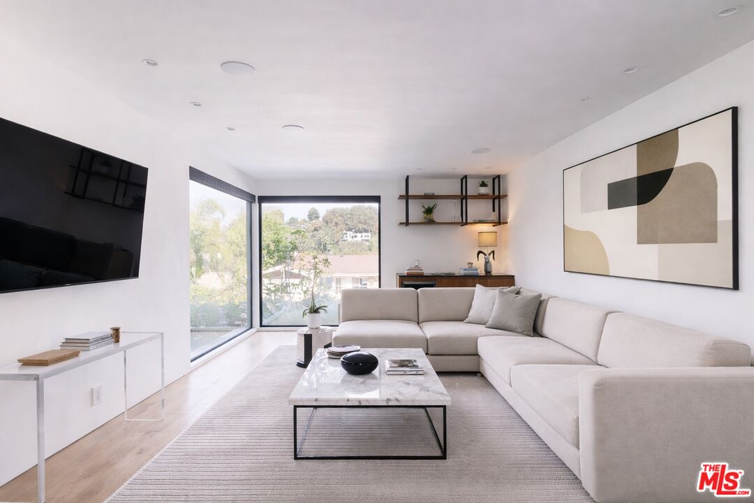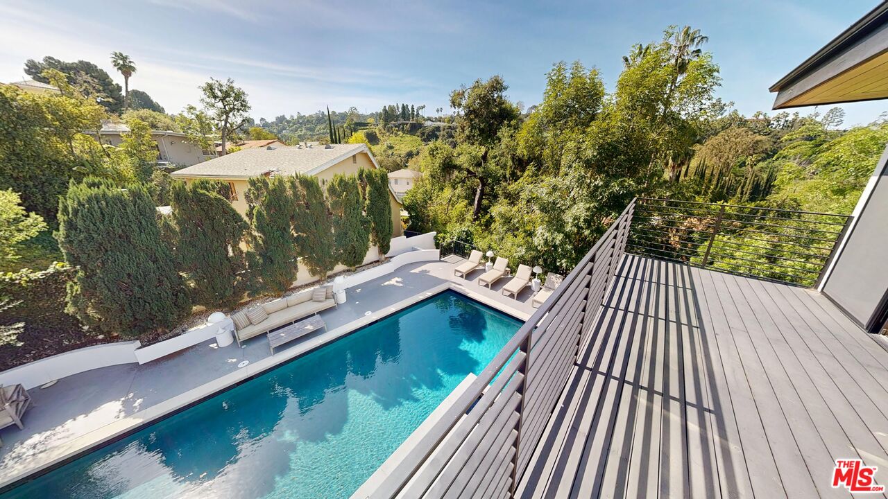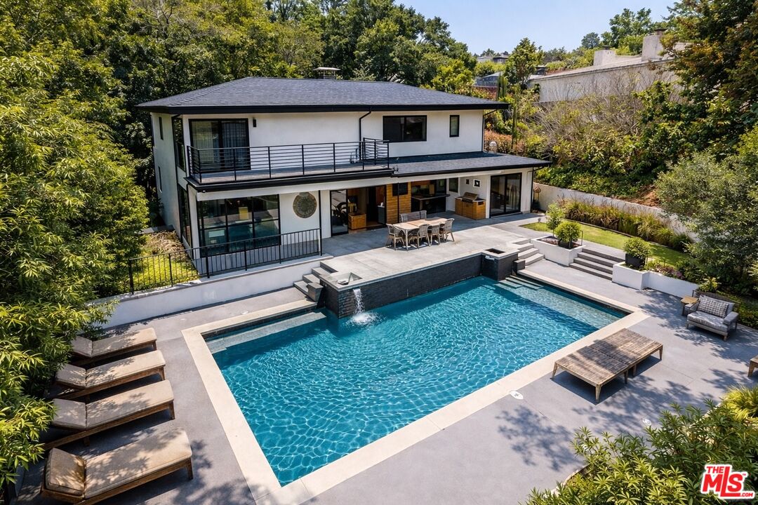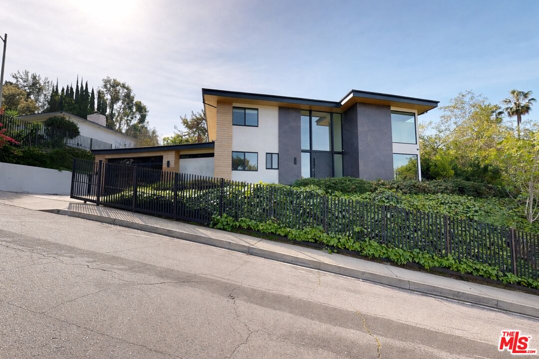 Perched atop a knoll on one of the most sought-after streets in the Donas, one of Studio City's most prestigious neighborhoods, this newly renovated contemporary residence captures sweeping panoramic views across the Mulholland Corridor from nearly every room, seamlessly blending timeless Mid-Century design with elevated modern finishes across approximately 3,900 square feet of gated, private living space. A striking entry opens to soaring ceilings and walls of glass that flood the interiors with natural light, flowing effortlessly into expansive living areas including a refined formal living room, a warm and inviting family room with bar and fireplace, and an elegant dining room set just off the sleek, designer kitchen outfitted with high-end appliances. A dramatic glass-filled atrium with approximately 30-foot ceilings serves as a stunning architectural centerpiece, enhancing the home's sense of scale and openness. The main level also offers a versatile en-suite bedroom, ideal for guests, a home office, or staff quarters. Upstairs, the spacious primary suite is a true retreat, featuring dual walk-in closets, a spa-inspired bath with refined finishes, a private balcony, and a sitting area with breathtaking views, while additional bedrooms are generously sized and appointed with en-suite baths and custom-fitted closets. Designed for seamless indoor-outdoor living, retractable windows and Fleetwood sliding doors open to an expansive entertainer's yard with a large terrace for al fresco dining, a sparkling pool, cabana, and built-in barbecue. Ideally located just moments from the Westside, Ventura Boulevard's shops and restaurants, and the scenic hiking trails of Fryman Canyon, and situated within the highly regarded Carpenter Charter School district, this exceptional offering presents a rare opportunity to own a beautifully reimagined home that effortlessly balances architectural character with modern luxury.
