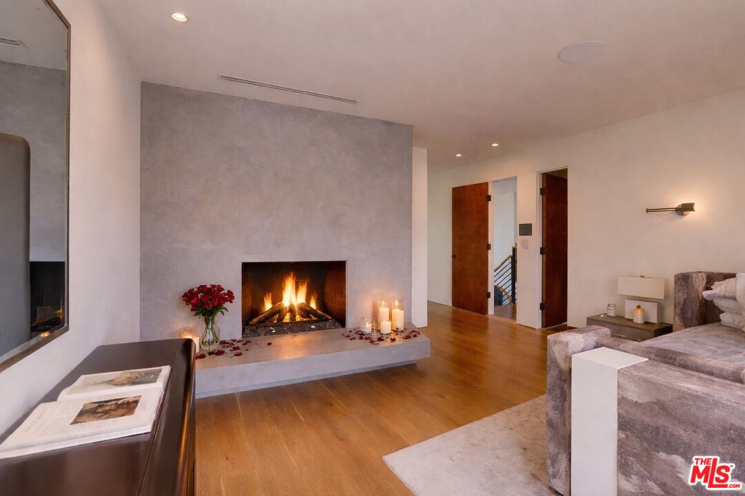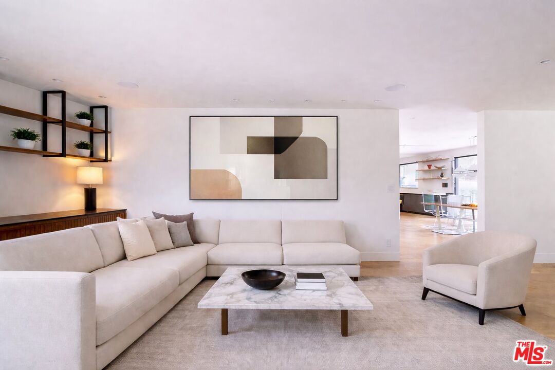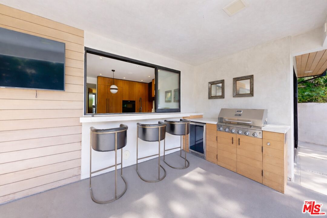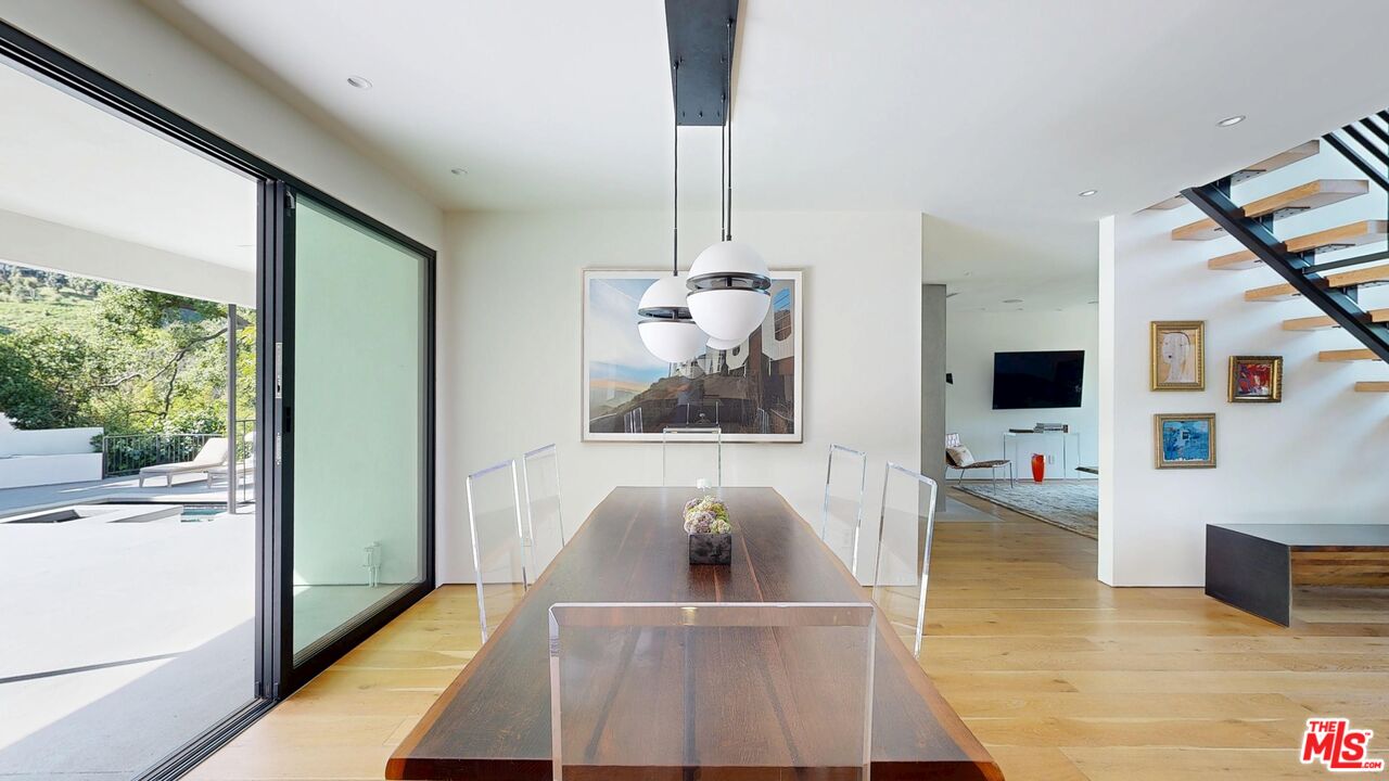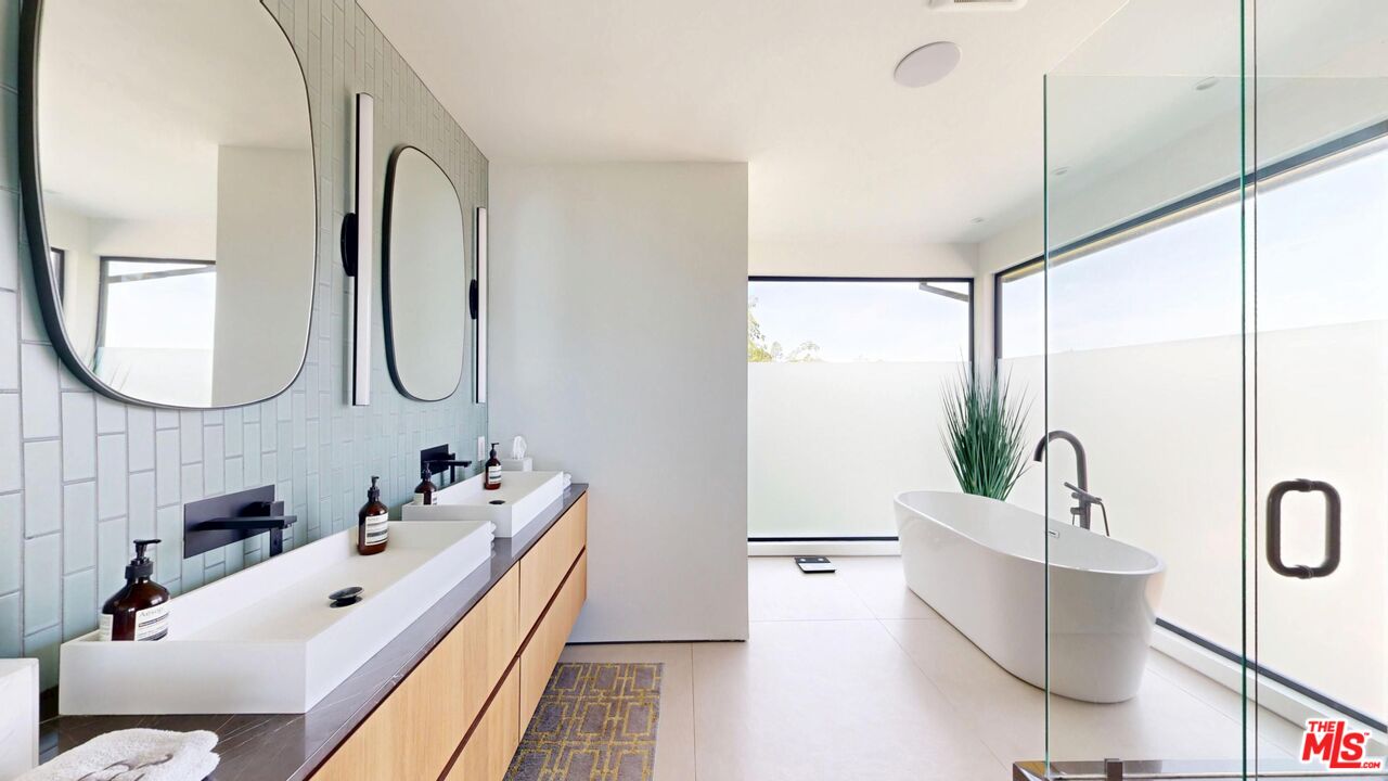 Perched atop a knoll on one of the most sought-after streets in the Donas, one of Studio City's most prestigious neighborhoods, this newly renovated contemporary residence captures sweeping panoramic views across the Mulholland Corridor from nearly every room, seamlessly blending timeless Mid-Century design with elevated modern finishes across approximately 3,900 square feet of gated, private living space. A striking entry opens to soaring ceilings and walls of glass that flood the interiors with natural light, flowing effortlessly into expansive living areas including a refined formal living room, a warm and inviting family room with bar and fireplace, and an elegant dining room set just off the sleek, designer kitchen outfitted with high-end appliances. A dramatic glass-filled atrium with approximately 30-foot ceilings serves as a stunning architectural centerpiece, enhancing the home's sense of scale and openness. The main level also offers a versatile en-suite bedroom, ideal for guests, a home office, or staff quarters. Upstairs, the spacious primary suite is a true retreat, featuring dual walk-in closets, a spa-inspired bath with refined finishes, a private balcony, and a sitting area with breathtaking views, while additional bedrooms are generously sized and appointed with en-suite baths and custom-fitted closets. Designed for seamless indoor-outdoor living, retractable windows and Fleetwood sliding doors open to an expansive entertainer's yard with a large terrace for al fresco dining, a sparkling pool, cabana, and built-in barbecue. Ideally located just moments from the Westside, Ventura Boulevard's shops and restaurants, and the scenic hiking trails of Fryman Canyon, and situated within the highly regarded Carpenter Charter School district, this exceptional offering presents a rare opportunity to own a beautifully reimagined home that effortlessly balances architectural character with modern luxury.