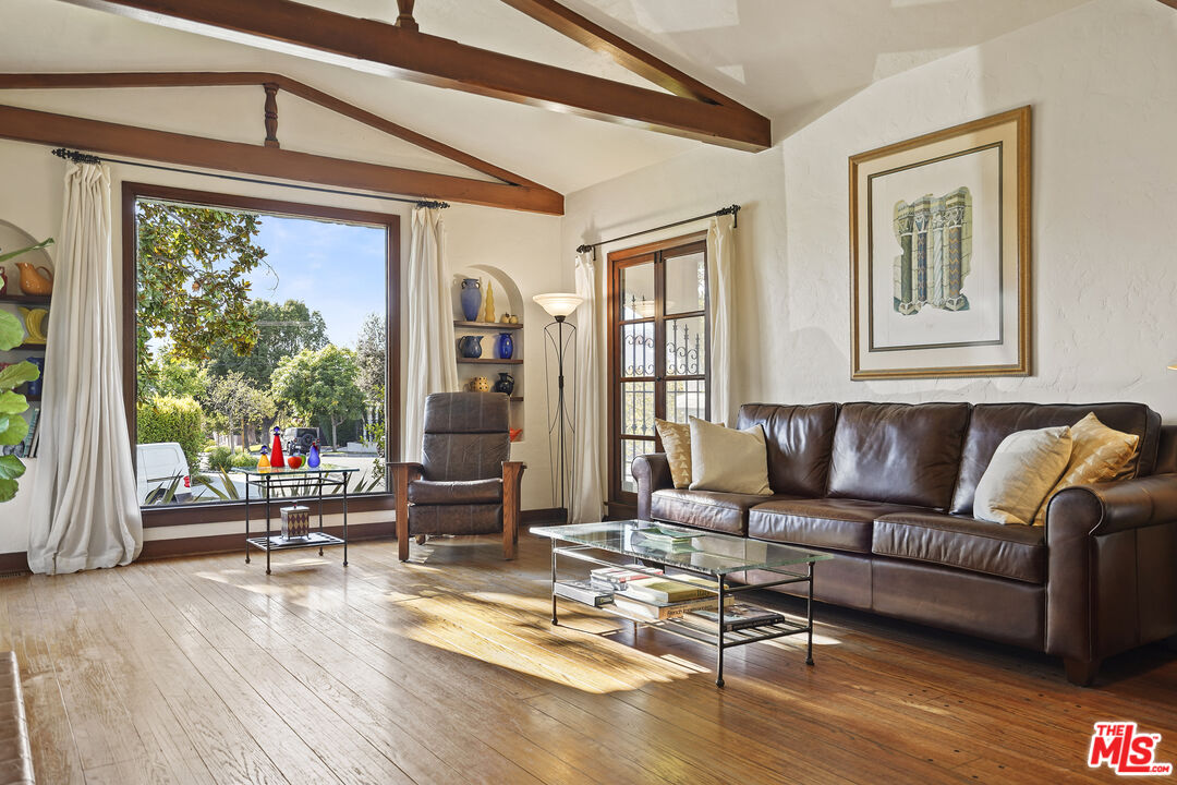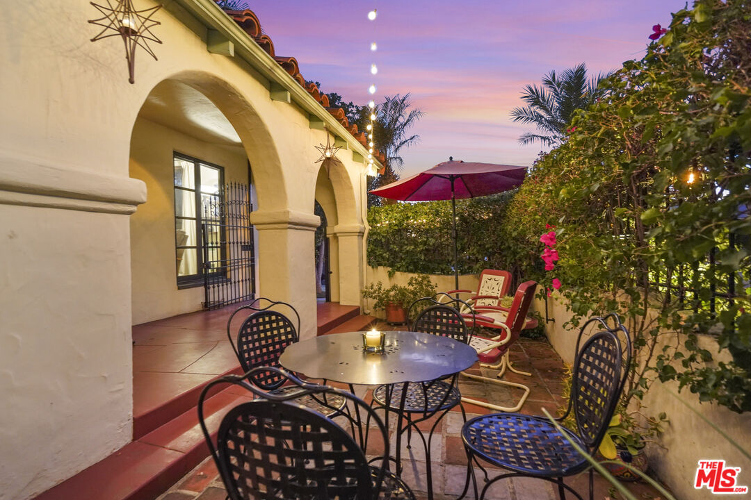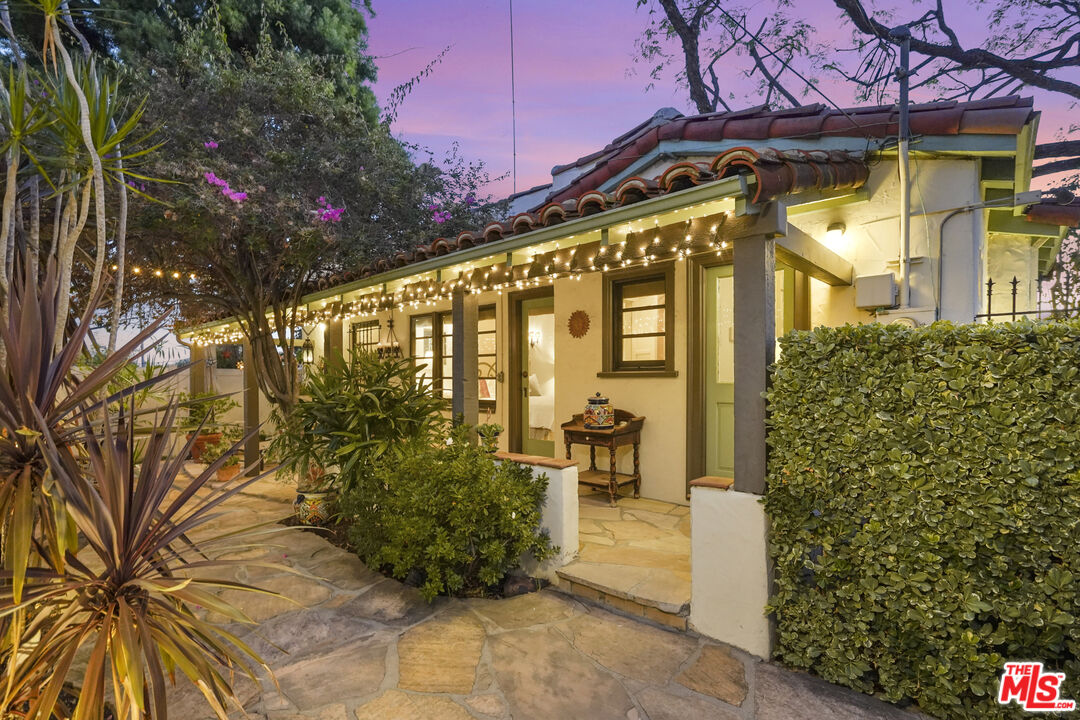 Set behind a classic arched courtyard filled with bougainvillea and the sound of a bubbling fountain, this 1931 Spanish Colonial Revival draws you into something special. Situated in the heart of Glendale's Rossmoyne Historic District, a neighborhood known for some of the city's most beautiful Spanish architecture, the home balances historic character with thoughtful updates that respect its past. The carved wooden front door opens to a welcoming entry where soft arches and a magnesite floor create an elegant first impression. From here, step down into the living room with its original French windows, vaulted beamed ceiling accented with hand-stenciled details, and a fireplace surrounded by handmade tiles from the historic Markoff Mosaic Tile Corporation. Peg-and-groove hardwood floors carry through much of the home, bringing warmth and texture to each space. Across from the living room, the dining room looks onto the courtyard fountain and offers generous proportions, setting the stage for gatherings. The updated kitchen is bright and functional, blending seamlessly with the home's style and offering plenty of room for cooking and connection. One and 3/4 bathrooms reflect the home's 1931 roots with restored tilework, while three bedrooms provide comfortable retreats, including an en-suite that opens to the veranda and backyard. Outdoors, a flagstone-paved yard surrounds the expansive spa beneath twinkling lights and umbrellas, framed by stucco walls and mature greenery. The shaded veranda just off the house offers a relaxed spot to lounge or entertain, making the backyard feel like a private retreat. Additional updates include copper plumbing, newer central air and heat, and a bolted foundation. 1148 Cordova is a home where history feels alive and daily life fits right in.