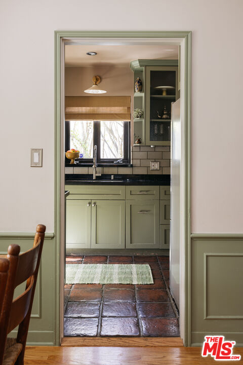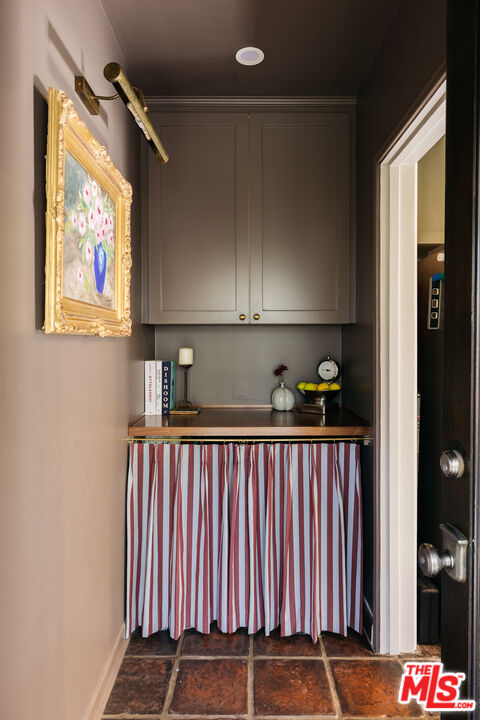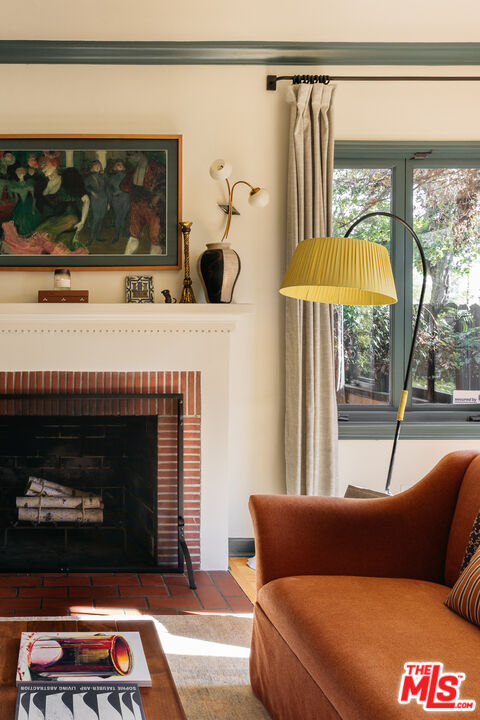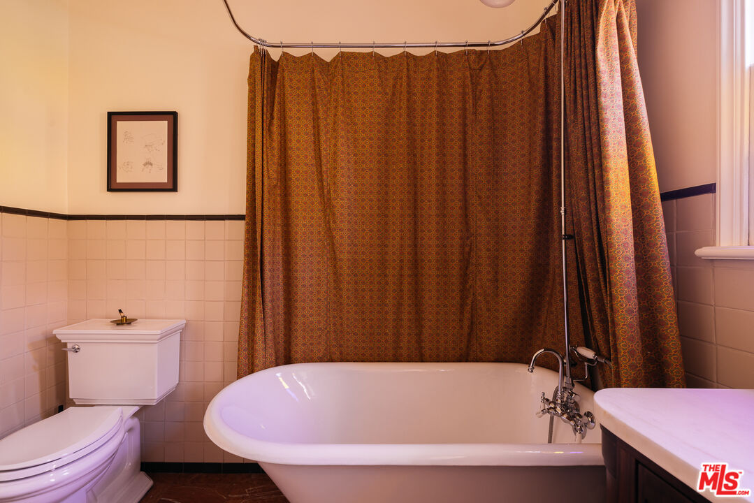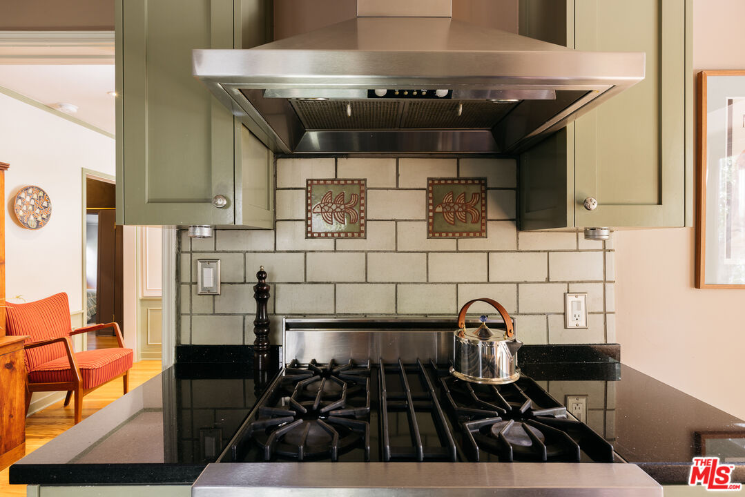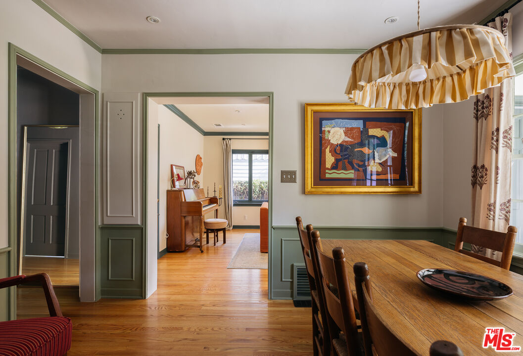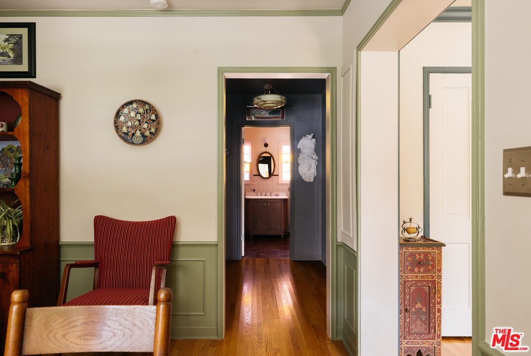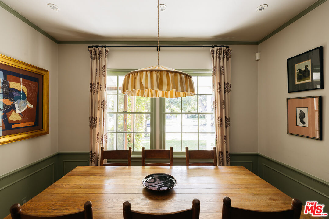 Picturesque traditional modern home with interior design by Garance Rousseau awash in mature trees and greenery with fully done detached recording studio or guest house available now. Stepping past the mature tree and grassy front yard into the home puts you in the living room, featuring original hardwood floors, wood framed windows, and bespoke fixtures. Through the cased transition is the formal dining room with wainscoting that gives way to the kitchen area, all accented with Farrow & Ball paint and detailing. The custom kitchen is framed by picture windows, a built-in breakfast nook, and features stainless steel high end appliances. The bathroom has been renovated with Rosso Alicante marble floor and Fireclay tile walls, Rejuvenation vanity and antique glass knobs, and clawfoot bathtub and shower. The guest bedroom has beautiful wood windows and a door to the backyard, while the primary bedroom has a custom closet with built-ins and room for a king bed. The gated backyard has a covered patio for al fresco dining and a koi pond surrounded by mature plants, vines and fruit trees. Across the small bridge over the koi pond through a door is a fully outfitted approximately 300 sf recording studio or guest house with its own powder room bathroom. It has been soundproofed, fitted with hardwood floors and recessed lighting, features a window looking out to the koi pond and greenery, and has its own dedicated mini split HVAC system. The home has central heating and cooling, EV car charger, custom built-out laundry closet, and parking in the driveway for two cars outside the gate. A special oasis in North Hollywood ready for its next steward.