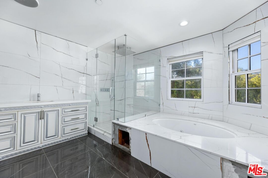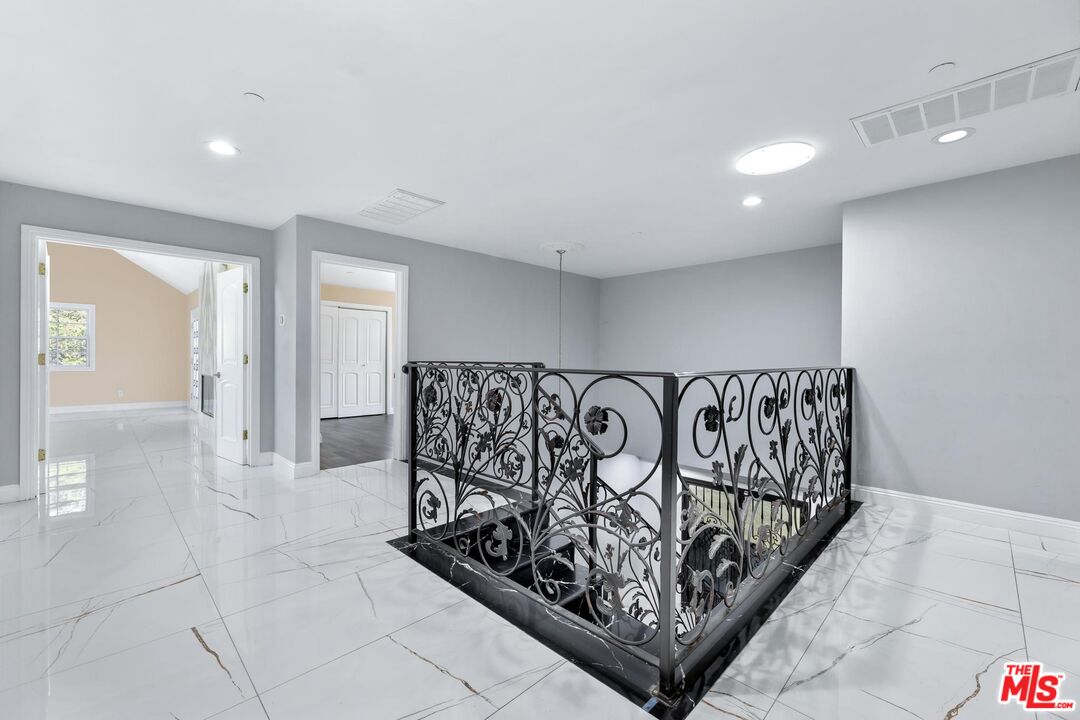 Located in highly sought-after North Granada Hills, this 2006 custom-built residence presents a rare opportunity for renovation - property has been mostly remodeled with some areas in need of TLC & cosmetic completion. Featuring 5-beds and 7-baths, this stately home comprises 3,450 SF, plus a studio-style guest house, and is situated on an expansive 26,000+/- SF Lot. A formal entry with soaring ceilings opens to generous living spaces with coffered ceilings, crown molding, custom wrought iron detail, and marble/hardwood floors throughout. Each bedroom features its own remodeled en-suite bathroom. Upstairs, the primary suite features a pitched ceiling, marble fireplace, balcony, and a large en-suite bath with soaking tub, dual vanities and a large walk-in shower. The impressive backyard is perfect for entertaining, featuring a large saltwater pool and spa, custom stone fire pits, gazebo with built-in BBQ, and sweeping views of the canyon. An incredible opportunity with endless potential in one of Granada Hills' most desirable neighborhoods - close to Zelzah Park, Aliso Canyon, and within the top-rated Granada Hills Charter School District. Property being sold as is, where is - Buyer to verify all information.