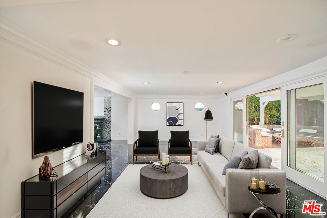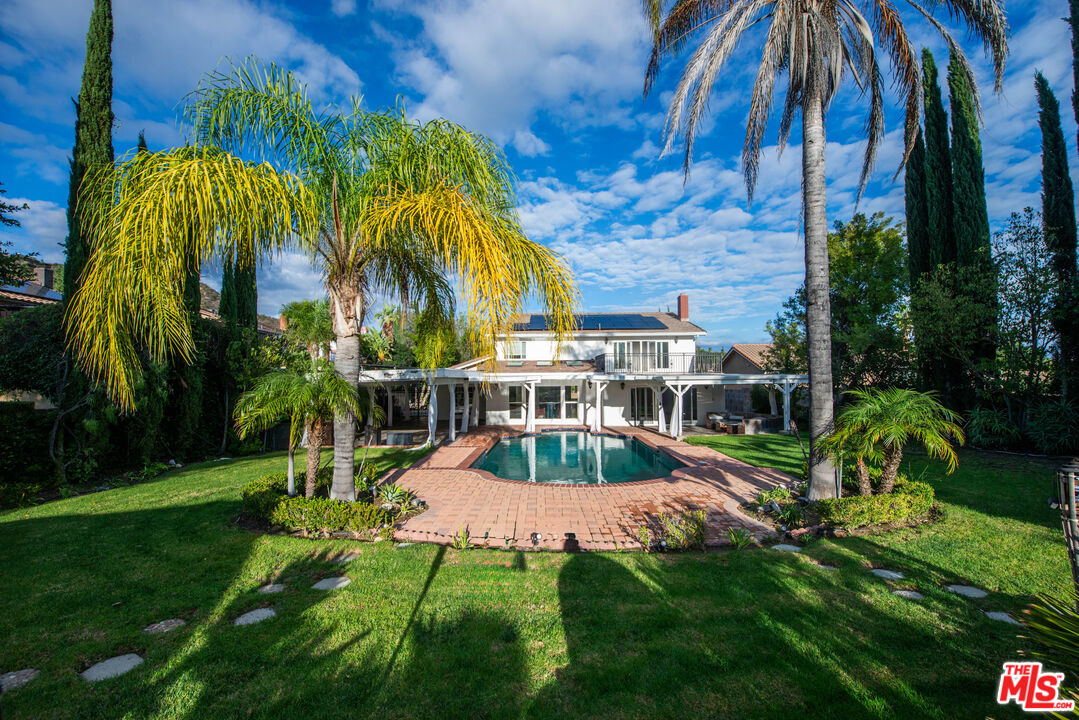 Private, gated estate at the end of a cul-de-sac on nearly half an acre of flat, usable grounds. A long private driveway leads to this impressive Porter Ranch residence featuring a spacious, open layout with soaring ceilings, recessed lighting, and multiple entertaining spaces. The chef's kitchen offers granite countertops, modern cabinetry, and Viking stainless steel appliances, opening to a large family room with a wet bar and fireplace. The dramatic spiral staircase leads to a spacious primary suite featuring a large private balcony and breathtaking views of the backyard. The resort-style backyard is designed for entertaining, featuring a beautiful pool, expansive lawn areas, a covered outdoor lounge with lighting and ceiling fans, a wooden deck, and lush, mature landscaping. Additional highlights include a three-car attached garage and extensive parking possible for RVs, boats, and multiple vehicles. A rare opportunity to own a private compound in one of Porter Ranch's most desirable pockets. New roof and new solar contract.