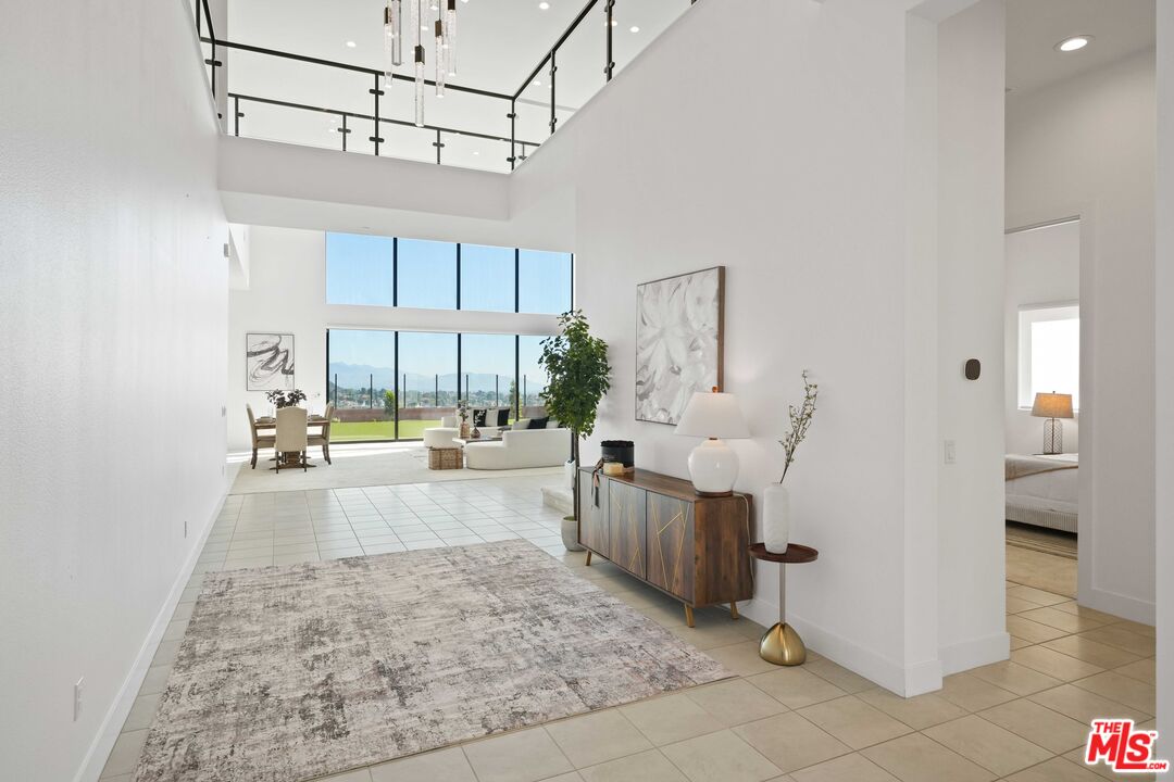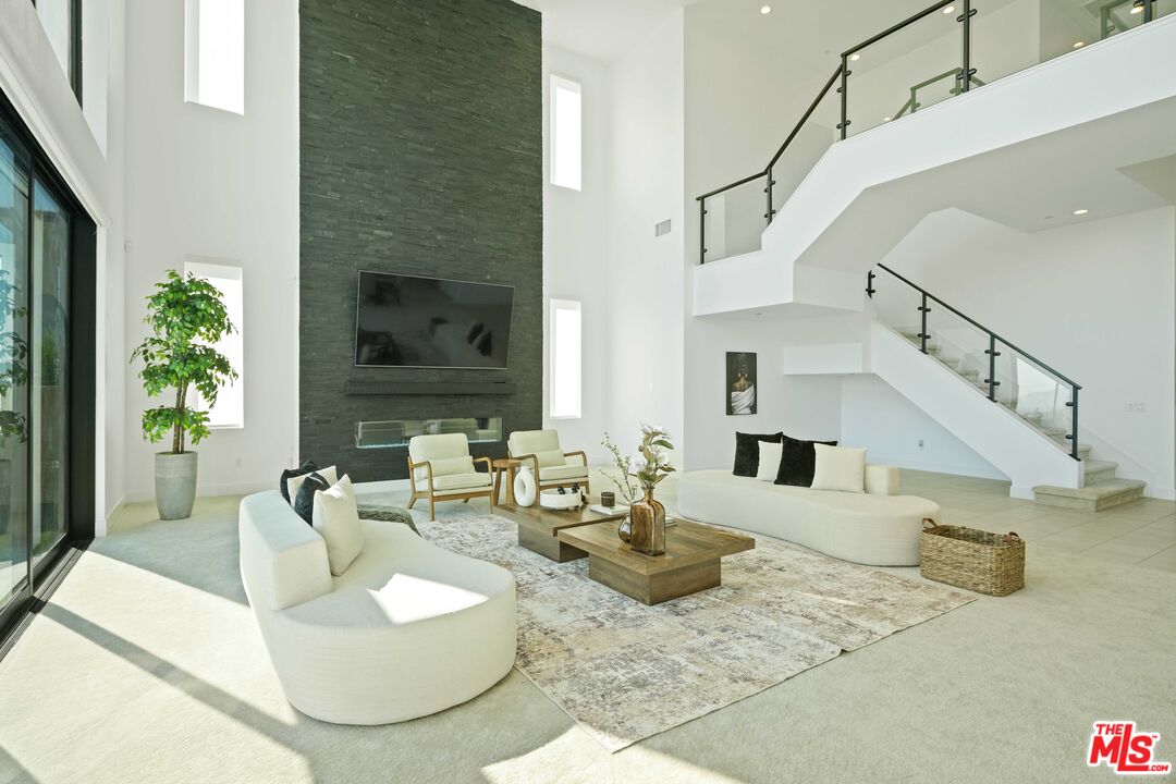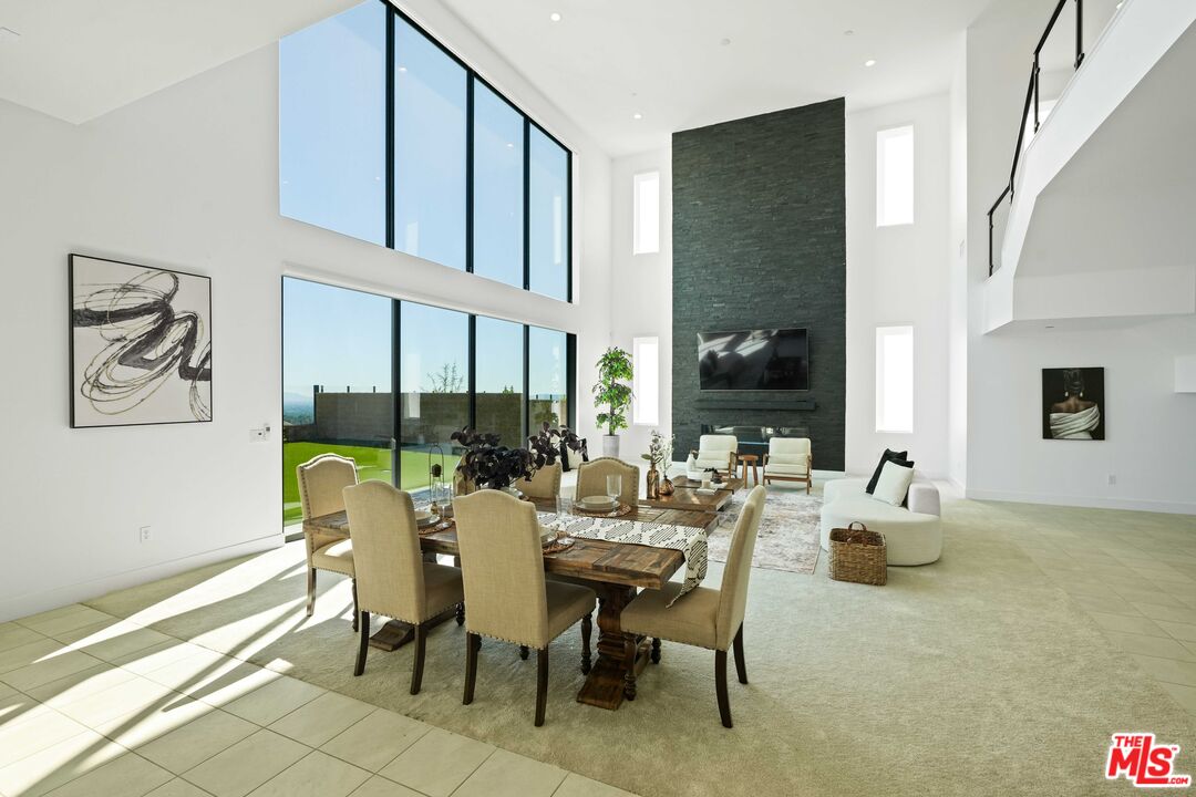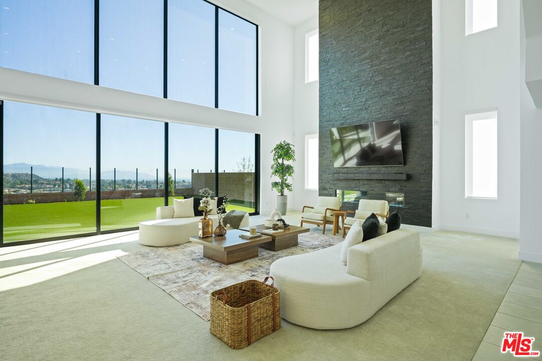 Welcome to remarkable luxury two-story residence nestled in the prestigious guard-gated Westcliffe community of Porter Ranch. This architectural masterpiece seamlessly blends practicality with timeless elegance, offering breathtaking panoramic views from every levelcaptivating from sunrise to sunset. The home's grand open-concept design is highlighted by soaring ceilings over 20 feet high and expansive windows that flood the interior with natural light while framing stunning vistas. Designed with the highest level of craftsmanship and care, this home delivers an unrivaled living experience. The main level features a private en-suite guest bedroom, a dedicated home office, and a stylish powder room. The gourmet kitchen is a chef's dream, equipped with a 48" Sub-Zero refrigerator, upgraded Wolf appliances, Quartz countertops, a waterfall island, walk-in pantry, and a designer tile backsplash.The kitchen opens to an elegantly designed covered patio, offering a seamless indoor-outdoor flow that is ideal for sophisticated entertaining and relaxed everyday living. The spacious living room is anchored by a sleek, upgraded linear fireplace with black tile detailing, creating a sophisticated focal point. Smart home features include automated window coverings, paid-off solar panels, and energy-efficient double-pane windows. A versatile upstairs loft offers the perfect space for relaxation or entertainment. The expansive primary suite provides a private retreat complete with a romantic sitting area, surround sound system, and a covered balcony showcasing unobstructed panoramic views.Enjoy the beautifully landscaped backyard and brand-new turf, perfectly designed to showcase the stunning panoramic views. Additional highlights include a dramatic glass stair handrail, beautifully curated designer finishes, and high-end smart home automation throughout. Ideally located in the North Valley, this home is just minutes from award-winning schools such as Porter Ranch Community School (K8) and Sierra Canyon, upscale shopping and dining at The Vineyards, the new 50-acre Porter Ranch Community Park, and offers convenient access to the 118 freeway. This residence is the ultimate blend of luxury, innovation, and location in one of the San Fernando Valley's most coveted neighborhoods.
