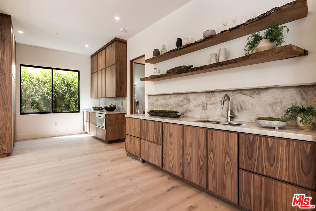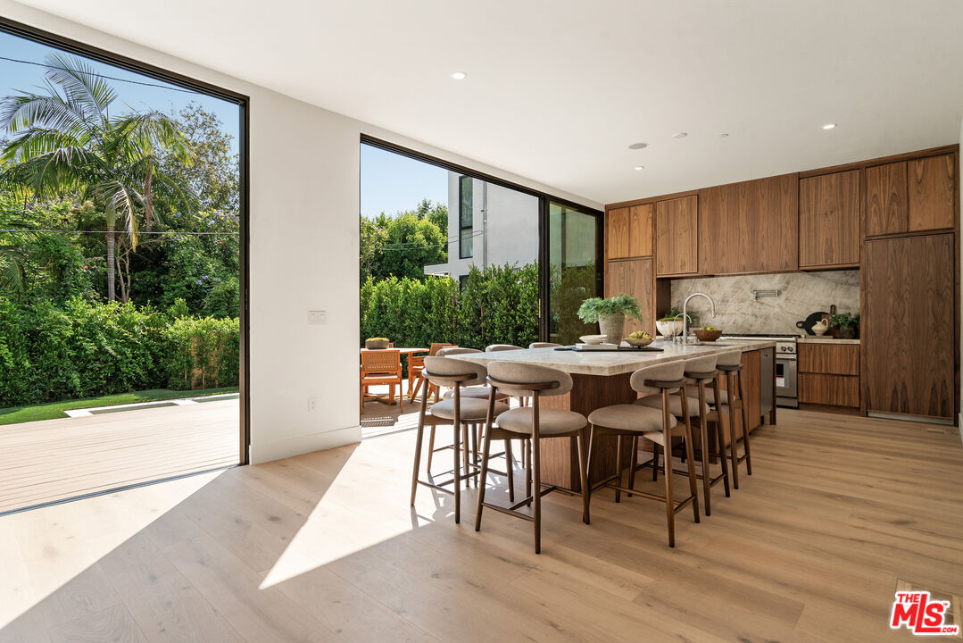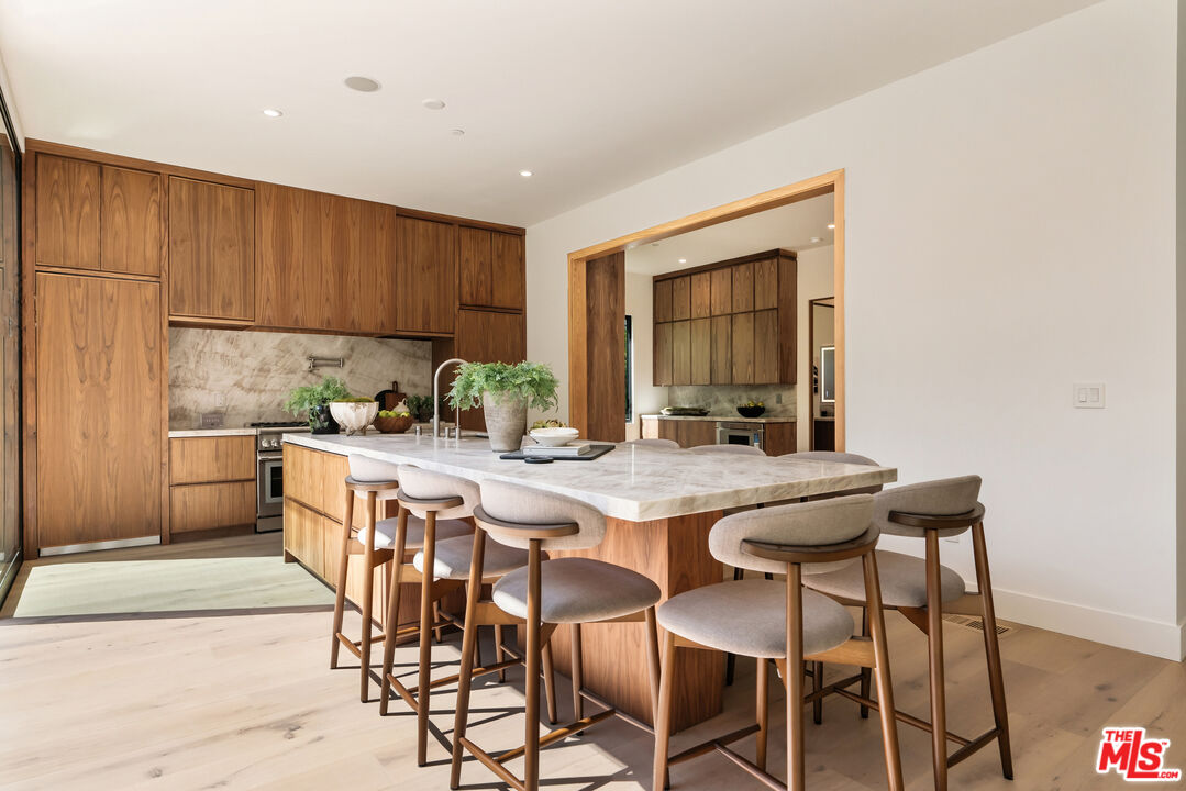 New Construction | Architectural Luxury in Brentwood!!! A masterful blend of Organic Modern and Mediterranean design, this newly built Brentwood estate redefines architectural sophistication. Behind private gates, the 6-bedroom, 5-bath residence showcases a seamless fusion of European warmth and contemporary elegance across its meticulously curated spaces.An 11-foot custom oak pivot door welcomes you into a soaring double-height foyer bathed in natural light from oversized skylights. Glass railings trace a sculptural floating staircase, while LED wall accents guide the eye toward tranquil backyard vistas. The expansive open-concept living area transitions effortlessly into a chef's kitchen featuring push-to-open walnut cabinetry, leathered Taj Mahal quartzite countertops, and an oversized island seating eight. A secondary prep kitchen adds convenience and sophistication with a wet bar, pantry, beverage refrigerator, and built-in microwaveideal for entertaining or multi-generational living. Wide-plank oak flooring grounds the main level, while natural limestone elevates each bath with timeless appeal. Dual 20-foot sliding doors open to a private resort settingcomplete with a deck, outdoor kitchen, shimmering pool, and spa. The motor court accommodates four vehicles, complemented by a two-car garage with EV-ready wiring. Two main-level bedrooms provide flexibility for guests or can be transformed into a theater, gym, or home office. Upstairs, the primary suite is a true sanctuary, offering a spa-inspired bath, custom walk-in closet, and a private balcony overlooking lush landscaping. Four additional bedrooms, three baths, and 700 square feet of terrace space complete the second level. Crowning the residence is a 2,000-square-foot rooftop deck capturing sweeping views from the Santa Monica Mountains to Downtown Los Angeles perfect for sunset gatherings or outdoor cinema experiences. This smart home is fully wired with Cat 6 technology, whole-house audio, surround sound, and multi-zone climate control, ensuring seamless modern living.Just moments from Brentwood's premier dining, boutique shopping, and the renowned farmers market. This estate is an extraordinary retreat for elevated California living!