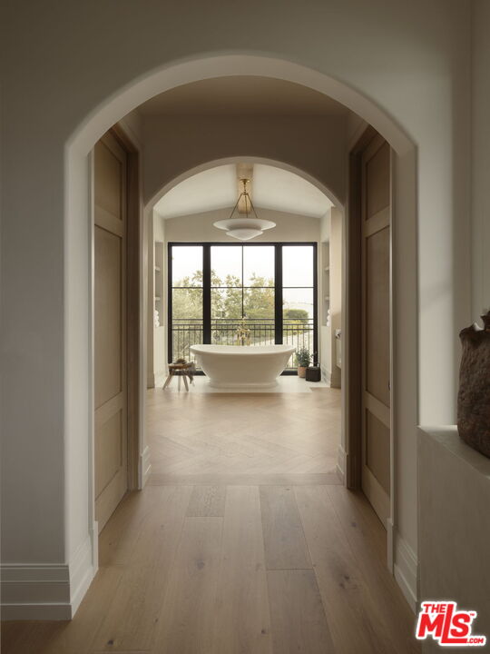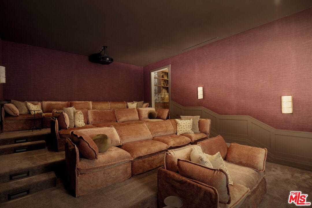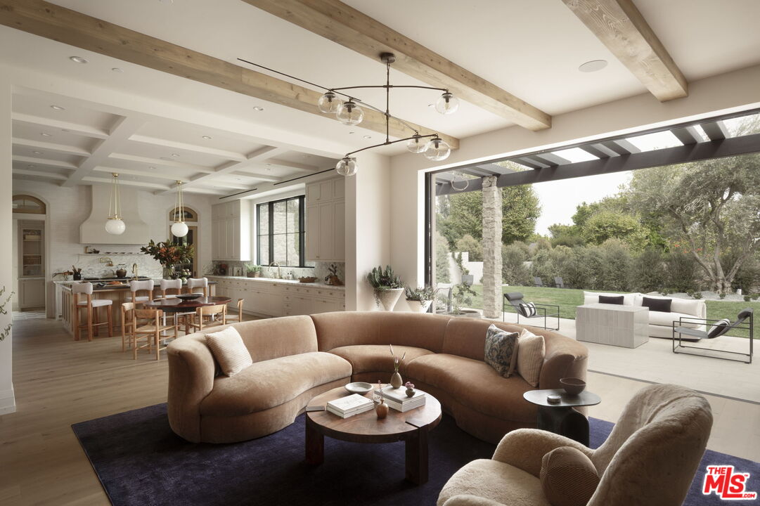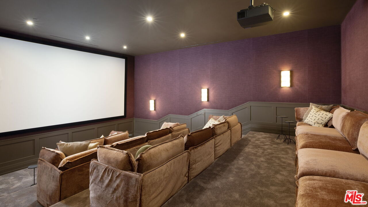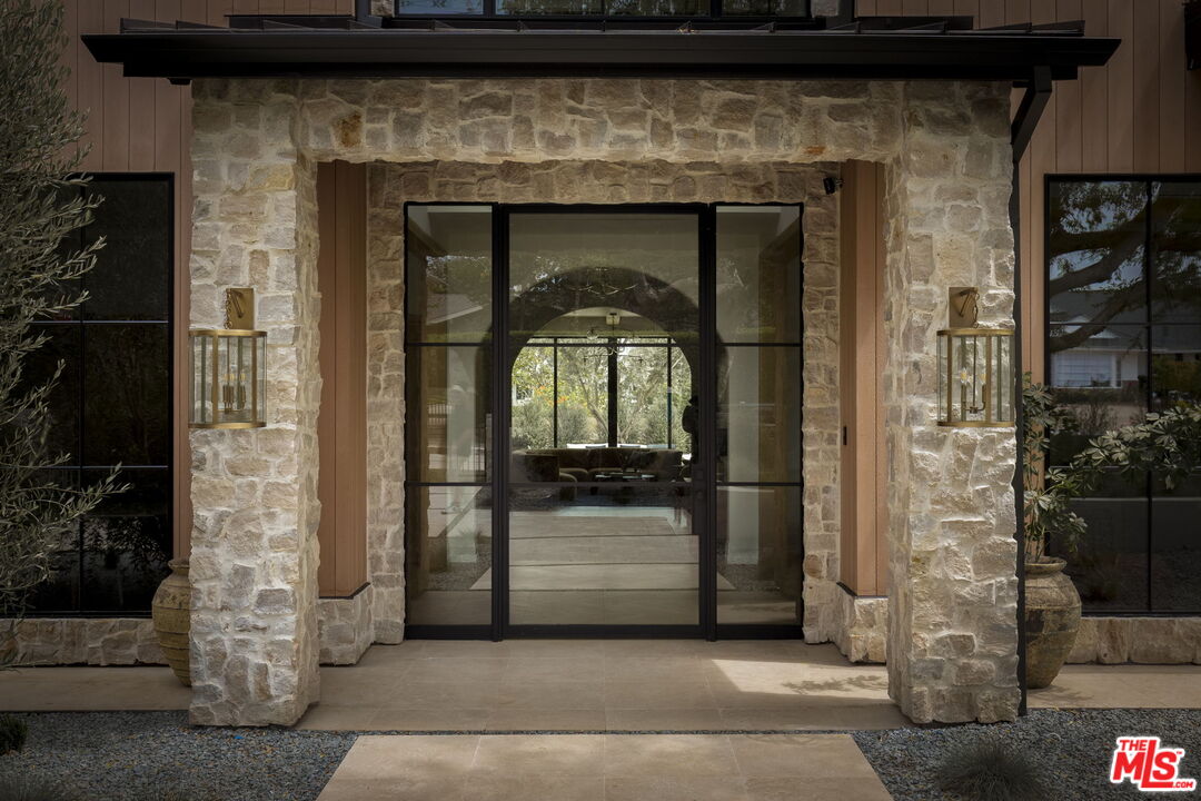 Mediterranean charm meets refined European elegance in this brand-new construction, 6-bedroom plus office, 9-bath, 10,100 sq ft residence set on a 14,143 sq ft corner lot. Heritage olive trees, vintage ceramic pots, and lush Mediterranean-inspired gardens frame a tumbled natural stone facade accented with fire-rated Acre siding that blends durability with timeless appeal. Step inside to discover interiors that celebrate artisanal craftsmanship and understated luxury. Solid white oak floors flow seamlessly throughout, complemented by intricate custom wood moldings and millwork that bring depth and warmth to every room. A curated selection of handpicked designer finishes lends effortless sophistication. The chef's kitchen features custom marble countertops sourced and designed with inspiration from classic French ateliers, paired with European checkered flooring that continues into the hidden butler's pantry. Formal living and dining rooms, a family room, and multiple entertaining spaces connect effortlessly to the resort-style backyard. Outdoors, a shimmering pool and spa with checkered stone waterline tiles set the tone for a luxurious living experience. An outdoor kitchen featuring an Alfresco pizza oven, a sculptural fire pit, and multiple terraces with panoramic canyon views extends the living space beyond the interior. The primary suite offers a tranquil escape beneath vaulted white oak ceilings, complete with dual walk-in closets, a private morning bar, and a spa-like bath featuring Waterworks fixtures and a Hydro Systems soaking tub . Additional amenities include a moody speakeasy bar, a 1,657-bottle refrigerated wine room, a state-of-the-art theater, and a wellness wing with a gym, cold plunge, sauna, steam room, and private massage room.