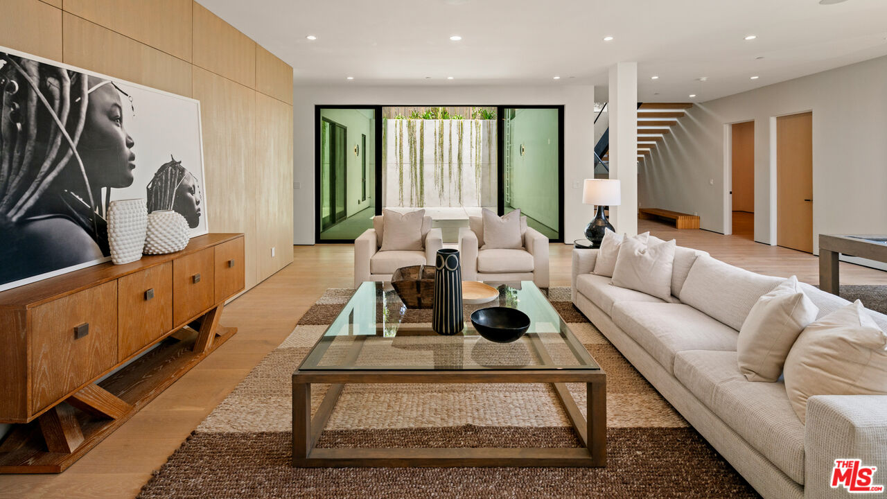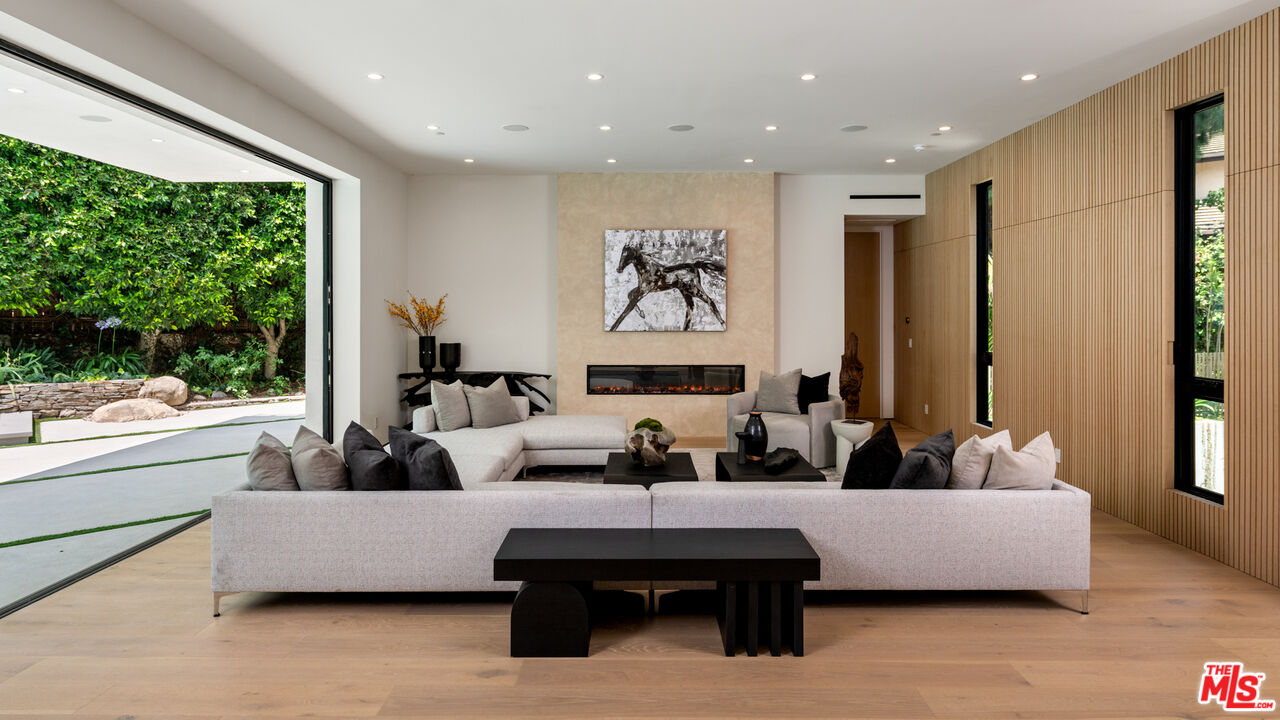 A true custom-built modern luxury retreat tucked at the end of a coveted Brentwood Grove cul-de-sac. Set on a sprawling 13,473 sq ft flat lot, this one-of-a-kind estate offers 6 bedrooms, 9 bathrooms, two offices, a home theater, gym, and more. Impeccable design meets functionality with sleek, refined finishes and a striking floating staircase that anchors the main level. The open-concept layout is filled with natural light, creating an inviting atmosphere throughout. A chef's dream kitchen boasts premium Wolf appliances and opens to a sunlit breakfast nook with panoramic views of the lush surroundings. The expansive living and dining areas, complete with a full bar, flow effortlessly into a warm family room with a fireplace. A 20-foot Fleetwood pocket door opens to a serene outdoor escape with mature trees, a sparkling pool and spa, and ample space for entertaining. The main level also includes a spacious office and a private guest suite. Upstairs, the grand primary suite features its own wing of the house with a large balcony, an oversized walk-in closet, and a spa-like bath, along with three additional junior suites. The lower level offers a second office, game room, gym, home theater, and an additional guest suite providing every amenity for luxury living and entertaining.