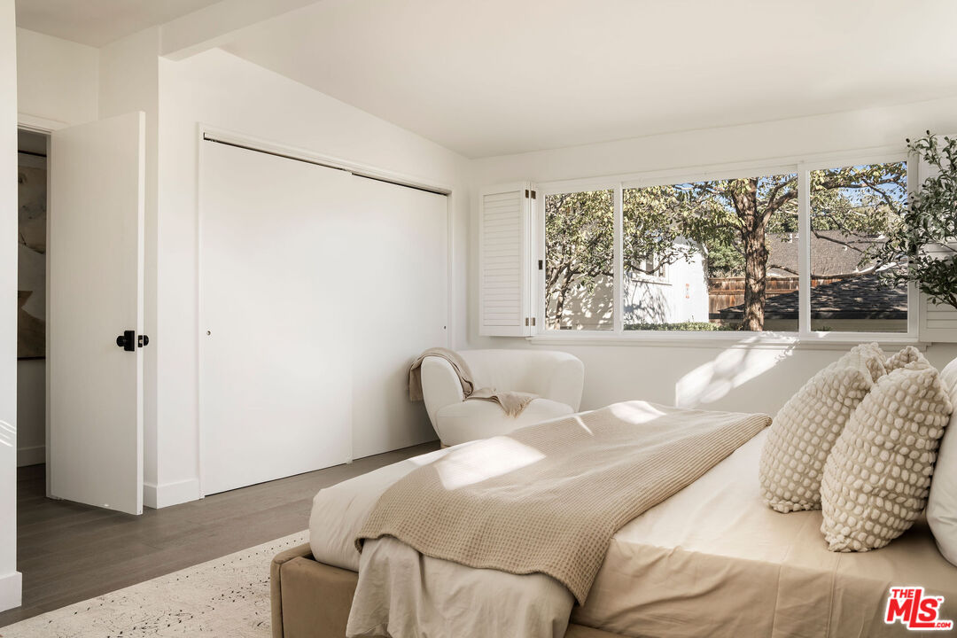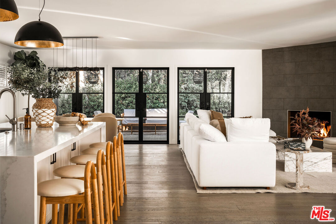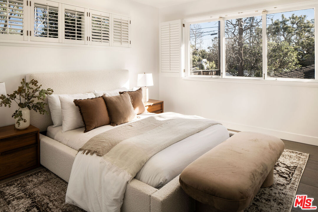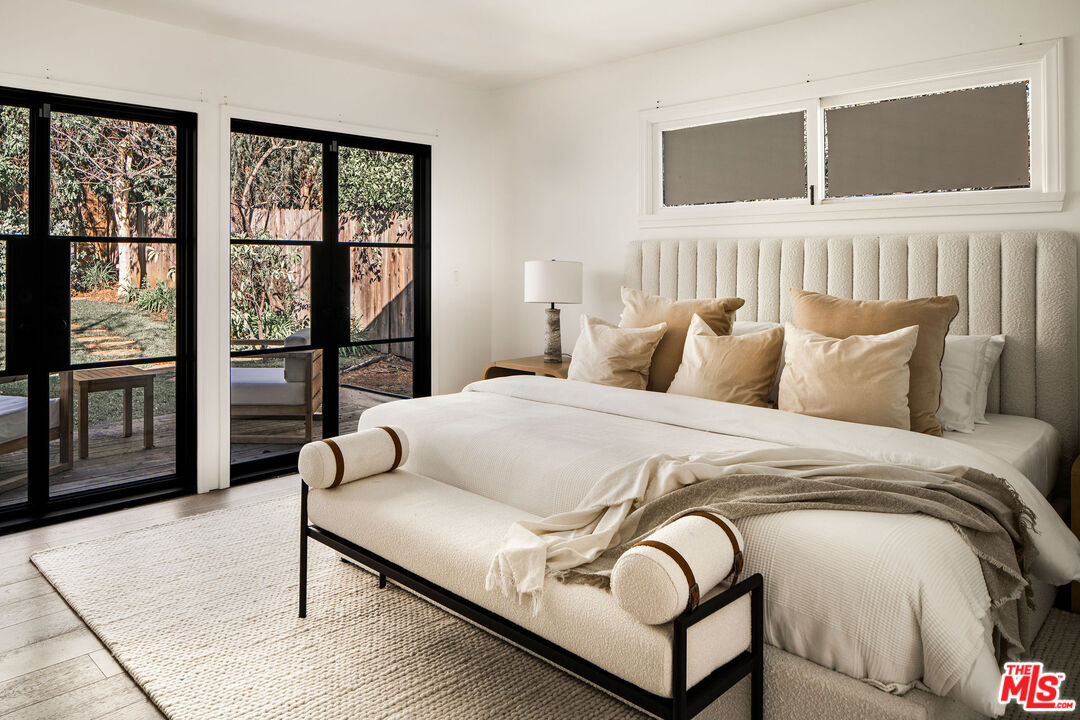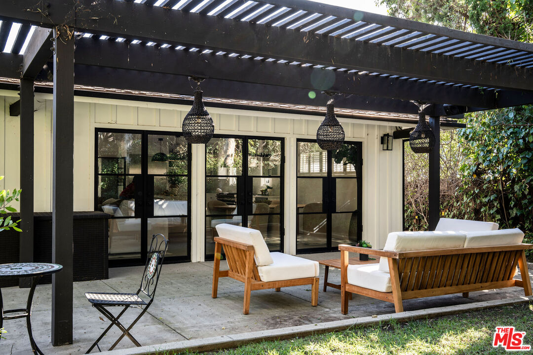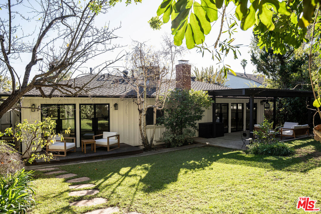Beautifully updated modern farmhouse nestled in the heart of Brentwood, perfectly positioned between Sunset Boulevard and San Vicente. Just moments from premier shopping and dining, yet tucked away on a peaceful, private street. Surrounded by mature trees and lush flower gardens, this home offers a serene retreat in the city. Inside, the open floor plan features a spacious living room with rich hardwood floors, a cozy fireplace, and expansive custom steel French doors that flood the space with natural light. The primary suite opens to a charming back garden with a deck and inviting seating area. All three bedrooms are generously sized, each with its own ensuite bath. A detached two-car garage completes this exceptional property.