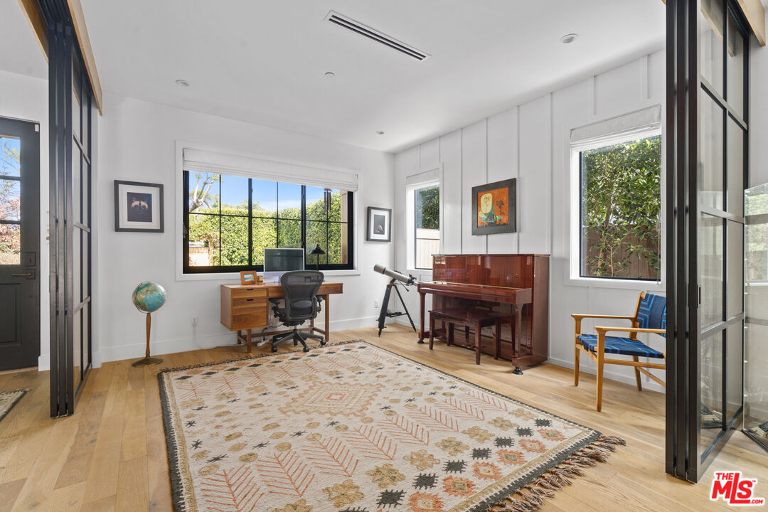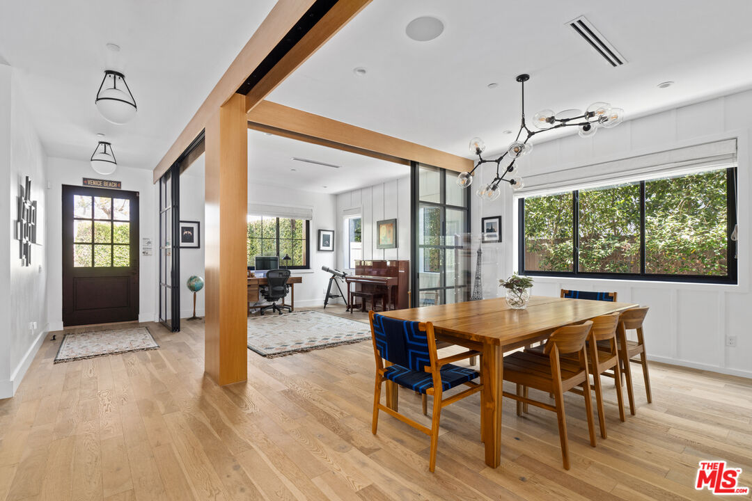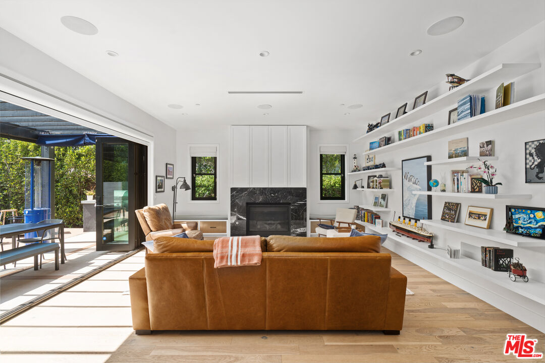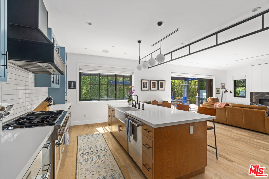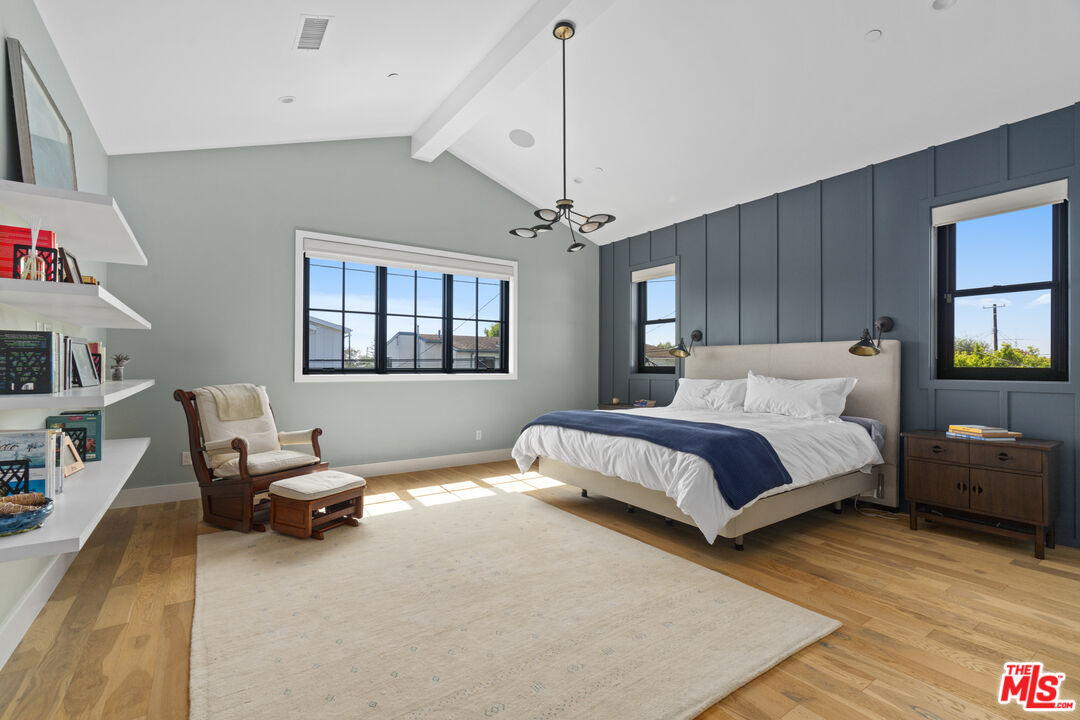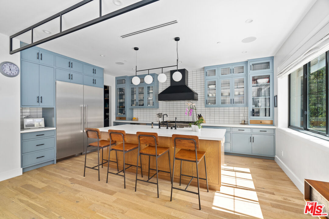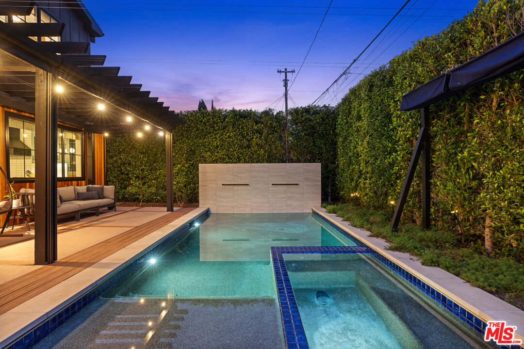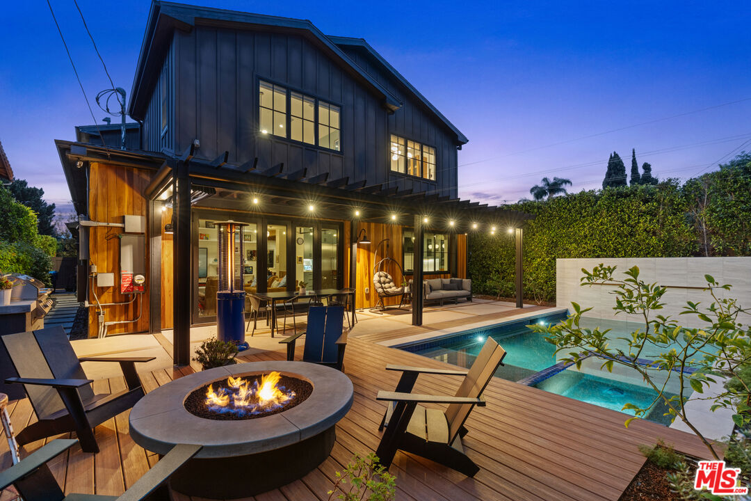 Built in 2020, this 5-bedroom, 5-bathroom residence perfectly blends modern elegance, functionality, and comfort in one of the Westside's most desirable neighborhoods. From the moment you arrive, you're welcomed by a manicured front garden, custom wood entry gate, privacy hedges, and secure gates that frame the home beautifully. A peaceful walkway through the landscaped garden leads to your front door, setting the tone for the serene lifestyle inside. Step inside to an expansive open layout filled with natural light from curated windows throughout. The downstairs bedroom has been transformed into a glass-walled office, creating a bright, inspiring space to work. The living room is anchored by custom built-ins and opens through large bifold doors to a backyard designed for California living. The chef's kitchen is a showstopper, featuring Thermador appliances, a walk-in pantry, butler's area with coffee station, and abundant storage to create an entertainer's dream. Outside, the backyard boasts a 26' x 14' swimming pool with spa, a sleek deck, multiple fire pit areas, and a full outdoor BBQ station. Owned solar panels add energy efficiency and utility savings and include a battery backup that will allow you to live off the grid for over 24 hours, find two spacious en suite guest bedrooms and the luxurious primary suite complete with a huge walk-in closet and spa-quality bath. This home offers the perfect balance of modern sophistication and family-friendly warmth, all in the heart of North Mar Vista.