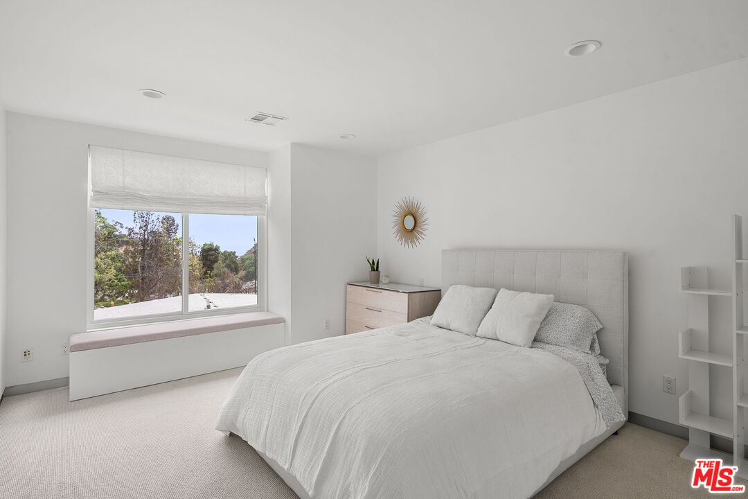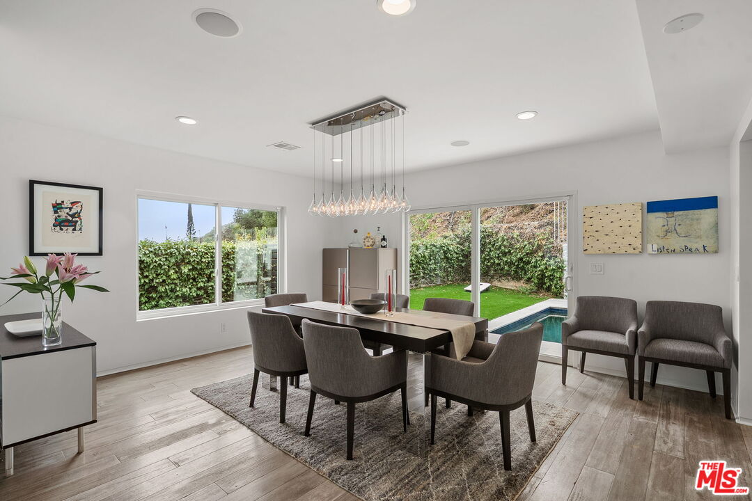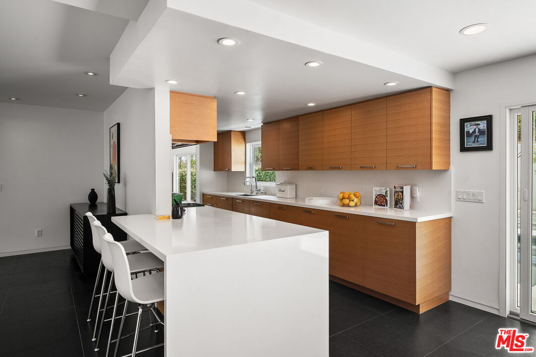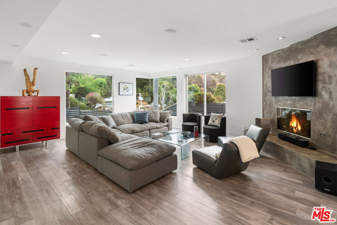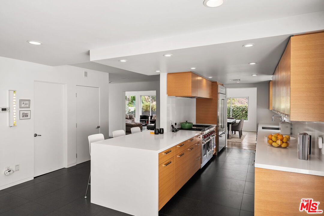 Welcome to this beautifully updated 4-bedroom, 3-bathroom contemporary residence, ideally situated in the heart of Pacific Palisades. This home combines refined modern design with a relaxed California comfort with an exceptional indoor-outdoor living experience. The property features a spacious open-concept floor plan with a casual sitting room and an expansive living room perfect for both entertaining and everyday living. The modern kitchen is appointed with high-end Wolf and Subzero appliances, clean lines, and seamless flow to the adjacent dining and living areas. Upstairs, you will enjoy partial ocean and vineyard views. The home has been fully remediated and meticulously maintained after surviving the recent wildfire, offering peace of mind alongside contemporary style. The primary suite includes custom California Closets, adding both elegance and functionality. A fully renovated garage, also outfitted with a California Closets storage systems, provides an organized and versatile space to meet a variety of needs. With four well-proportioned bedrooms and three modern baths, all with Toto toilets, this home offers flexibility and comfort for families or those seeking space to live and work. Gorgeous outdoor space with built in seating, a fire pit and a large saltwater pool sits alongside a fitted outdoor kitchen with a BBQ and Ooni Pizza oven. Do not miss this rare opportunity to own a turn-key home that balances modern amenities, resilience, and the best of Palisades living.