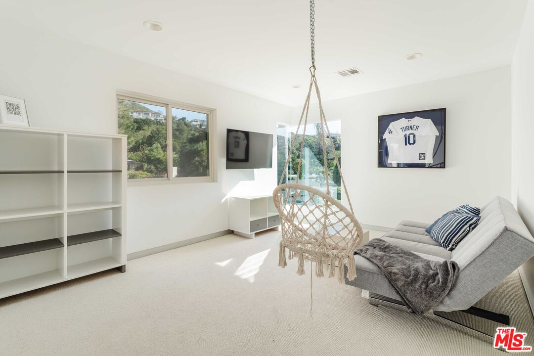 Set in the famed Marquez Knolls, this contemporary residence offers serene privacy in a truly bucolic setting. Guests are welcomed by a stately foyer with gallery walls, leading into an expansive open floorplan designed for seamless entertaining. The great room, anchored by a sophisticated fireplace and formal dining area, is bathed in natural light from large southern-facing windows. The chef's kitchen is a masterclass in design, featuring a Wolf 6-burner double oven, Sub-Zero fridge/freezer, and custom cabinetry centered around a striking waterfall countertop with informal dining. An inviting family room adjoins the kitchen, creating a perfect hub for daily life. Upstairs, the primary suite serves as a private sanctuary, detailed with custom built-ins, skylights, and a large custom closet. The spa-like ensuite bath features dual vanities and an oversized shower with a bench. Three additional bedrooms off the landing offer breathtaking canyon and ocean vistas, sharing a bright, designer bathroom with tub and shower. The resort-caliber backyard is an entertainer's dream, featuring a saltwater pool with a baja shelf, a spa, and a built-in firepit lounge. A dedicated BBQ station services the alfresco dining terrace, while a lush, fenced lawn wraps around the home. The home is completed by a 2-car garage that also functions as a gym along with a laundry area. Located in a tight-knit community known for its resilience and charm, this home offers the quintessential Palisades lifestyle.