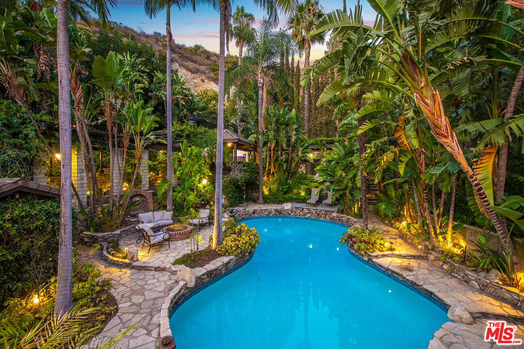 Discover your very own 1-acre private resort with this exquisite fully remodeled Mills Act 1920s Spanish-Mediterranean estate nestled at the end of a secluded cul-de-sac above Sunset Canyon. Situated on an expansive one-acre lot and offering over 4,467 sq ft of elegant living space, this Mills Act-designated historical property combines timeless architectural beauty with significant property tax savings. Step inside to find grand interiors featuring an open two-story formal entry with dramatic staircase, a step-down formal living room with a soaring barrel ceiling, a large fireplace, crown molding, and wrought iron accents throughout. Natural light floods the gourmet chef's kitchen and great room, outfitted with Viking appliances, a pro-style 6-burner range PLUS 2 built-in ovens, quartz countertops, a massive island, and rich hardwood flooring. With 5 spacious bedrooms and 4 bathrooms, the layout suits both relaxing and entertaining. The romantic primary suite is a true retreat, complete with a steam shower, an oversized soaking tub, built-in cabinetry, and French doors that open to a wrought iron balcony overlooking your lush backyard. Outside, paradise awaits. Tropical, luau-inspired landscaping surrounds a sparkling pool with serene waterfalls, a fire pit, an outdoor kitchen and a covered patio, and multiple living and dining spaces all illuminated at night to create a magical private oasis. The expansive grounds include a sundeck, sports area, a three-quarter pool bath, and a large flat pad with permitted plans for an 800 sq ft ADU. Smart home upgrades, full fire protection system that can be controlled remotely, full house back-up generator, 3 combined lots, and rare privacy make this an entertainer's dream and a one-of-a-kind opportunity. Located in the top-rated Burbank School District, with easy access to the 5 and 134 Freeways, this is more than a home it's a lifestyle. Come experience the rare beauty, charm, and serenity this estate offers!