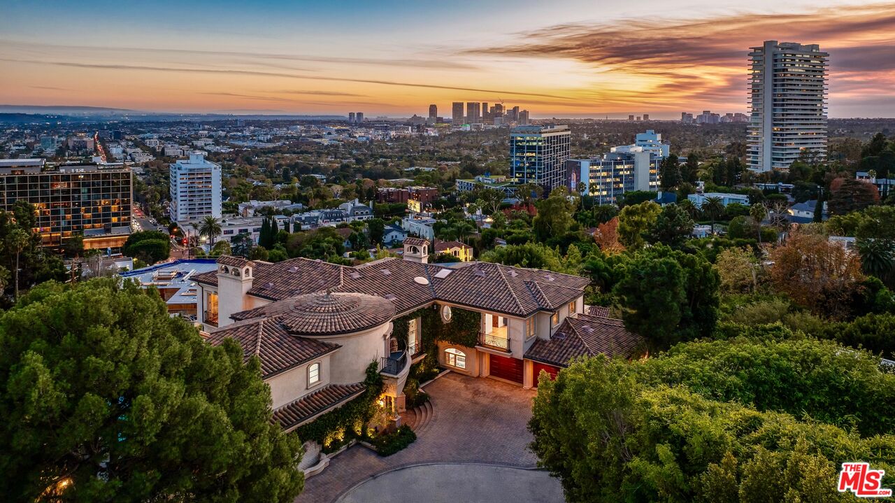 Perched atop a private cul-de-sac promontory above the Sunset Strip, this majestic estate offers castle-like grandeur, exceptional privacy, and panoramic city-to-ocean views.A dramatic flagstone motor court leads to a stately courtyard and 9,400 square feet of timeless Mediterranean design blended with modern sophistication. From the grand foyer featuring 30-foot vaulted ceilings and a sweeping staircase to the spacious living, dining, and family rooms, each space is designed to showcase breathtaking views from Downtown LA to Catalina Island. The gourmet kitchen is a chef's dream, outfitted with granite countertops, Viking appliances, Sub-Zero refrigeration, dual dishwashers, and a walk-in pantry. French doors open to a patio and BBQ area ideal for al fresco dining against the backdrop of Pacific sunsets. Upstairs, the primary suite is a private sanctuary with a sitting room, fireplace, wet bar, three Juliette balconies, and a sprawling terrace with commanding views. Dual spa-style bathrooms feature soaking tubs, steam showers, and custom walk-in closets. Four additional en-suite bedrooms offer luxury accommodations for family and guests. The lower level boasts a media room, custom wine cellar, yoga/dance studio, and a private guest suite with separate entrance. A private elevator connects all levels, and amenities include a three-car garage, ample guest parking, dual laundry rooms, and full smart home integration for effortless living. This is more than a home it's a private retreat designed for grand entertaining and serene living in one of LA's most coveted locations.
