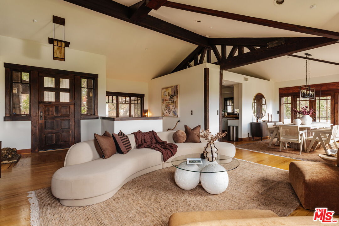 Romance in the Mountains. Perched among ancient oaks in upper Fernwood, just a mile from Topanga's village center, this timeless Arts & Crafts home rises like a handcrafted treehouse, embracing the canyon's rhythm and light. Framed in wood, stone, and glass, it captures cinematic cross-canyon vistas that shift with the day's mood. Morning mist drifts across the ridgelines, sunlight spills through beamed ceilings, and the scent of pine, lavender, and rosemary fills the air. Terraced gardens, alive with fruit trees and flowers, weave through decomposed granite paths that recall the landscapes of southern Europe. A handmade gate and wooden bridge lead to the welcoming front porch, setting the tone for the comfort and artistry within. The living and dining rooms share a glowing Batchelder-tiled fireplace, the heart of the home, where French doors and wide windows erase the line between indoors and out. Venetian plaster walls, custom lighting, and soaring beamed ceilings create warmth and grandeur, while fine woodwork and inlaid hardwood floors showcase the mark of the maker. The gourmet kitchen, fitted with Viking appliances and granite countertops, opens to a view-filled den and one of several decks. A cozy main-level office with its own balcony offers a private escape framed by canyon light. Downstairs, the romantic primary suite feels like a retreat in the treetops, with French doors opening to a secluded deck above the canyon. The luxurious bath, wrapped in windows, invites long soaks beside the garden's quiet hum. Two additional bedrooms, one with a wraparound deck, share a bright bath, while a large media room with built-in screen and surround sound doubles as a screening lounge, studio, or gym. Outside, nature flourishes. Pomegranates, blood oranges, lemons, grapes, and fragrant herbs fill the terraced gardens carved among boulders. The fenced backyard offers privacy for play, gardening, or quiet reflection. A gazebo and hidden nooks invite gatherings or moments of solitude beneath the oaks. A new roof, solar with two Tesla batteries, and thoughtful updates bring sustainability to this handcrafted haven. With a two-car garage, large driveway, generous storage, and deep caissons anchoring the home to the canyon's bedrock, comfort and stability abound. Here in Fernwood's coveted microclimate, cool coastal breezes meet warm canyon sun, a perfect balance of energy and ease. Every window reveals beauty: the sweep of Topanga State Park, the dance of light through leaves, the gentle contours of the surrounding hills. Trails, beaches, cafes, and galleries are moments away, while the valley, westside, and city remain within easy reach. More than a home, this is a place of quiet grandeur and creative soul, a handcrafted refuge where nature and design live in timeless harmony, and every day feels like a page in a story still unfolding.