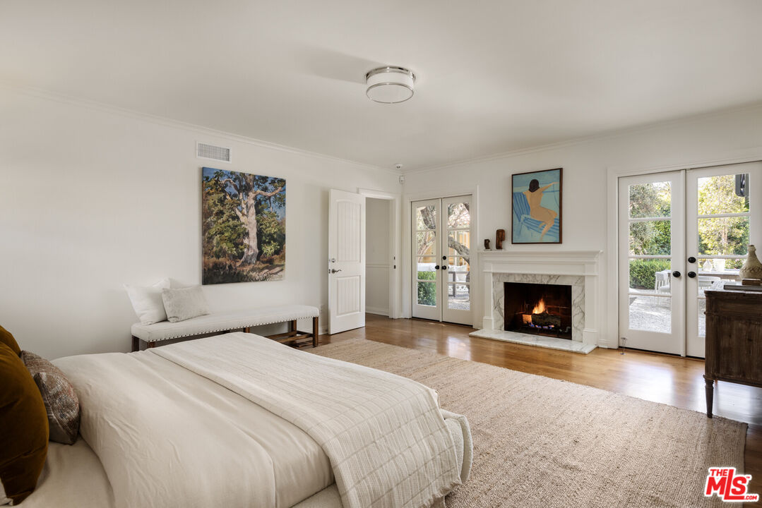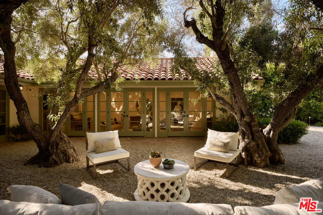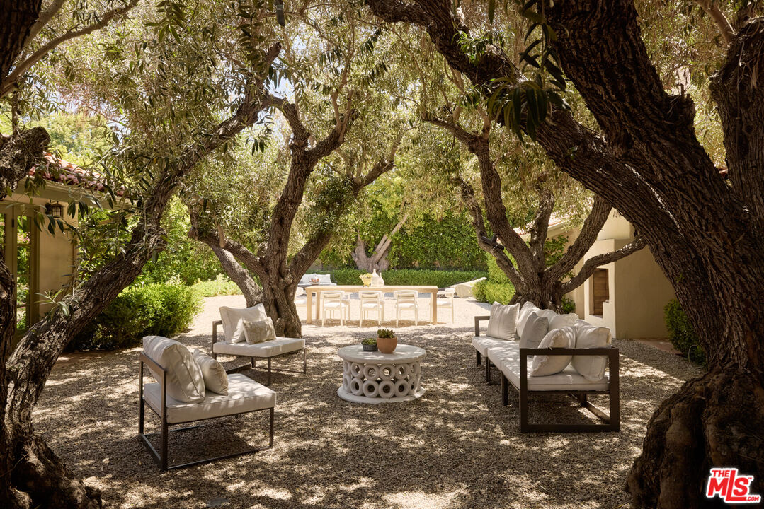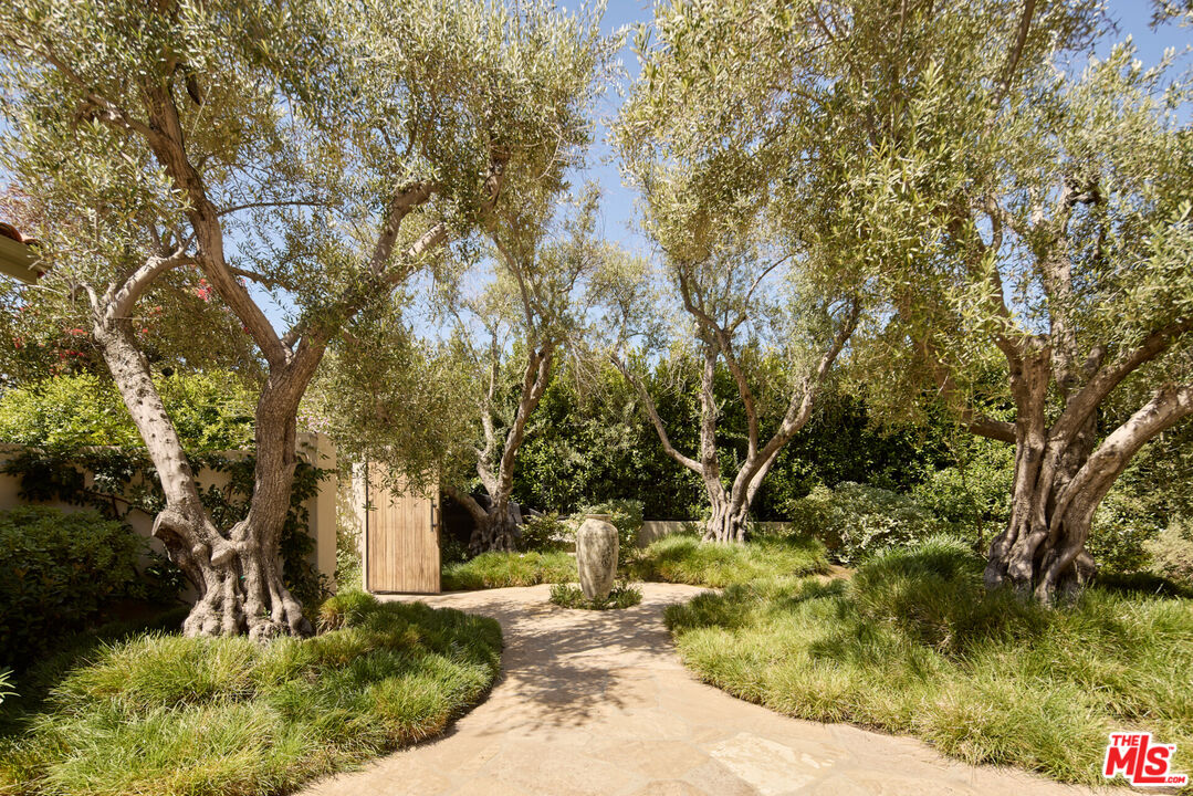 Set on a half-acre lot just moments from the Riviera Country Club, 1296 Capri Drive is a single-story estate that fuses European provenance with a thoughtful, full-scale renovation rooted in craftsmanship, indoor-outdoor flow, and connection to nature. A gated entry opens to a serene front courtyard with an outdoor fireplace, framed by mature plantings. An antique bronze and glass front door opens to expansive interiors where every room connects to the surrounding gardens. Throughout the home, old-world elements include 15th-century Italian doors from Milan, a carved Louis XV marble fireplace, and two antique French stone fountains that define the courtyard and anchor the backyard. The floor plan is organized into two distinct wings. One dedicated to the private living quarters, including the primary suite, which opens to the gardens and features dual bathrooms with a smart toilet, dry sauna, and two walk-in closets. Three additional en-suite bedrooms complete this side of the home. The opposite wing is designed for entertaining, centered around a den with a built-in bar, surround sound, antique terracotta flooring, and a climate-controlled wine wall. The main living room features a carved marble fireplace and vaulted, beamed ceilings that invite natural light throughout the day. A full wall of French doors opens to the gardens, reinforcing the seamless indoor-outdoor connection that defines the property. The kitchen was custom built by Cooper Pacific, centered around Italian feather walnut travertine counters and professional appliances that include a 64-inch Wolf range with French top and grill, two Wolf ovens (one steam), Le Cornue rotisserie, Sub-Zero refrigeration, dual Miele dishwashers, Wolf refrigerator drawers and ice maker, Irinox flash freezer and sous vide, and a built-in Natufia hydroponic grower. A walk-in pantry and separate china closet offer ample utility without compromising design. Outdoors, the landscaping is as functional as it is peaceful. Created by Garett Carlson of Landarc and Stephen Block of Inner Gardens, the grounds include a series of vegetable garden beds with lemon, orange, peach, plum, fig, mulberry, yuzu, Australian finger lime, and avocado trees. The soil and all plantings were organically treated. Additional highlights include a 2,500 bottle refrigerated wine cellar, rose-covered gazebo, built-in outdoor speakers, multiple 100-year-old Olive trees, and an area ideal for a dog run. The home features two new HVAC systems with HEPA filtration, all-new attic ducting and insulation, three water heaters (two of which are tankless), and security cameras.