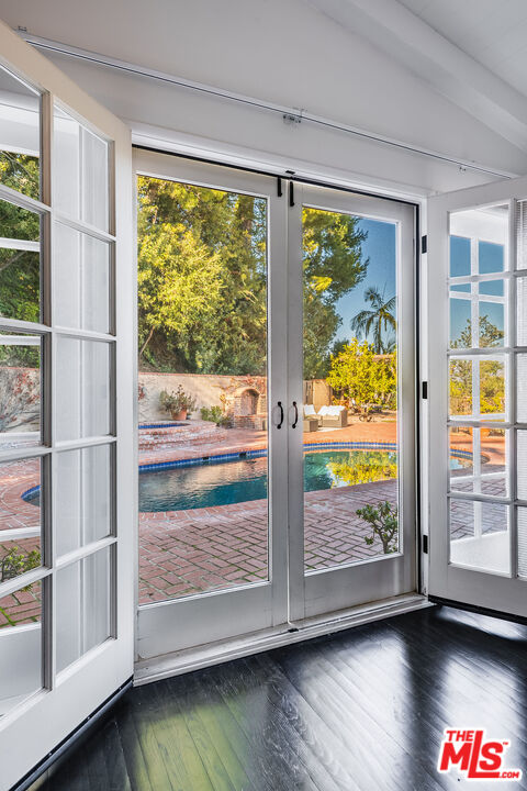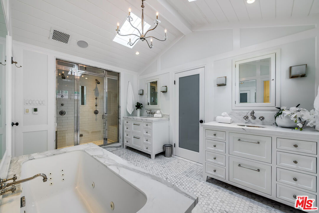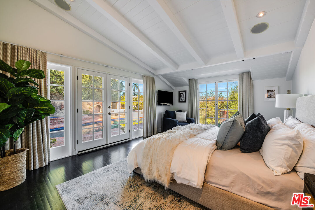 Behind gates on a quiet cul-de-sac, this refined East Coast inspired ranch commands sweeping mountain, valley, and city-light views from an exceptionally private 24,000-square-foot elevated lot. Set above the street and surrounded by beautiful greenery, the residence delivers a rare opportunity for expansive single-level living in the heart of prestigious Longridge Estates. The thoughtfully designed three-bedroom, three-bath 2500 square foot home balances timeless character with modern comfort. Rich wood floors, vaulted and beamed ceilings, and gracious proportions create a sense of classic charm throughout, while large windows, skylights and French doors draw in sunlight and frame the ever-changing views. The primary suite is a true retreat; private, serene, and beautifully appointed. French doors open to the grounds, while the spa-like bath offers a luxurious escape with heated floors, dual stone vanities, Waterworks fixtures, a deep soaking tub, and a steam shower designed for relaxation at the highest level. Additional bedrooms with floor to ceiling windows, one with en-suite bath and walk in closet, offering comfort and privacy for guests or family. Living and entertaining spaces flow effortlessly, from the elegant living room with fireplace to the oversized family room that opens to a view terrace. The massive chef's kitchen anchors the home with custom cabinetry, granite surfaces, a substantial eat-in center island, wine bar, and professional-grade appliances equally suited for everyday living or hosting on a grand scale. Outdoors, the property transforms into a private resort, featuring a sparkling pool and spa, outdoor fireplace, outdoor kitchen, pergola-covered dining patio, and outdoor shower, all positioned to take full advantage of the breathtaking vistas. A three-car garage and expansive motor court complete this exceptional offering. A rare, move-in-ready property combining privacy, views, classic elegance, and effortless single-level living in the best location Studio City has to offer.