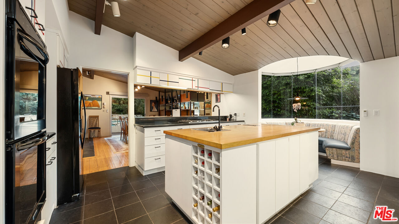 A quintessential Mid-Century Modern retreat, privately sited within the tranquil canyon setting of Brentwood's coveted Upper Mandeville Canyon, this architectural residence, originally built in 1957 and thoughtfully reimagined in collaboration with renowned architect Richard Dodson, A.I.A., embodies the era's ethos of simplicity, functionality, and harmony with nature on an 18,078 square foot lot. A dramatic post-and-beam entry introduces soaring vaulted ceilings, exposed wood structure, a sculptural stone fireplace, and expansive walls of glass, dissolving the boundary between interior and exterior while framing serene canyon vistas. Clean lines, organic materials, and an open, flowing floor plan create a timeless modernist sensibility throughout. The main living spaces unfold effortlessly, anchored by a formal dining area with a fireplace that transitions into a thoughtfully designed kitchen featuring a generous center island, sleek cabinetry, and a sun-drenched breakfast banquette, an inviting nod to classic mid-century design. The adjoining family room, complete with a third fireplace, custom built-ins, and integrated media, is enveloped in natural light and oriented toward the surrounding landscape. The primary suite serves as a private, resort-like sanctuary, with direct access to the pool and gardens and a spa-inspired bath illuminated by skylights, offering dual vanities, a soaking tub, and a frameless glass shower. An adjoining office or multi-use room enhances the suite's functionality, while two additional bedrooms and a full bath complete the main level. Upstairs, a glass-wrapped pavilion floats among the treetops, offering sweeping canyon views and remarkable versatility as an additional bedroom suite, creative studio, or media retreat, complete with an additional upstairs full bathroom. A separate library with skylight and private balcony further embraces the home's connection to light, air, and landscape. Designed for seamless indoor-outdoor living, the grounds feature a solar-heated pool, curated landscaping, and multiple spaces for relaxation and entertaining. Additional amenities include a guest powder room, dedicated laundry, and multi-zone HVAC. A rare offering that captures the spirit of mid-century modern architecture, where form meets function and every space is in dialogue with its natural surroundings, just moments from the best of the Westside.