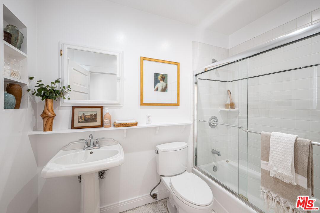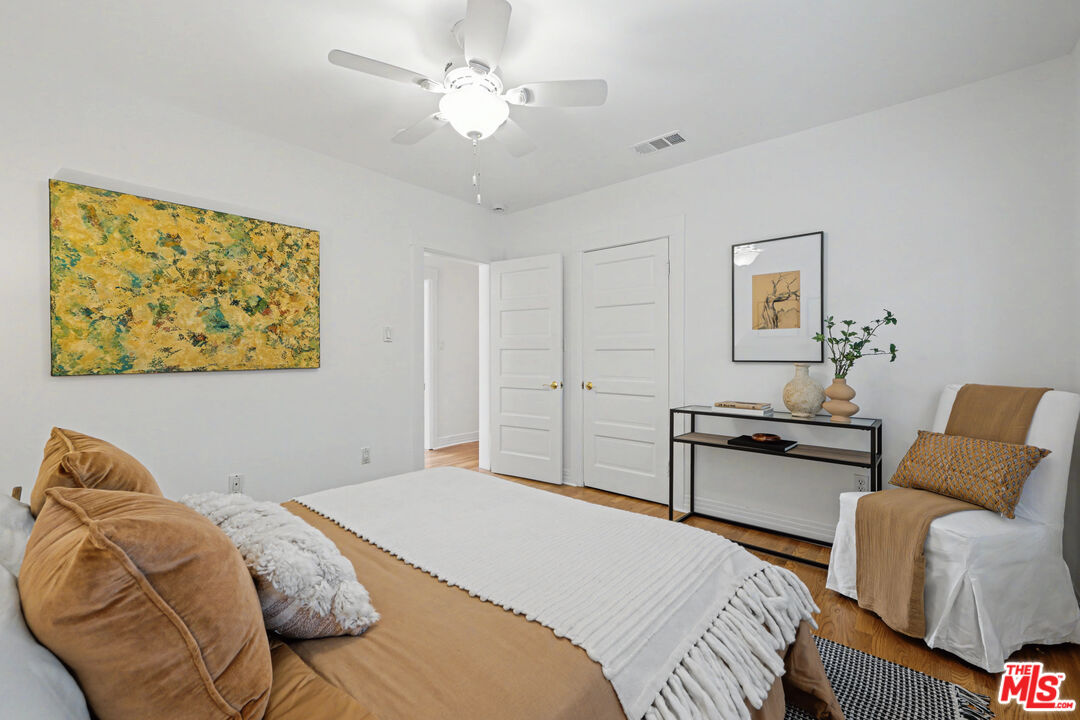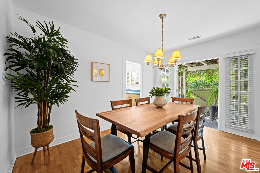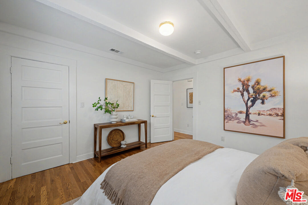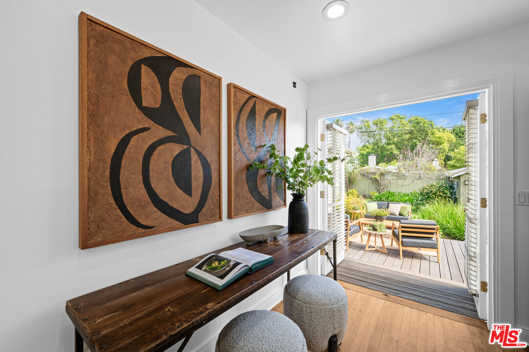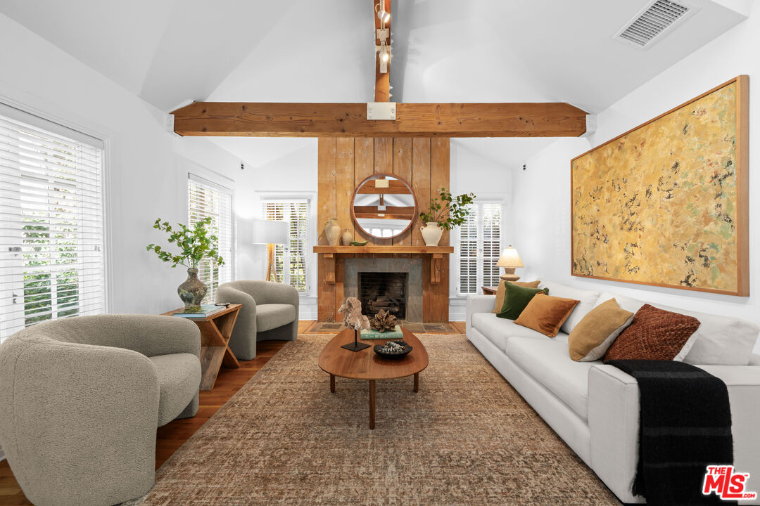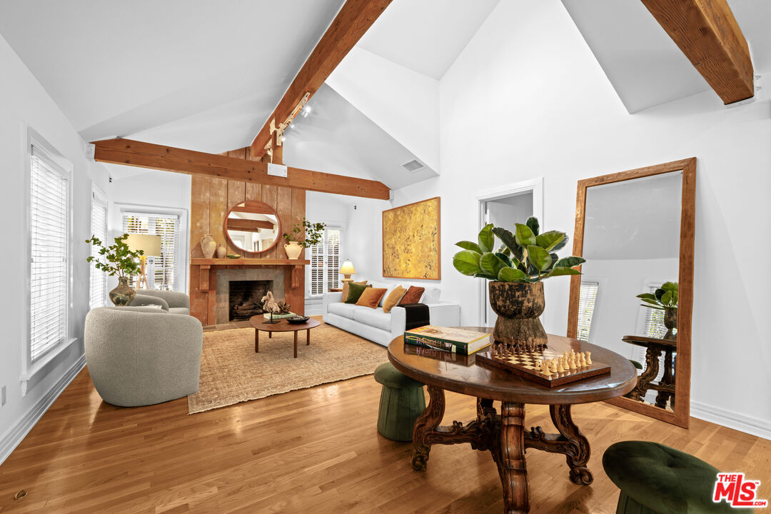 This 3-bedroom, 2-bath Colonial Revival in the Spaulding Square HPOZ is a true timeless treasure. With its distinctive gable window at the roofline, it perfectly merges classic charm with modern-day updating. The main living area is a showstopper, boasting vaulted ceilings, rustic wood beams and accents, a clerestory window, and a classic Craftsman built-in sideboard framed by a gently bowed wall of windows - a lovely 1919 bungalow detail that fills the space with natural light. The dining room flows effortlessly to a cozy side patio, while the chef's kitchen opens onto an expansive deck overlooking the lush, private backyard. The roomy primary suite offers direct deck access and is complemented by two additional bedrooms and full bath. The converted garage studio adds versatility, while a whimsical fence mural adds a playful vibe to the yard. Convenient to West Hollywood, Sunset Strip, Runyon Canyon and Hollywood, this property combines classic architecture, vibrant lifestyle, and unbeatable location.