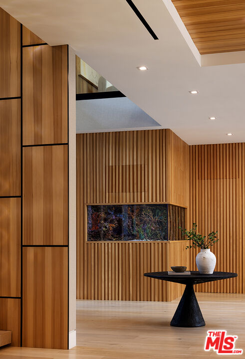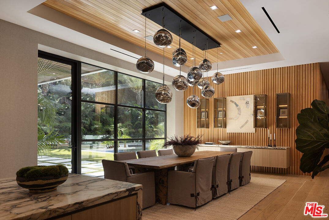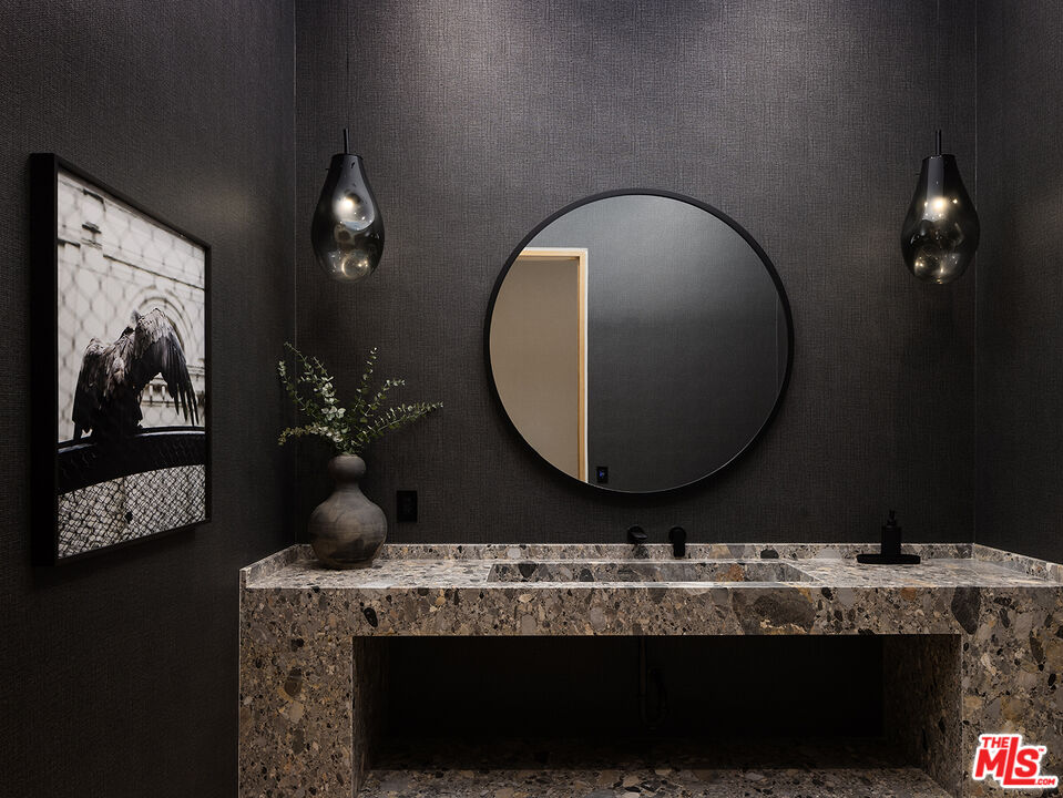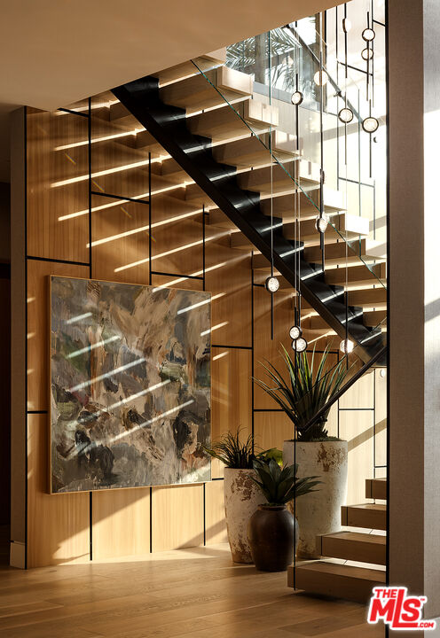 Indulge in an effortless resort-quality lifestyle from this extremely private entertainer's compound surrounded by natural greenery with sumptuous canyon views, showcasing a variety of premier amenities on 1.3 acres of mostly flat usable land. An absolute dream for recreational enthusiasts, growing families, and sports professionals alike, this exquisite haven includes a dedicated pickleball court, a professional-size basketball/sports court, and putting green, all enveloped by a flourishing leafy paradise. An expansive gated motor court provides parking for ten cars, and a striking entry calms the senses with soft organic tones complementing the lush hillside beyond. A gourmet chef's kitchen is outfitted with bookmatched stone slabs, triple waterfall island, and Miele appliances as well as a commercial-grade walk-in refrigerator in the caterer's prep galley. Both bar and wine room are showpiece standouts, and the theatre is expertly configured to match a true cinema experience. Upstairs, the primary wing alone spans 3,000 square feet and offers a lounge, two-sided fireplace, and a marvelous spa-worthy imported European stone-clad bathroom plus dual closet changing rooms, one of which features a walk-out balcony with fire pit overlooking the grounds below. Other amenities include an office, gym, sauna, and mud room. Enjoy a casual, fun-filled lifestyle at this private, family-friendly luxury resort that features a cabana with outdoor kitchen and rainfall curtain, relaxation loggia, a 16-person sunken fire pit with glass view to pool, numerous sitting areas, organic gardens, and 3,000-square-foot rooftop deck optimized for entertaining under California skies. Secluded in a park-like setting with no immediate neighbors, this ideal estate promises joyful existence and enduring, uninterrupted leisure from one of the most highly sought-after locales in the world. Welcome to the peak of contemporary luxury.