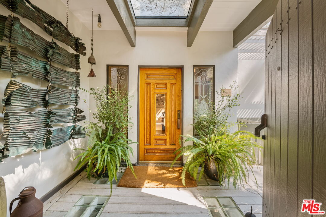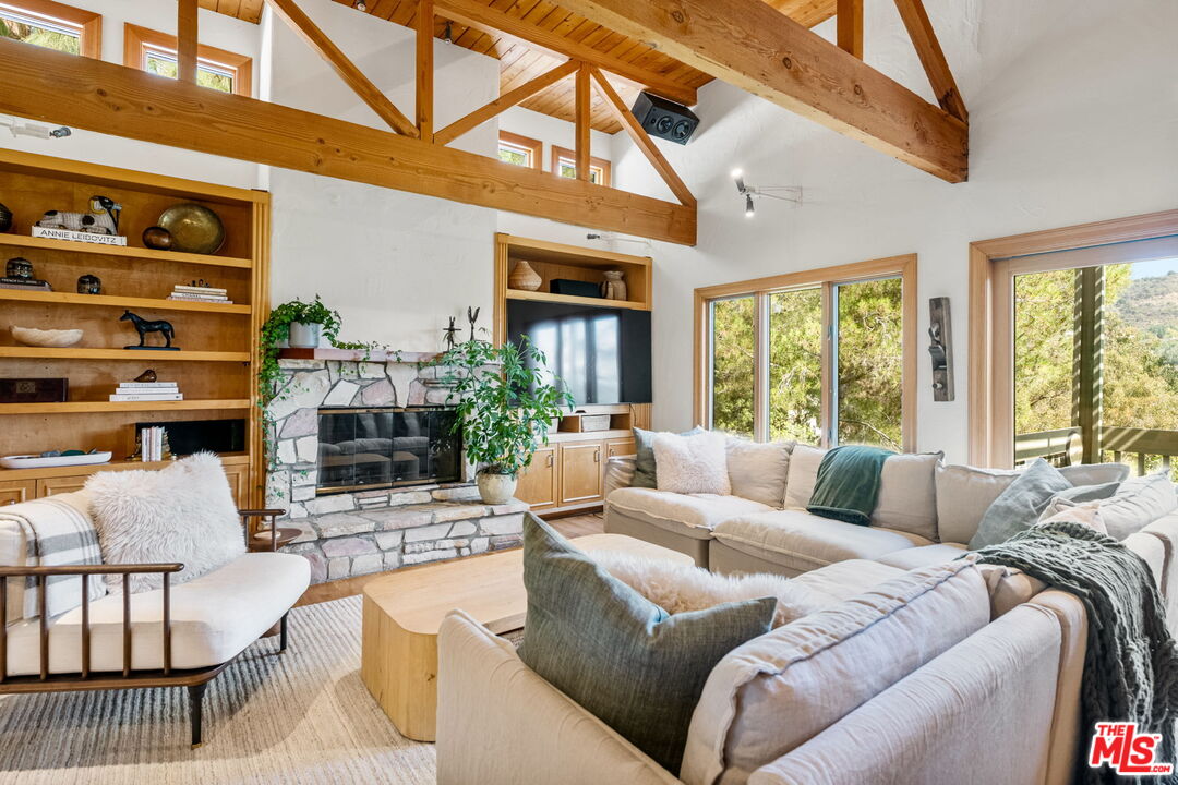 Iconic Architectural Sanctuary in Prime Lower Mandeville Canyon. Brilliant panoramic canyon vistas surround this exceptional, tri-level Matt Kivlin-designed architectural estate, set atop an expansive double lot in one of LA's most coveted enclaves. Blending iconic design with lush natural beauty, this one-of-a-kind residence offers the ultimate live-work-play lifestyle in the heart of Lower Mandeville Canyon. Soaring wood-beamed ceilings, clerestory windows, skylights, and striking fireplaces create warmth and drama throughout the top-level entertaining spaces, where the living room, dining room, family room, and chef's kitchen all flow effortlessly to scenic decks, perfect for lounging, dining, or simply soaking in the serene canyon backdrop. The oversized kitchen is a culinary dream, featuring a center island, stainless steel appliances, solid wood cabinetry, heated floors, and mosaic, granite, and marble finishes. Also on this level: a guest suite with full bath and a powder room. The middle level unfolds to reveal a stunning primary suite with fireplace, sitting area, luxe spa-inspired bath, and oversized closet, plus two guest bedrooms, a shared double-sink bath, a spacious multipurpose studio, and direct access to the spectacular pool/spa patio, grassy play area, and covered entertainment space beneath majestic pine trees. A wine cabinet and dark room add unique flexibility. A spiral staircase leads to the lower level: a bright, inspiring bonus space ideal for a gym, game room, or creative studio, framed by more verdant vistas. Direct access from the large double garage adds ease and functionality. Premium features include: heated flooring in breakfast and primary bath, surround sound inside/out, recessed lighting, custom built-ins, and sophisticated indoor-outdoor flow throughout. This is a rare opportunity to own a bold and timeless piece of architectural art in one of Brentwood's most iconic settings, where nature, design, and privacy unite in perfect harmony.