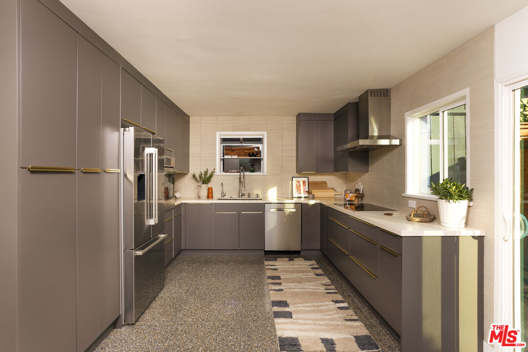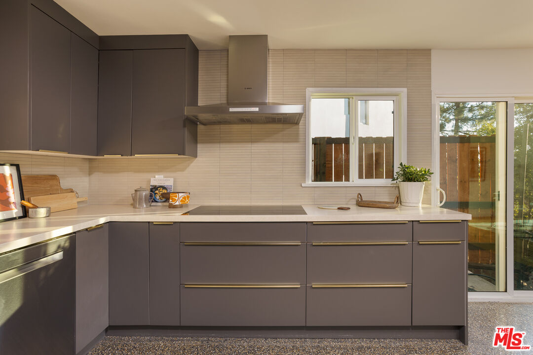 Stunning, meticulously renovated home in desirable Adams Hill welcomes you with abundant natural light and sweeping views. Double front doors open to a grand foyer with soaring 15-foot ceilings, leading into a sunken living room where expansive picture windows frame sparkling city lights and distant mountain vistas, centered around a cozy fireplace.European oak floors flow throughout the main living areas, adding warmth and timeless elegance, while rich accent walls and designer wallpaper bring bold character to the modern aesthetic. To the side, a fully renovated kitchen reveals thoughtful design and refined finishes, featuring all Bosch appliances-including a convection oven and induction cooktop-paired with terrazzo floors and Cambria quartz countertops.Straight ahead, a dedicated dining room opens through sliding glass doors to a balcony, seamlessly blending indoor and outdoor living against a backdrop of breathtaking views. Also on this level, a generously sized bedroom or family room, enjoys its own exterior entrance and sliding doors to a shared balcony sitting area, creating a private retreat with easy access to the main living space. A beautifully designed half bath completes this entry level.Upstairs, the primary suite offers a private fireplace and a luxurious en suite bathroom. Two additional bedrooms and a hallway bath complete the second floor, each space exquisitely renovated with meticulous attention to detail. Terrazzo floors extend through the bathrooms, complemented by custom cabinetry and high-end Toto bidet toilets. Every element has been carefully curated and seamlessly integrated, resulting in a sophisticated, cohesive modern design throughout.Below, a finished basement provides a versatile bonus space- ideal for a creative studio, home office, or gym. Outside, a serene sitting area with a pergola, accessible via exterior steps on both sides of the home, offers the perfect setting for al fresco dining or quiet relaxation.Not only beautiful but also highly efficient, the home features a new energy-efficient roof, new dual-pane HVAC system with heat pump, and an upgraded electrical panel with 220v circuits.Perfectly situated just moments from Adams Square and the vibrant scene along Glassell Park's Verdugo Boulevard, this home offers the ideal blend of location, design, and comfort.