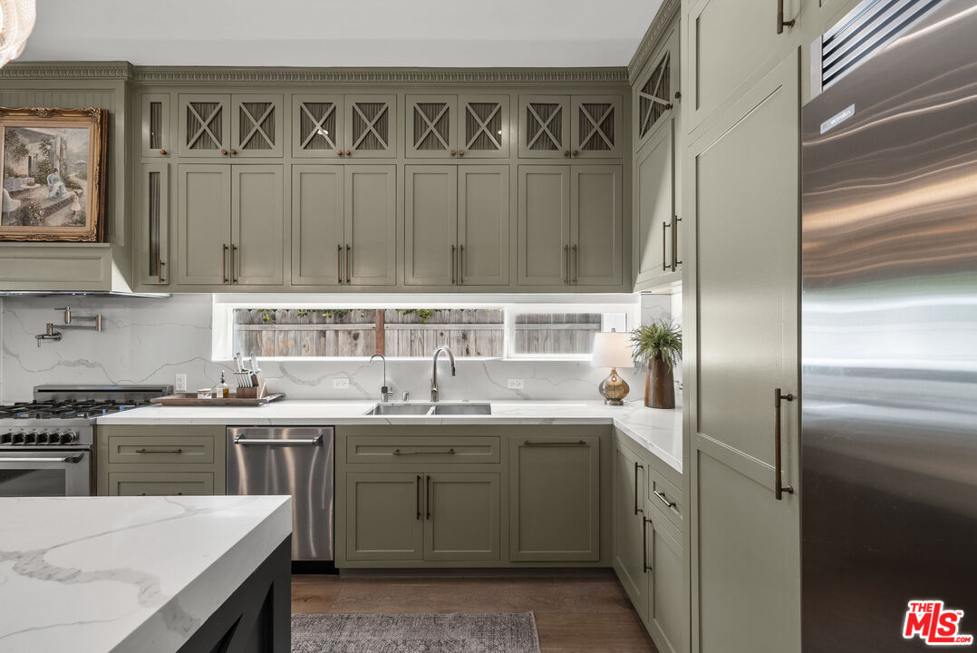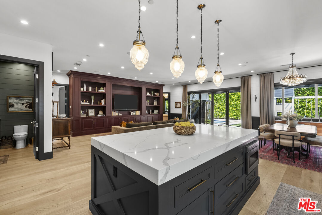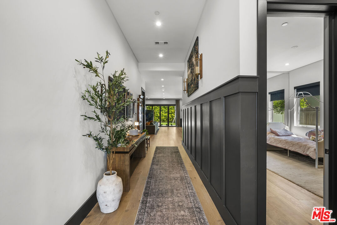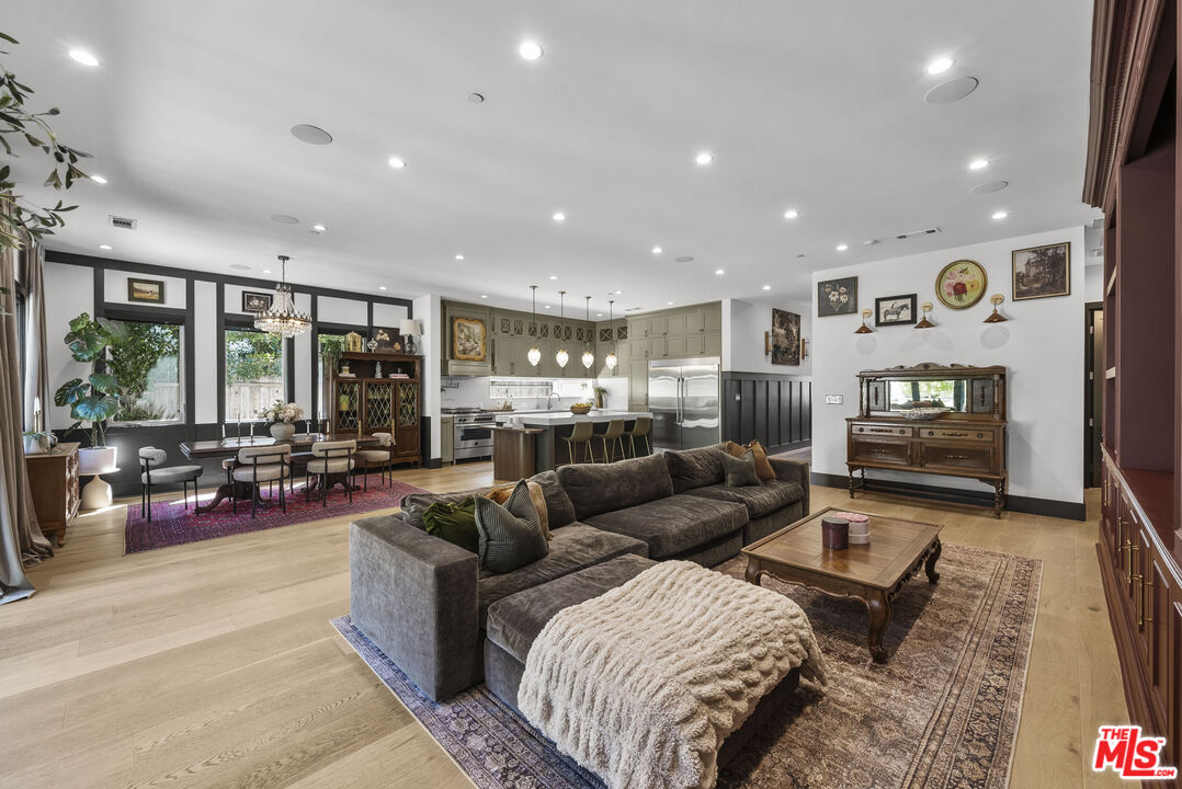 Welcome to this beautifully reimagined single-story modern farmhouse, ideally located on a quiet street in one of Sherman Oaks' most sought-after neighborhoods. Spanning approximately 2,972 square feet, this 4-bedroom, 4-bathroom residence showcases elevated design, thoughtful craftsmanship, and a seamless open-concept layout filled with natural light.The heart of the home is a stunning chef's kitchen, outfitted with top-of-the-line appliances including an oversized refrigerator/freezer, range, dishwasher, and an expansive quartz islandperfect for both everyday living and entertaining. The spacious primary suite offers a true retreat, complete with a spa-inspired bathroom and a generous walk-in closet.Designed for effortless California indoor-outdoor living, large bi-fold doors open to a private backyard oasis featuring a sparkling pool and spa, lush grassy area, and multiple spaces to relax or entertain.Additional highlights include wide-plank European oak flooring, soaring 10- to 12-foot ceilings, and a fully integrated security system with cameras. Just moments from the shops and dining along Ventura Boulevard, this exceptional home offers the perfect blend of luxury, comfort, and location.
