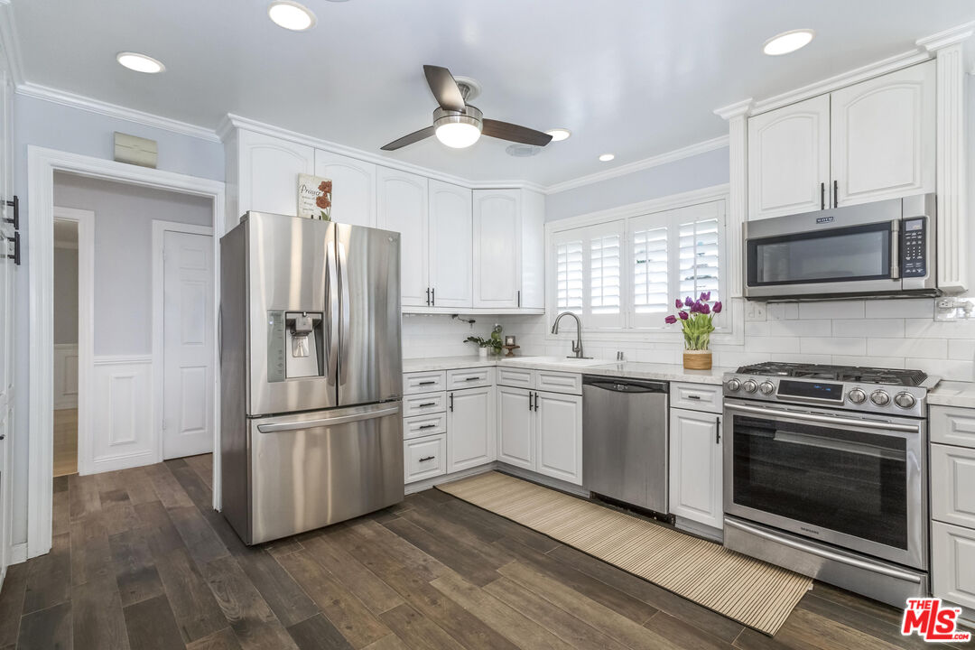Nestled within a quiet cul-de-sac in a desirable Sylmar neighborhood, 13531 Fusano Ave is a beautifully maintained home showcasing true pride of ownership on an expansive ~11,000 sq ft lot. With 1,821 sq ft of living space, this 3-bedroom, 2-bath residence offers an inviting open layout, move-in condition, and the kind of backyard potential that's getting harder and harder to find. Inside, you'll find a calming designer color palette, recessed lighting, crown molding, plantation shutters, and laminate flooring throughout. The kitchen is bright and functional, featuring a large garden bay window, updated cabinetry with under-cabinet lighting, quartz countertops, and built-in stainless steel appliances, plus a refrigerator and even a built-in television. Just off the kitchen, the formal dining room is ideal for hosting holidays, dinner parties, and everyday meals. The spacious family room is the heart of the home, highlighted by a pitched wood-beam ceiling, a cozy fireplace with built-in cabinetry, and direct access to the patio, creating effortless indoor/outdoor flow. All three bedrooms include remote-controlled ceiling fans for comfort, while the primary suite features a generous wall-to-wall closet and an en-suite bath with dual sinks. The hall bath offers a Jacuzzi tub, perfect for unwinding. Additional features include central A/C and heat, dual-pane windows, and copper plumbing. Step outside through the French doors and let your imagination run: the oversized backyard is a true standout with a massive entertainer's patio, room for play, gardening, or future expansion, plus RV access, rare and valuable bonus. Conveniently located near shopping, dining, and major freeways, this home blends peaceful living with everyday accessibility. Don't miss your chance to make it yours.