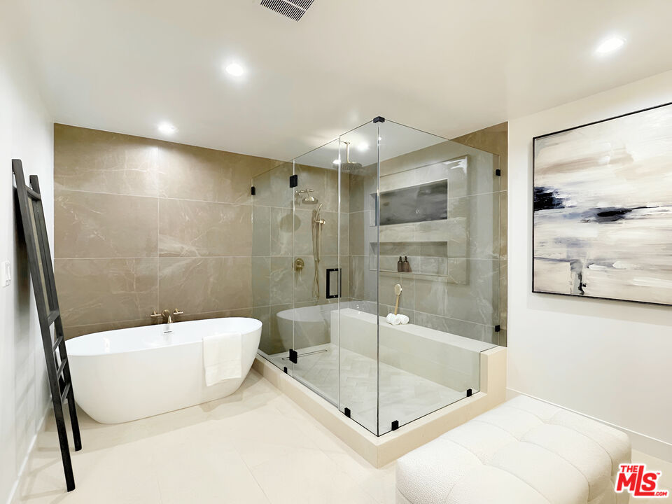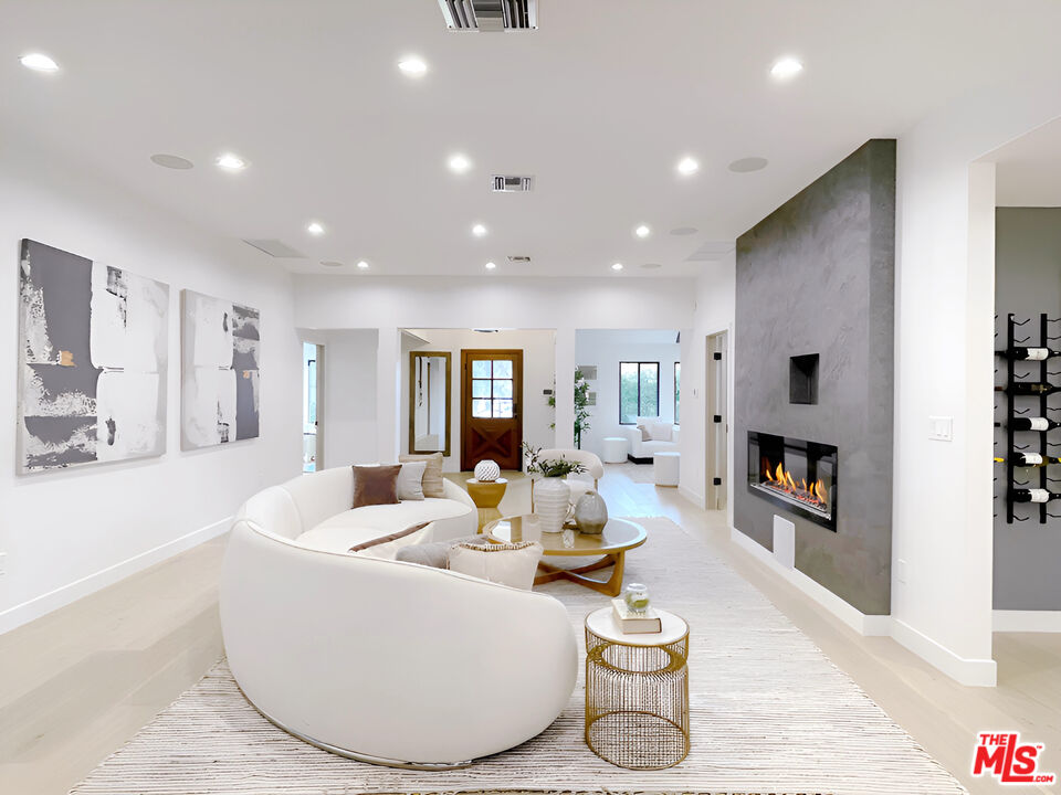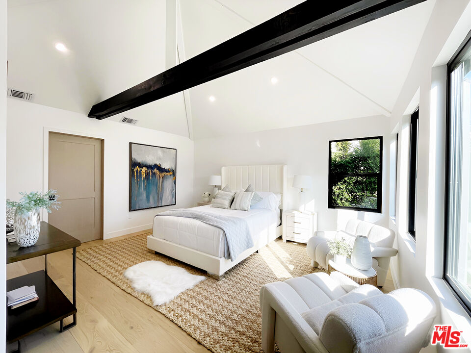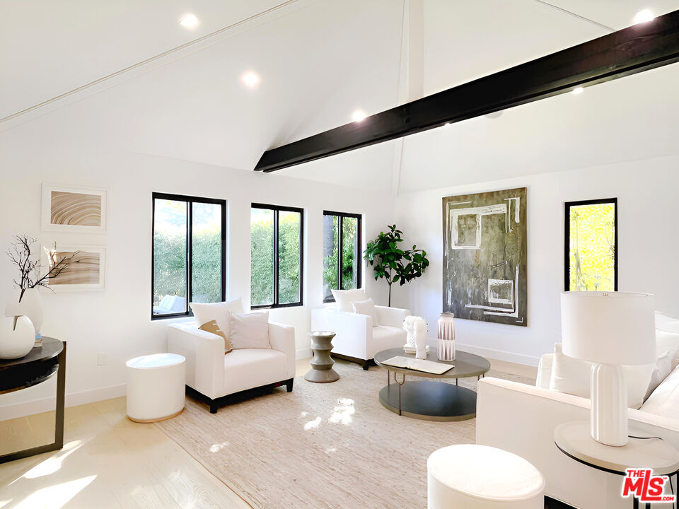 Warm sunlight filters through large windows, illuminating rich wood finishes, vaulted ceilings, and open sightlines that draw your eye from room to room. You'll notice clean lines, exposed beams, and high ceilings that lend both grandeur and tranquility. In the day, light pours across surfaces, and in evenings, the interiors take on a quietly intimate glow. The home's thoughtful layout offers true privacyeach bedroom is designed with no shared walls, and every window frames greenery rather than neighbors. The chef's kitchen impresses with high-end Thermador appliances, a professional 6-burner range, wine fridge, and an oversized island that anchors the space for gathering and connection. Outdoors, a gated terrace with built-in grill and generous prep counters opens to a spacious backyard and welcoming front lawnan ideal setting for entertaining or quiet retreat. The property also offers the opportunity to design and build a custom pool and spa, extending the home's resort-like ambiance. The overall effect is of a home that breathesfunctional, elegant, and quietly luxurious, offering both openness and seclusion just moments from everyday necessities, local parks, and award-winning schools.