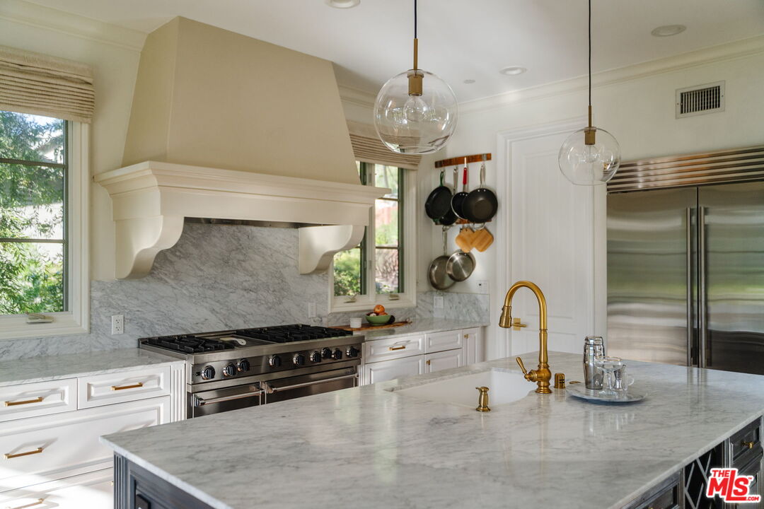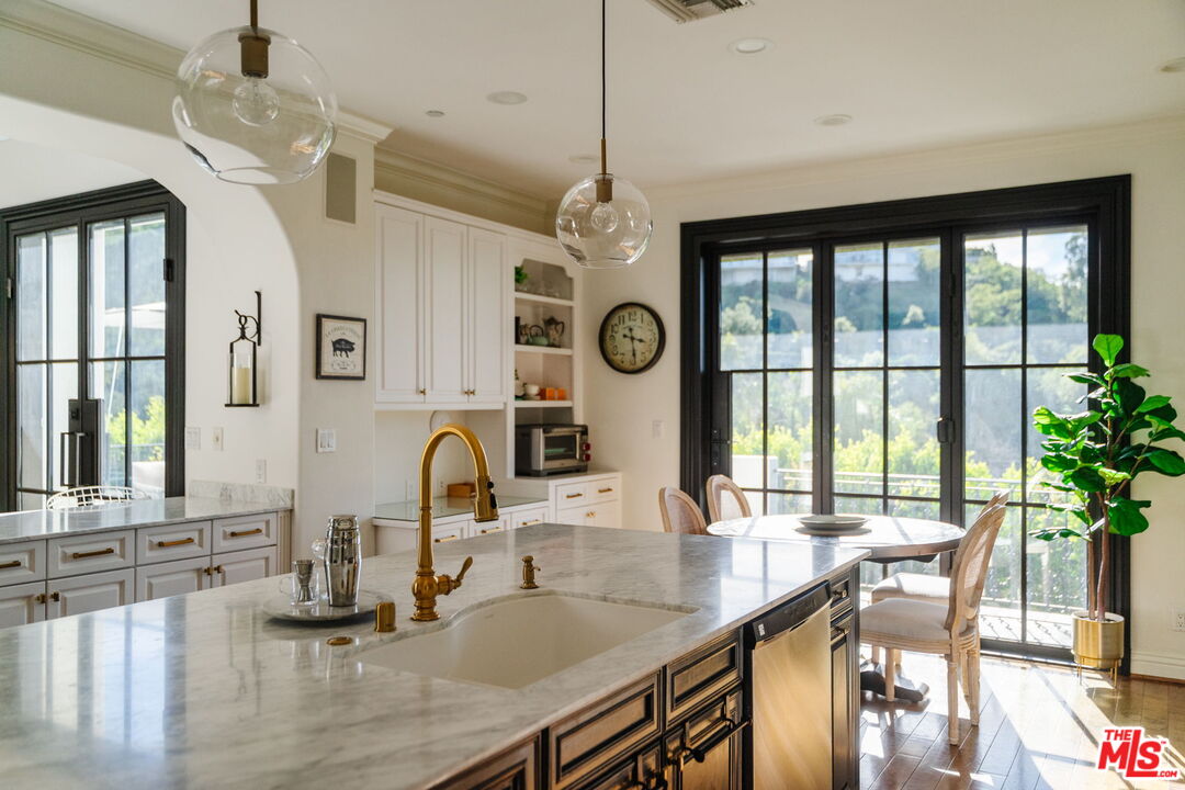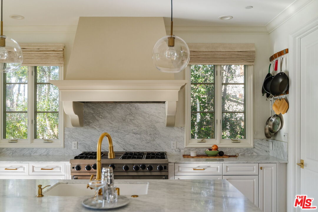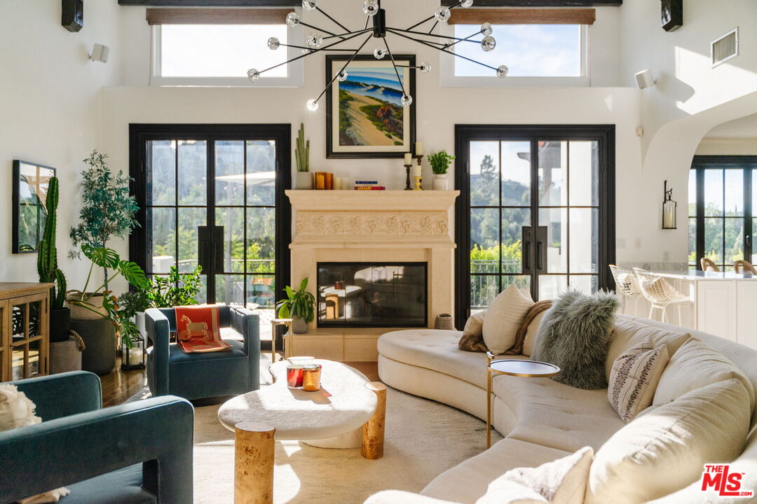 Welcome to 13551 Cheltenham Drive. Inspired by a refined Ojai Spanish aesthetic, this custom-built 2003 residence blends timeless elegance with white stucco walls, a red-clay tile roof, wrought-iron detailing, and graceful arched doorways, all bathed in extraordinary natural light. Spanning 3,582 square feet, the 4-bedroom, 4-bath home also offers approximately 700 square feet of additional storage and an expansive three-car garage with direct access, set against sweeping valley views with exceptional privacy. An immediate sense of calm greets you upon entering the grand great room, where soaring ceilings, exposed wood beams, and an open-concept design seamlessly connect the living spaces. The thoughtfully updated kitchen flows effortlessly into the dining area and a charming library nook, creating an inviting atmosphere for both everyday living and entertaining. Recent kitchen and bathroom renovations introduce refined finishes throughout, highlighted by a brand-new primary bathroom suite and an exceptional walk-in closet designed as a true retreat. Indoor-outdoor living unfolds with ease, as patios open to serene outdoor spaces complete with a hot tub and sauna perfect for relaxing while taking in the tranquil surroundings. A rare offering that artfully combines architectural character, modern enhancements, breathtaking views, and complete privacy in the heart of Sherman Oaks.