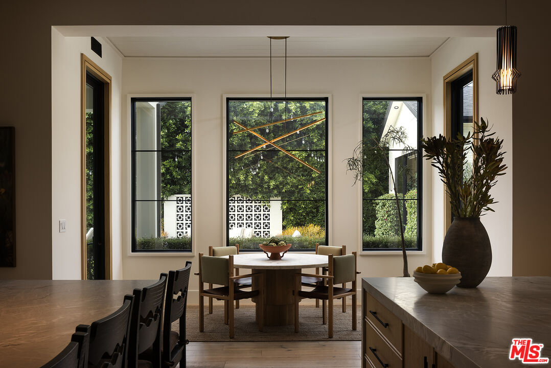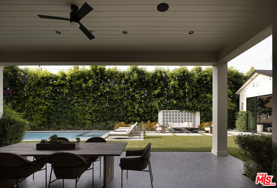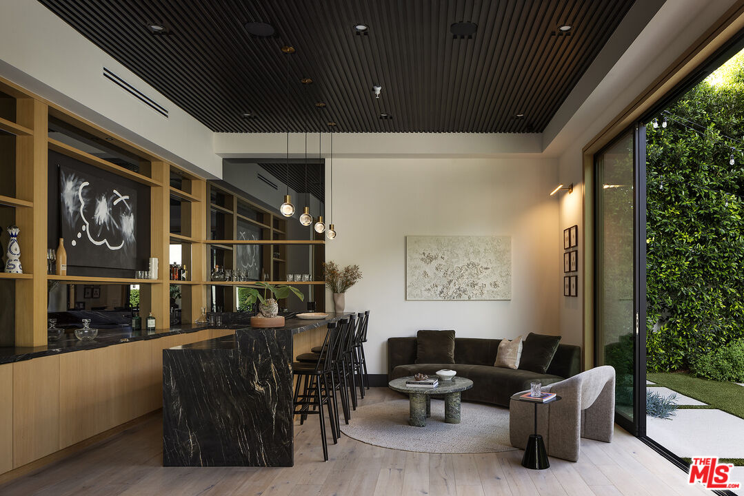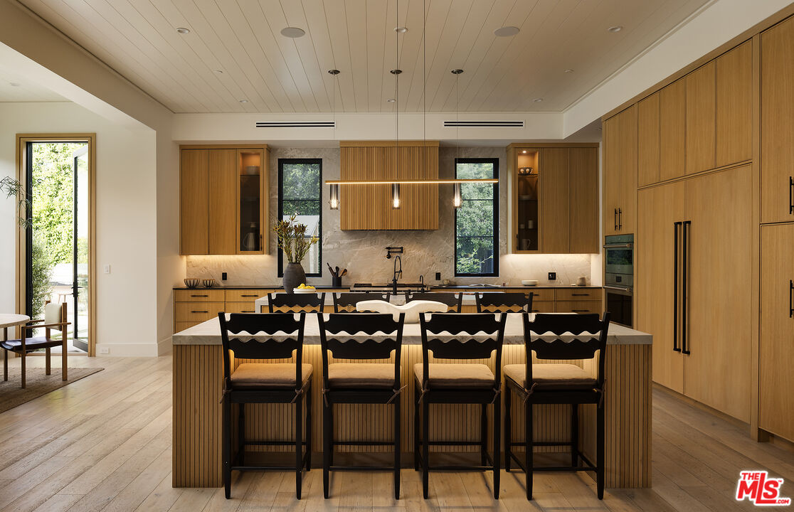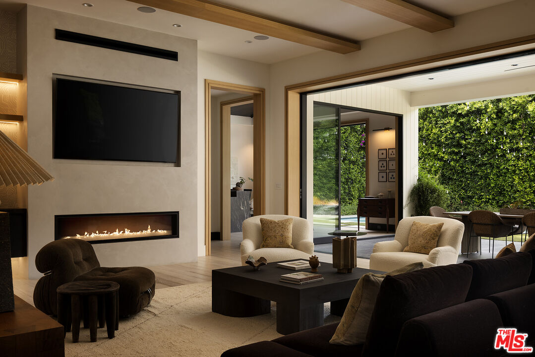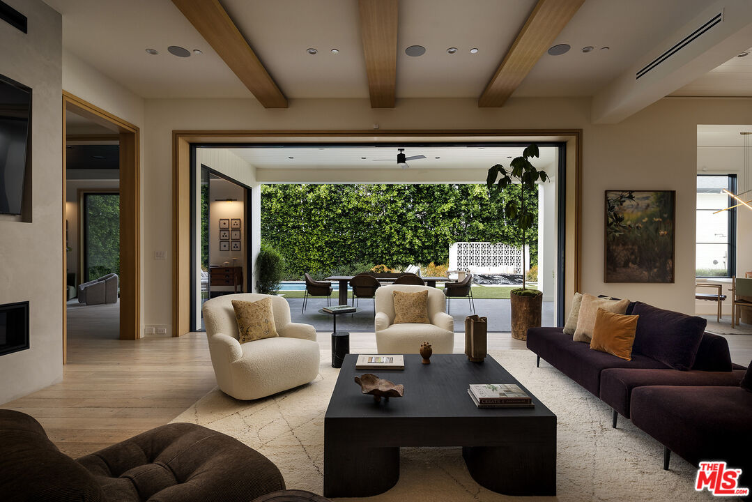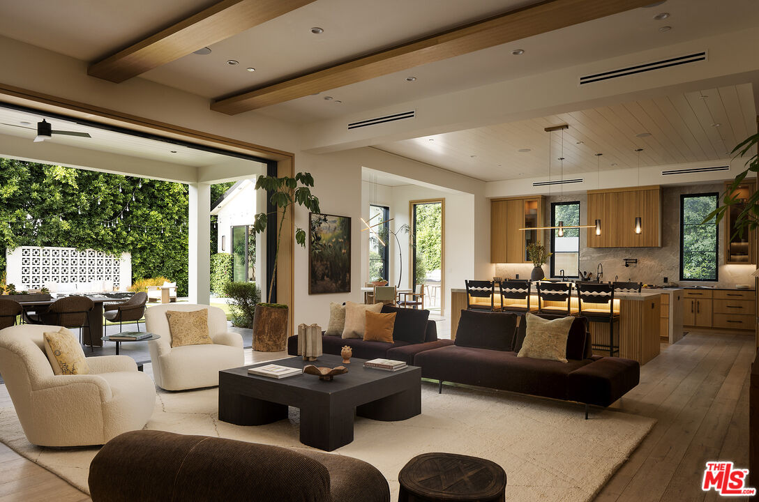 Tucked behind gates along one of Chandler Estates' most coveted tree-lined streets, this recently constructed residence delivers a bold expression of modern farmhouse done right and California living, where architectural scale, refined materials, and thoughtful design converge across approximately 7,500 square feet of voluminous living space. From the moment you enter, the home establishes its presence. A dramatic double-height foyer leads into expansive living spaces defined by soaring ceilings, wide-plank wood floors, and custom millwork throughout. Walls of glass disappear to reveal a true indoor-outdoor lifestyle, with interiors extending seamlessly into a resort-caliber backyard designed for both everyday living and larger-scale entertaining. The outdoor setting is complete with a pool and spa with water features, multiple lounge areas, fire pit, and dual BBQ stations, creating a private environment that feels more like a boutique retreat than a residential yard. A detached pool house with its own bath offers flexibility for a gym, office, or guest suite. At the center of the home, the chef's kitchen pairs clean, modern lines with top-tier functionality, featuring premium appliances, custom cabinetry, double oversized islands, and a fully equipped butler's pantry. The space flows effortlessly into a family room and the informal dining including the breakfast area and al fresco dining, along with a sophisticated yet practical formal dining room, through a thoughtfully designed butlers pantry room, allowing for a range of living experiences from intimate dinners to large gatherings. The main level also includes a full bar, movie theatre, walk-in pantry, laundry room, and en-suite bedroom. Upstairs, the primary suite is designed as a true retreat, generous in scale and thoughtfully appointed with two fireplaces, dual private balconies, a dedicated lounge or fitness space, and an expansive walk-in closet with built-ins and center island. The spa-inspired bath features a soaking tub, oversized glass steam shower, and layered stone and wood finishes that echo the home's overall material palette. Three additional en-suite bedrooms provide privacy and comfort, each finished with the same level of attention to detail. A collection of lifestyle-driven amenities further sets the home apart, including a dedicated theater, a statement bar and lounge, smart home integration, designer lighting, wellness area, and custom carpentry throughout. A three-car garage and gated motor court complete the offering. Positioned just moments from Ventura Boulevard's premier dining, shopping, and entertainment, this is a residence that delivers both convenience and seclusion, designed for those who value space, design, and a home that makes an impression without needing to announce it.