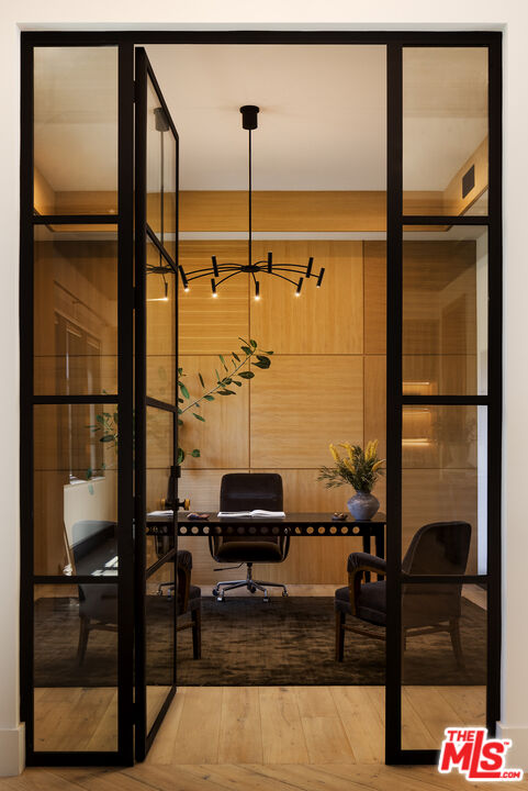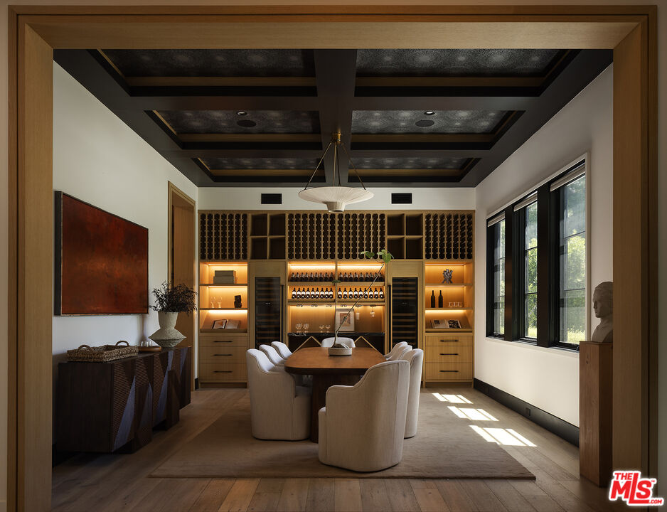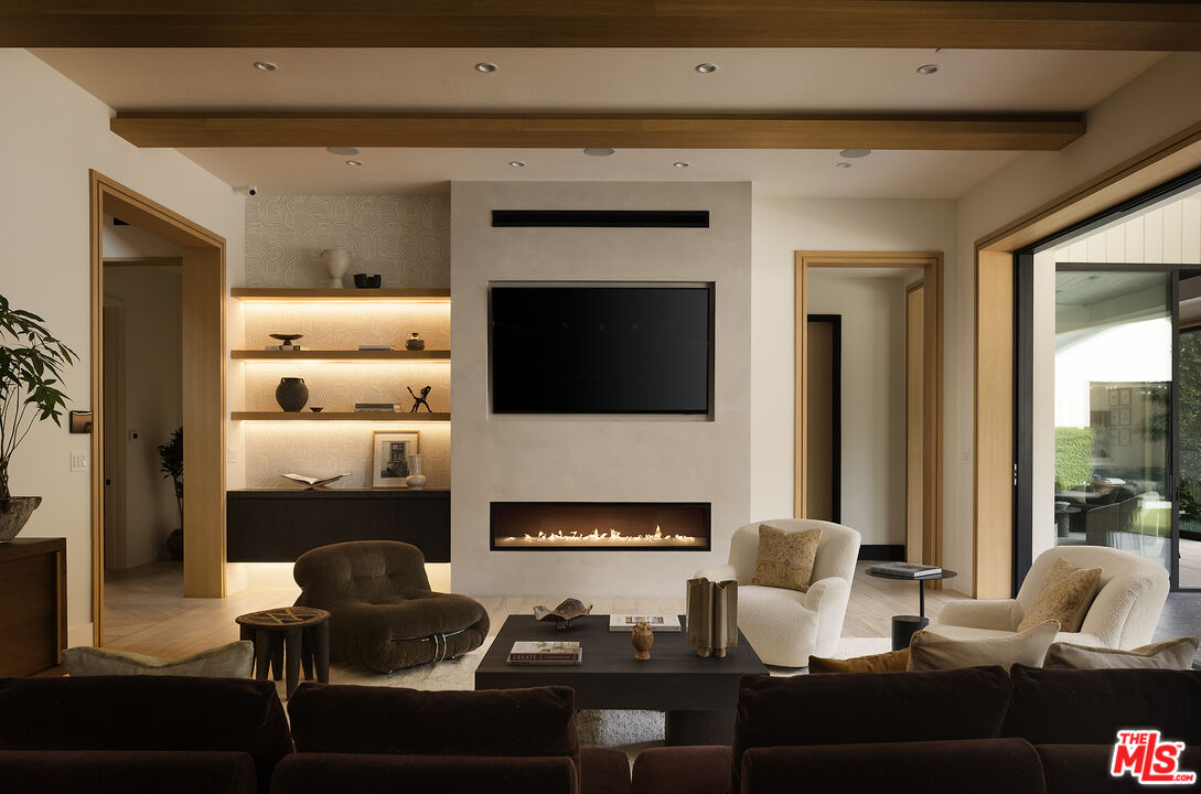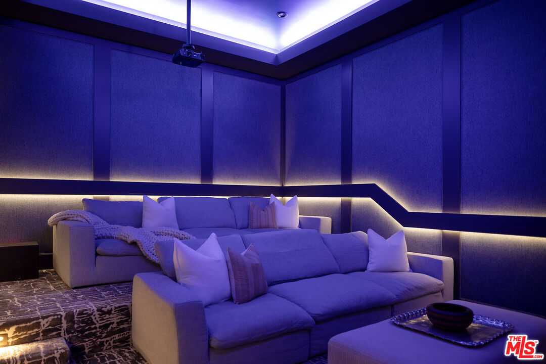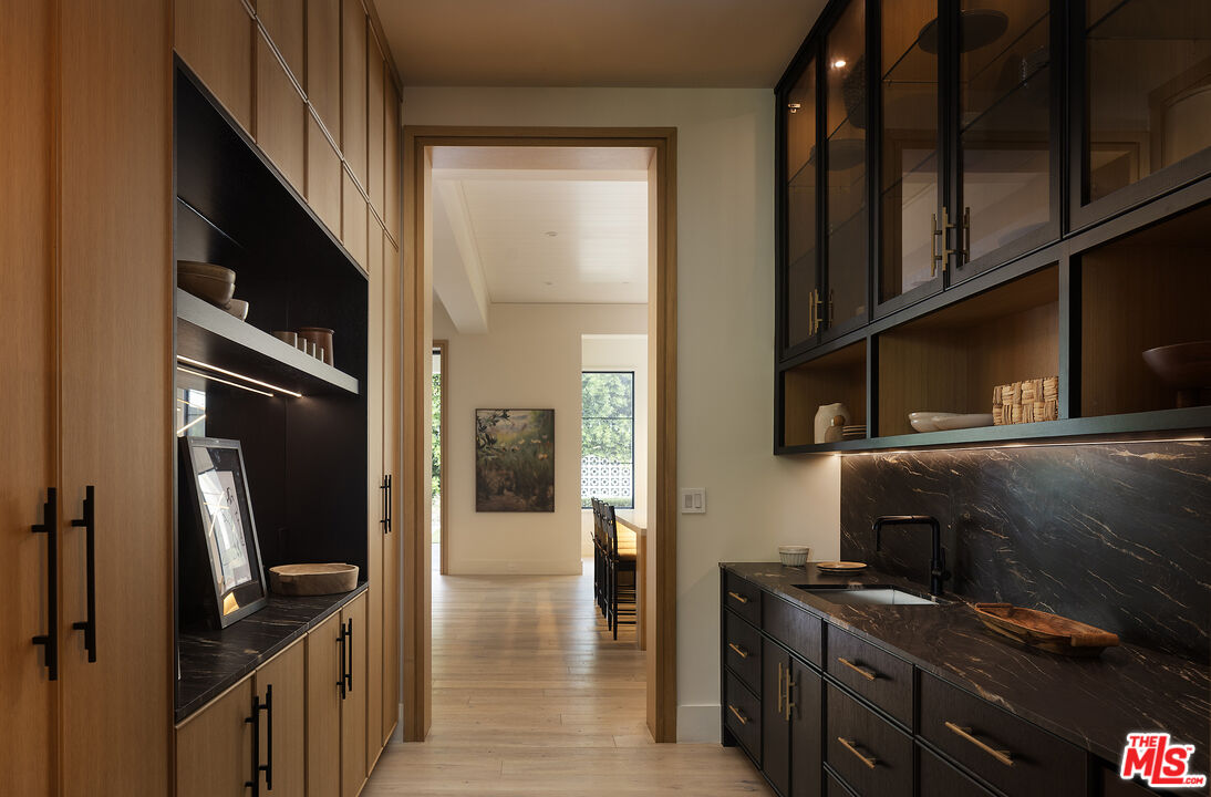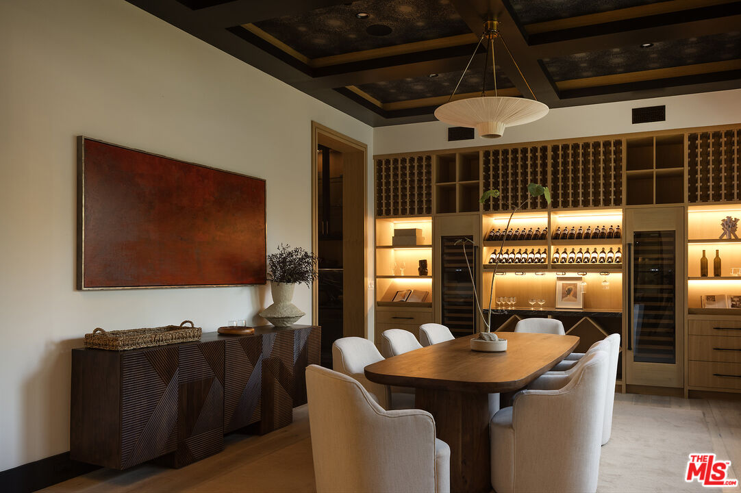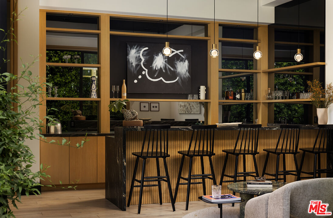 Tucked behind gates along one of Chandler Estates' most coveted tree-lined streets, this recently constructed residence delivers a bold expression of modern farmhouse done right and California living, where architectural scale, refined materials, and thoughtful design converge across approximately 7,500 square feet of voluminous living space. From the moment you enter, the home establishes its presence. A dramatic double-height foyer leads into expansive living spaces defined by soaring ceilings, wide-plank wood floors, and custom millwork throughout. Walls of glass disappear to reveal a true indoor-outdoor lifestyle, with interiors extending seamlessly into a resort-caliber backyard designed for both everyday living and larger-scale entertaining. The outdoor setting is complete with a pool and spa with water features, multiple lounge areas, fire pit, and dual BBQ stations, creating a private environment that feels more like a boutique retreat than a residential yard. A detached pool house with its own bath offers flexibility for a gym, office, or guest suite. At the center of the home, the chef's kitchen pairs clean, modern lines with top-tier functionality, featuring premium appliances, custom cabinetry, double oversized islands, and a fully equipped butler's pantry. The space flows effortlessly into a family room and the informal dining including the breakfast area and al fresco dining, along with a sophisticated yet practical formal dining room, through a thoughtfully designed butlers pantry room, allowing for a range of living experiences from intimate dinners to large gatherings. The main level also includes a full bar, movie theatre, walk-in pantry, laundry room, and en-suite bedroom. Upstairs, the primary suite is designed as a true retreat, generous in scale and thoughtfully appointed with two fireplaces, dual private balconies, a dedicated lounge or fitness space, and an expansive walk-in closet with built-ins and center island. The spa-inspired bath features a soaking tub, oversized glass steam shower, and layered stone and wood finishes that echo the home's overall material palette. Three additional en-suite bedrooms provide privacy and comfort, each finished with the same level of attention to detail. A collection of lifestyle-driven amenities further sets the home apart, including a dedicated theater, a statement bar and lounge, smart home integration, designer lighting, wellness area, and custom carpentry throughout. A three-car garage and gated motor court complete the offering. Positioned just moments from Ventura Boulevard's premier dining, shopping, and entertainment, this is a residence that delivers both convenience and seclusion, designed for those who value space, design, and a home that makes an impression without needing to announce it.