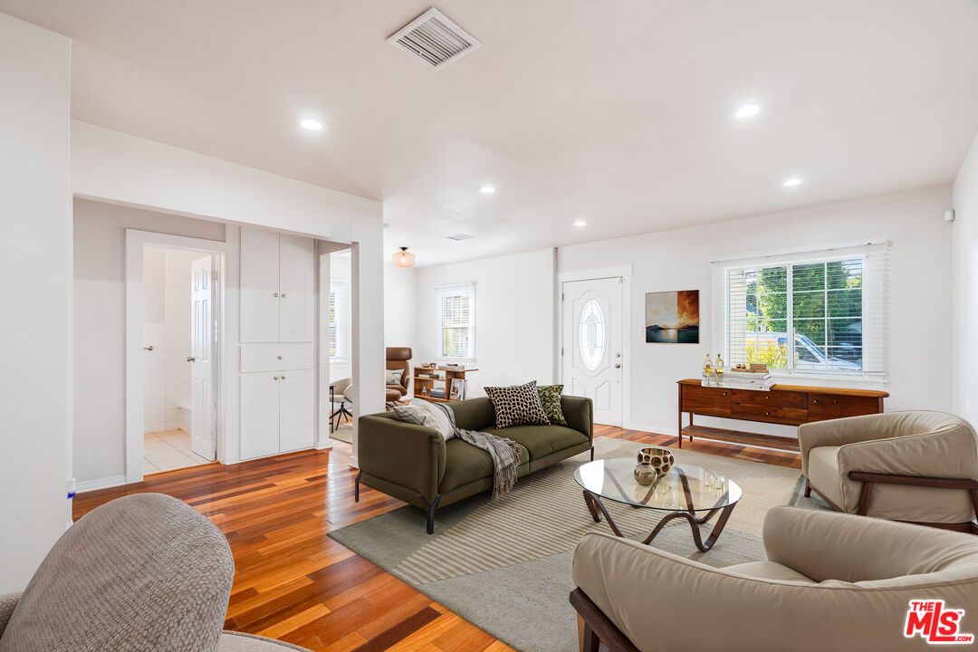 Welcome to your private retreat in the beautiful Valley Glen community! This inviting turnkey house is perfect for an owner-user or investor. On a single level, the 3-bed, 3-full bath home blends modern amenities with classic charm, from the gable roof to the handsome drought-tolerant landscaping. It was entirely remodeled by a prior owner who added dark wood floors throughout, and recently refreshed by the current owners. The sophisticated kitchen features quartz countertops and an eat-at center island. The bright living room is open to the kitchen and dining areas and has direct garage access. The large, bright en-suite primary bedroom features two sizeable wall closets, a spacious bathroom and access to the peaceful, picturesque backyard surrounded on all sides by greenery for total privacy. The second bedroom also features two big closets and an en-suite bathroom, giving it nearly equal claim to primary status. The third bedroom receives pleasant morning light from the east and provides immediate access to the full guest bathroom. Together, these three bedrooms and the comfortable common space will more than meet the needs of any owner. Powerful central AC and the shade of a huge, majestic pine tree combine to keep the interior cool even in the height of summer. A one-car garage is attached and has space for storage plus the washer/dryer. Conveniently located five minutes from the Ventura business district, with equal access to the 405, 101 and 170 freeways, the house is also walking distance from several delicious restaurants, including Jonathan Gold-approved Kobee Factory. Don't miss this opportunity to live nestled in this sequestered neighborhood made up of many cul-de-sacs and tree-lined streets. Also available for rent at $4,490. The photos have been virtually staged.