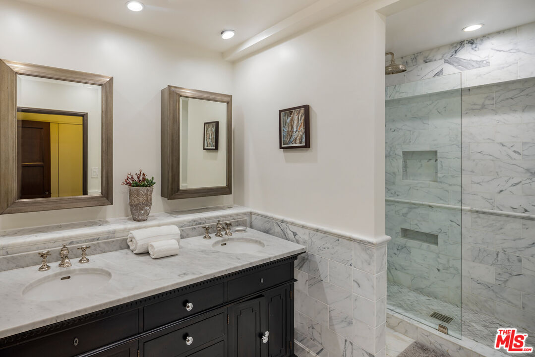 In a colorful garden setting just a few doors above Sunset, this vintage 2-story Spanish Revival home is ideally located in the heart of the Strip, close to many great dining establishments, upscale hotels, the Sunset Plaza shopping district, and West Hollywood's most happening nightlife. As you approach the gated home, you'll be charmed by the lush, vibrant landscaping. Enter through the original paneled front door and be welcomed by the arched walls, warm oak floors, and coved plaster ceilings laid out in a classic floor plan that incorporates large private patios on both the first and second levels; it's a California lifestyle classic. Many French doors bring great light into the interiors, and the original fireplace imbues the home with a warm, classic ambiance. The dining room, perfect for dinner parties, opens to a very private courtyard through a wall of glass doors. A previous renovation transformed the garage into a spacious primary suite, complete with a built-in wall of wardrobe cabinets and a beautiful white marble bathroom. Upstairs is a second white mosaic marble bathroom with tub and shower, and two more bedrooms; both are light-filled, one with two large closets and French doors that open to a patio that features a covered gazebo with TV entertainment system. Enjoy the glamor and excitement of the iconic Sunset Strip while living in a light-filled classic home in a private green garden; complete privacy just moments away from great experiences.