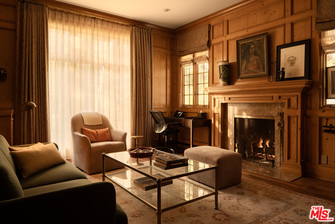 Behind the gates of Moraga Estates, one of Bel Air's most exclusive private communities, 1420 Moraga Drive sits on over six acres of land surrounded by hillside views and absolute privacy. This stately Tudor residence is discreetly sited with approximately 600 feet of street frontage, its brick facade softened by curated landscaping and a canopy of mature sycamores. Original parquet in the foyer with added custom walnut floors throughout and thick doors with hand-forged hardware anchor the interiors in material richness. The formal dining room is wrapped in hand-painted wallpaper, designed around custom sconces and a one-of-a-kind chandelier of olive branches adorned with topaz and crystals. The chef's kitchen features Wolf appliances, a farmhouse sink, a large island, and an adjacent pantry includes a second refrigerator, a wine refrigerator, and large-capacity freezer. The kitchen dining area has a concealed pop-up television and access through three French doors that open to a trellised patio with Barbeque area. Nearby, a built-in bar with additional beverage, wine and ice machine. A separate wood-paneled library offers a quiet retreat with a large fireplace, custom built-ins, and an ensuite bath, making it ideal as an office or guest suite. One of the home's most artful vignettes, the powder room is wrapped in ethereal, painterly wallpaper and grounded by striking black marble flooring. An oval window with a radial grille casts soft, diffused light across the space, illuminating a hand-carved antique vanity and custom marble sink. The primary suite opens to a private terrace with sweeping hillside views often visited by deer. The bathroom evokes the feeling of a treehouse spa with large windows, dual vanities with filtered water, dual toilet closets with Toto Washlets, a seven-foot soaking tub, and a multi-head rain shower. Chevron-patterned walnut and marble floor and ambient lighting add a sense of calm and continuity. Double dressing rooms include custom cabinetry and built-in safes. The guest wing includes three generously sized bedrooms with ensuite baths and walk-in closets. Along the hallway there's additional storage with three walk-in closets and two linen cabinets. Further down the hallway is a family lounge and a large bonus room that currently serves as a music studio. An additional guest bedroom, walk-in closet and bath is down the backstairs. Outside, a vine-draped pergola runs the full length of the home, strung with twinkle lights and warmed by built-in heaters. The grounds feature a large pool and spa, Swedish sauna, herb garden, firepit with lounge seating, a separate pool bathroom with shower, climbing wall, gymnastics rings, yoga sling, and Rogue stall bars. A fully equipped outdoor kitchen and dining area enhance the experience. The stone driveway leads to a gated portico and an expansive motor court with access to the climate-controlled three-car garage. Security is paramount on Moraga Drive. The community security features 24-hour gated guard service, roving patrol vehicles, and a self-launching drone with infrared technology, making Moraga one of the most advanced residential surveillance systems in the country.