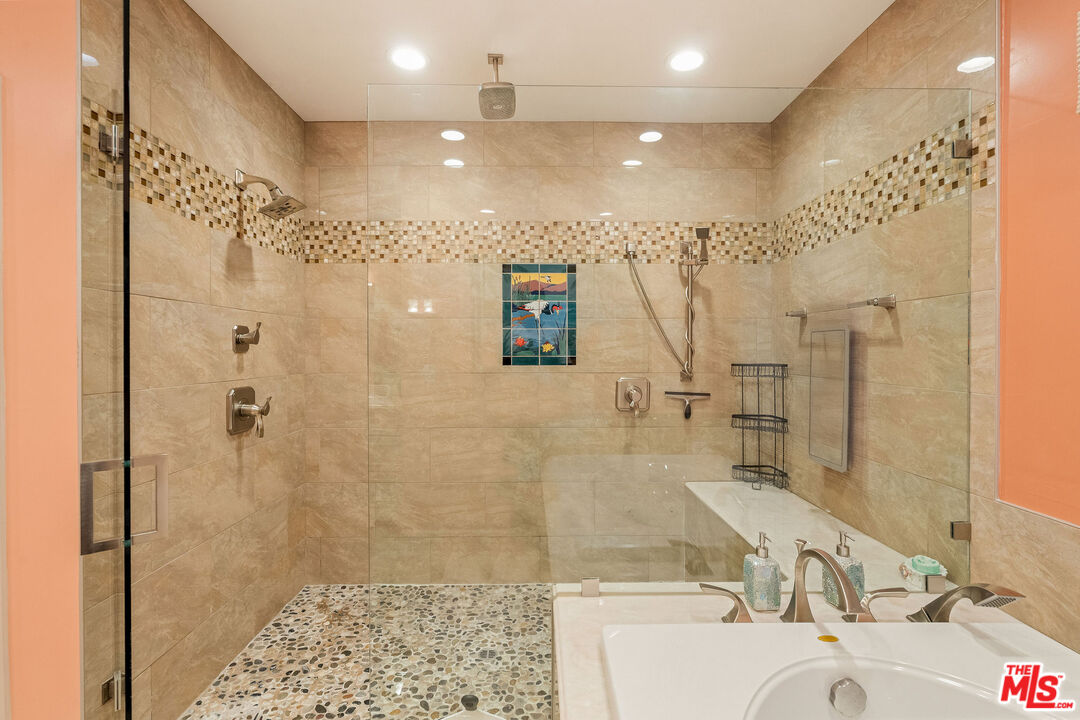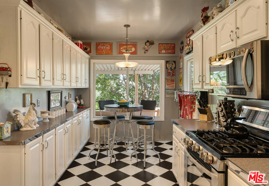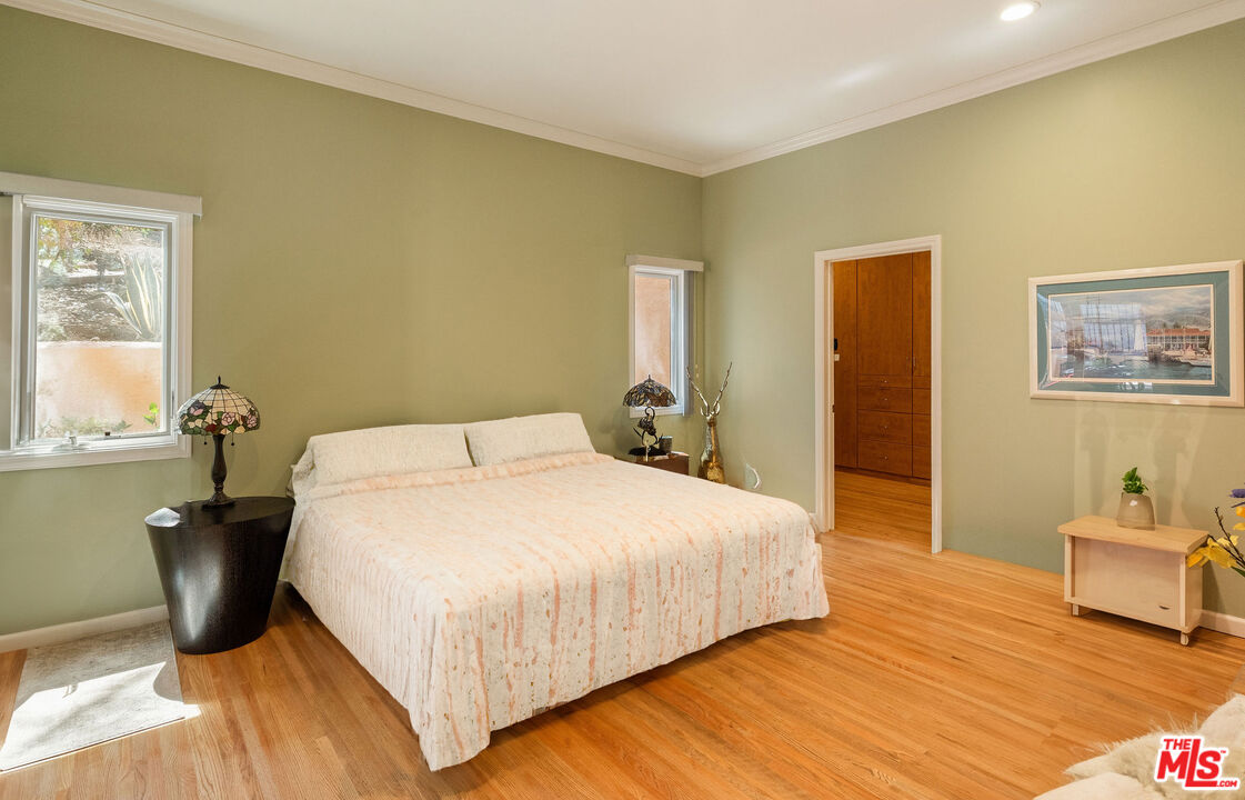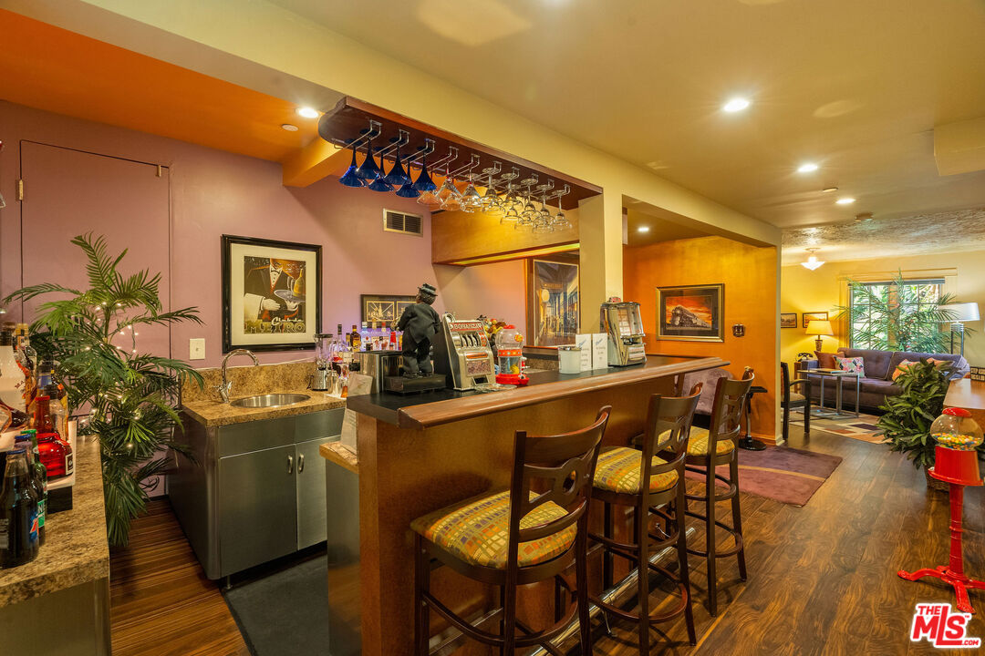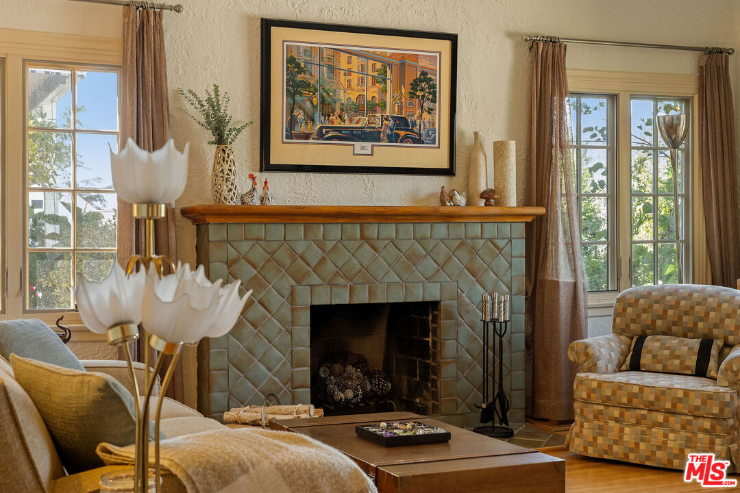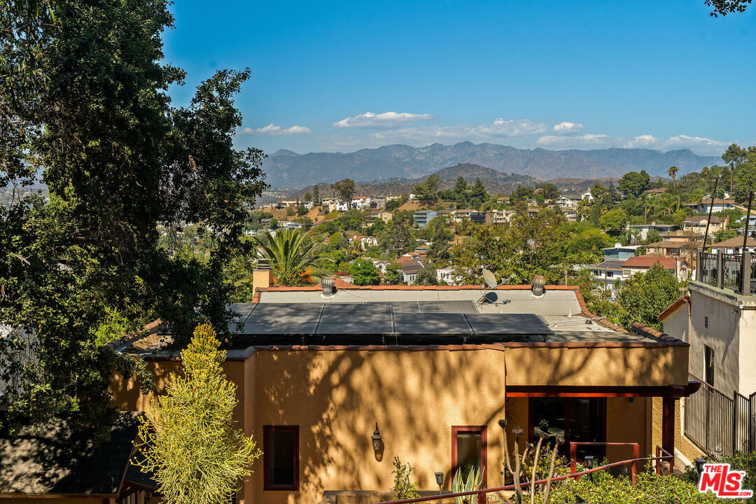 Perched on the sunny shoulders of Adams Hill, this lovely Spanish home glows with charm, its walls washed in warm tones, a lush garden in bloom, and incredible views. Four bedrooms and three baths spill with natural light, as the smell of eucalyptus drifts through the windows, carrying birdsong with it. The living room with its handmade tile fireplace hearth greets you like an old friend. The kitchen with its 1950s diner charm dares you to feel anything but joy as the morning sun creeps across the crape myrtle blossoms while you sip your coffee. Down the hall are the laundry room, two guest bedrooms, and a large primary suite boasting high ceilings, walk-in closet, and a sumptuous spa-like en suite bath. From there sliding doors open out to the backyard as your lot keeps going on up the winding path amongst the trees. Modern updates pepper her rich history, including solar panels, crispy newer HVAC, and updated electrical all make her turn-key ready to welcome her next caretaker. Lastly the knock out is the bonus private guest unit with a separate entrance downstairs, featuring a full en suite bath, and gorgeous backlit bar lending you incredible versatility - perfect for guests staying over, a great work from home set up, or your own little speakeasy for entertaining complete with wine cellar and bar affectionately known as the Sunset Lounge. Just outside the Spanish tile deck above the detached 2 car garage offers itself as a natural host to gatherings large and small where evenings stretch long under the stars. This is Adams Hill, where the world feels small and neighborly, yet the best of Glendale, Atwater, Highland Park & Eagle Rock await: Kafn Cafe, Dune, Little Ripper, Joy, Bub and Grandma's, Dunsmoor, Din Tai Fung & The Americana all just minutes from your door. Welcome home!