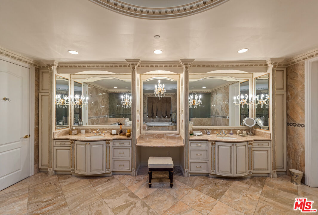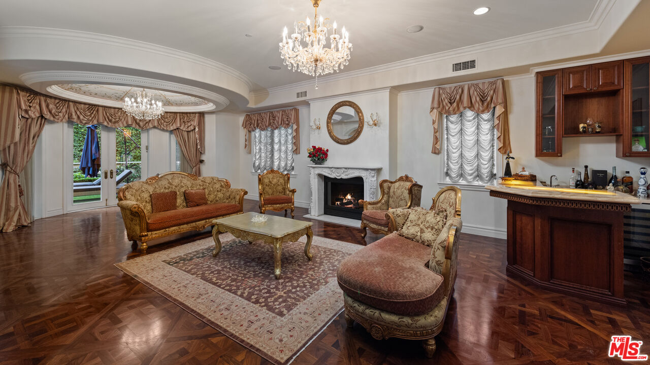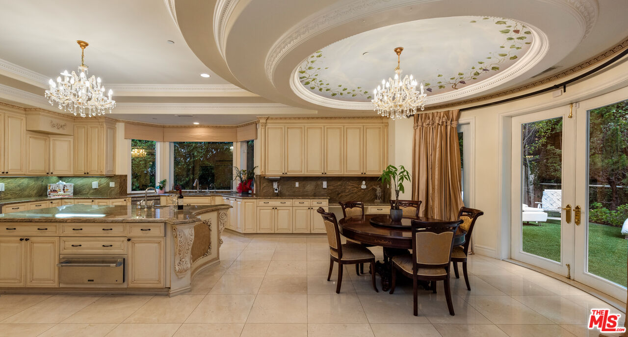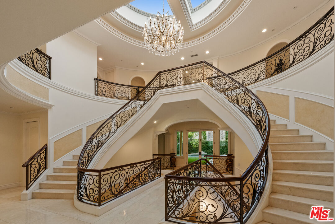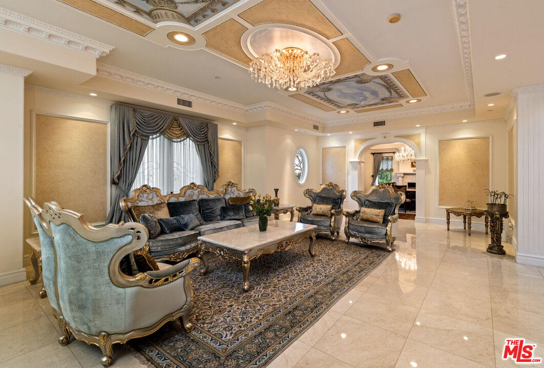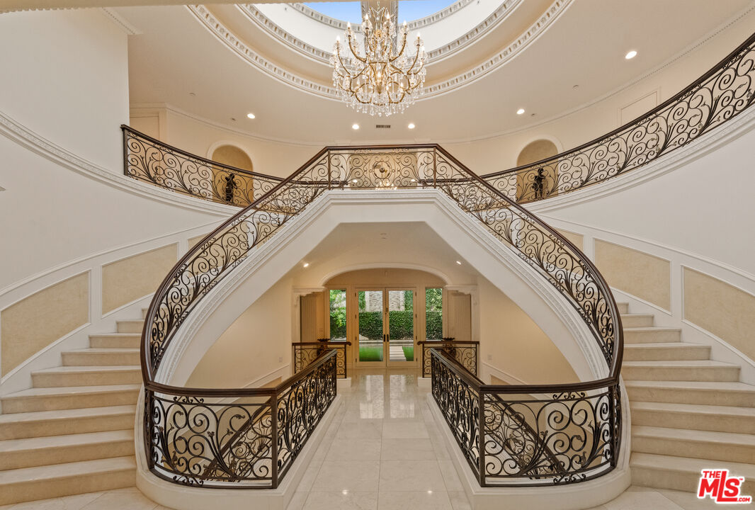 Welcome to a world of timeless grandeur and refined elegance in this spectacular French Colonial estate, originally envisioned to host diplomats and royalty with the utmost discretion and comfort. Nestled on prestigious Robmar Drive, just moments from the pulse of Beverly Hills and iconic Rodeo Drive, this palatial residence offers an unmatched lifestyle of luxury and sophistication. With 5 bedrooms and 8 bathrooms, the home welcomes you with a dramatic double-height foyer, where sweeping twin staircases with ornate wrought-iron railings ascend beneath a magnificent chandelier. The main level is anchored by a lavish great room perfect for entertaining on any scale. The gourmet kitchen is a chef's dream, complete with sculpted marble countertops and a charming breakfast nook. Adjacent, the formal dining room is accented by a hand carved marble fireplace, while the family room offers a warm ambiance with a custom hardwood entertainment center and additional fireplace. The stately library impresses with a richly detailed coffered ceiling, fireplace, and custom-built bookshelves and cabinetry. Upstairs, the expansive primary suite is a true sanctuary, boasting both a luxurious sleeping chamber and an elegant sitting room each with its own fireplace. The oversized walk-in closet features custom hardwood cabinetry and a central island, while the spa-like primary bathroom includes dual vanities, dual showers, a soaking tub, and exquisite inlaid marble flooring. Three additional en suite guest bedrooms offer comfort and privacy for family and visitors alike. Thoughtfully designed for both beauty and functionality, the home is served by an elevator and adorned with polished marble and inlaid hardwood flooring, hand-painted ceilings, charming chandeliers, French doors, balconies, and opulent window treatments throughout. Outdoors, a serene private patio leads to a lush lawn, sparkling pool, and relaxing spa, all set against a terraced hillside of mature landscaping with fruit trees. The lower level completes the estate with a state-of-the-art gym, a professional-grade screening room, and a crescent-shaped, dual-gated motor court for secure, stylish arrivals. Meticulously maintained, this architectural masterpiece is a rare offering providing privacy, prestige, and proximity to the best shopping, dining, and entertainment in the world-renowned city of Beverly Hills.