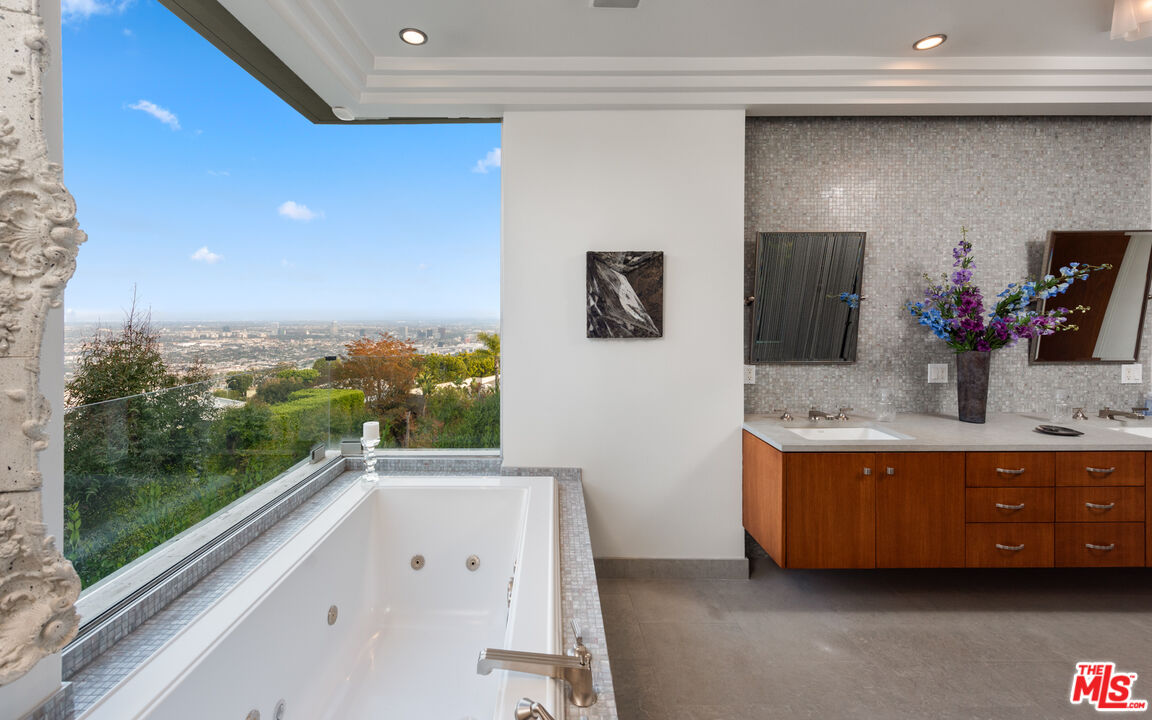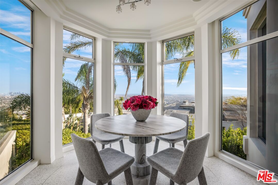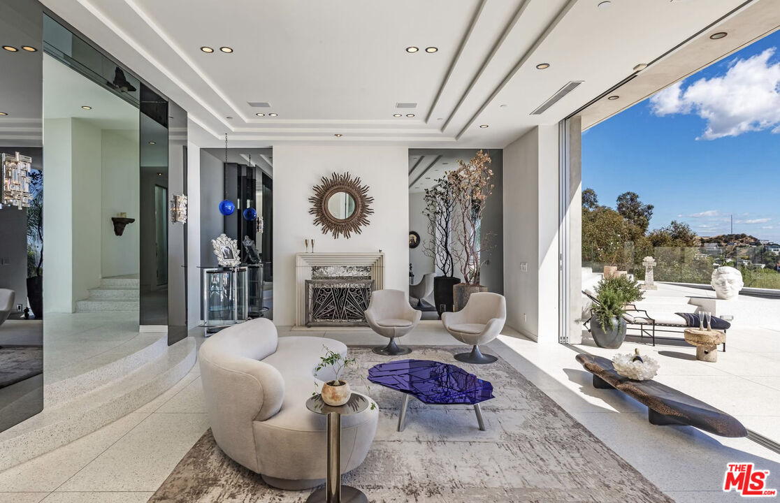Inspired by some of the greatest Art Deco landmarks of our city, this rarified contemporary residence sits commandingly at the end of a gated private driveway flanked by an avenue of palm trees. The two-story entrance hall with its curving staircase leads to a sunken great room with disappearing walls of glass, a sanctuary for your senses, where an infinity edged pool spills into astonishing views from the San Gabriel Mountains to the Pacific Ocean. The full downtown skyline is the dramatic focal point, other times it's the jaw-dropping colors of the sky, shape-shifting clouds, or exceptional soaring hawks that grace the sky as you lounge on the pool deck.With a total of three bedroom suites, each with its own bath and unique stone floors, the primary bedroom stands out due to its romantic fireplace, boutique-worthy closet and dreamy panoramic views from your pillow. Just a few steps away, open the Fleetwood pocket doors to the pool terrace and indulge in the bubbling spa and outdoor shower. The saltwater pool and spa allow you to create the perfect mood with LED lighting in a variety of colors, as well as starry sky fiber optic lights embedded in the pool's surface, all controlled remotely. A rooftop gobo light connected to an indoor switch displays your logo or message in the pool, or on the deck, when entertaining special guests. Your gourmet kitchen boasts top-of-the-line Miele appliances including a built-in espresso machine, dual sinks, and a center island with marble counters. All graciously flow to the circular breakfast nook and dining room featuring floor to ceiling windows that flood the space with sunlight and stellar views. On the lower floor, enjoy a professionally-sized screening room that's tucked away next to a river rock outdoor atrium where palm trees, a symbol of Hollywood dreams, reach to the sky.A variety of beautiful materials, including hardwood floors in the bedroom suites and walk-in closets, are used throughout. Art Deco flourishes are seen in the custom iron work and classic mosaic bath tiling, as well as in the architectural detailing inside and out. The terrazzo floors are custom built to last using old world Italian craftsmanship. Like the beautiful and stylish architectural treasures that inspired its creation and design, this estate is unique, significant and evolutional.