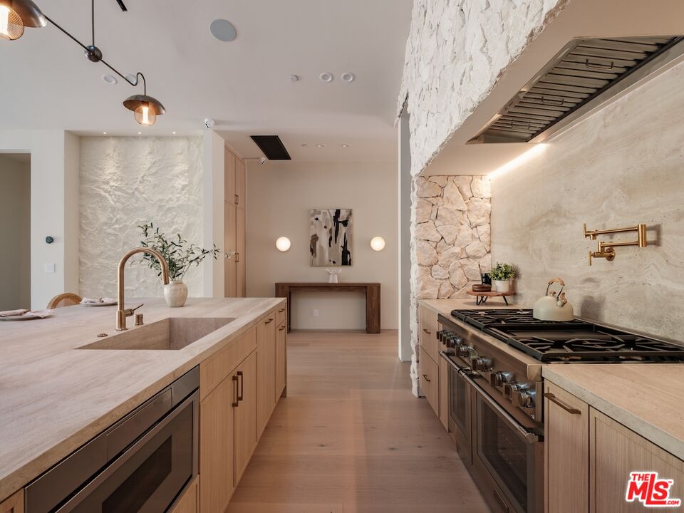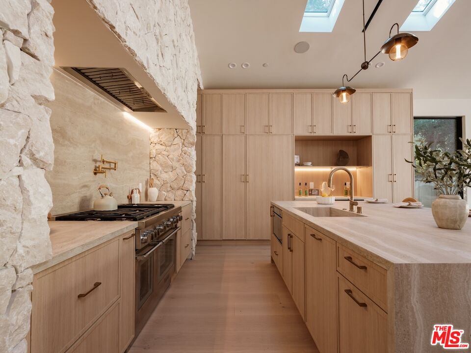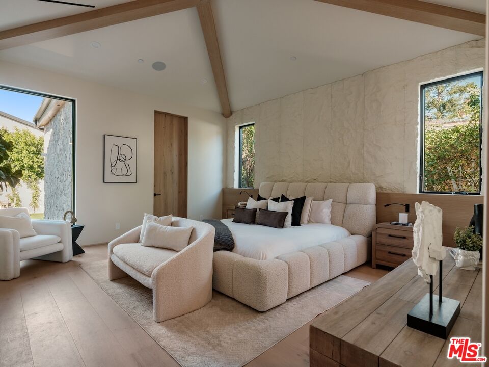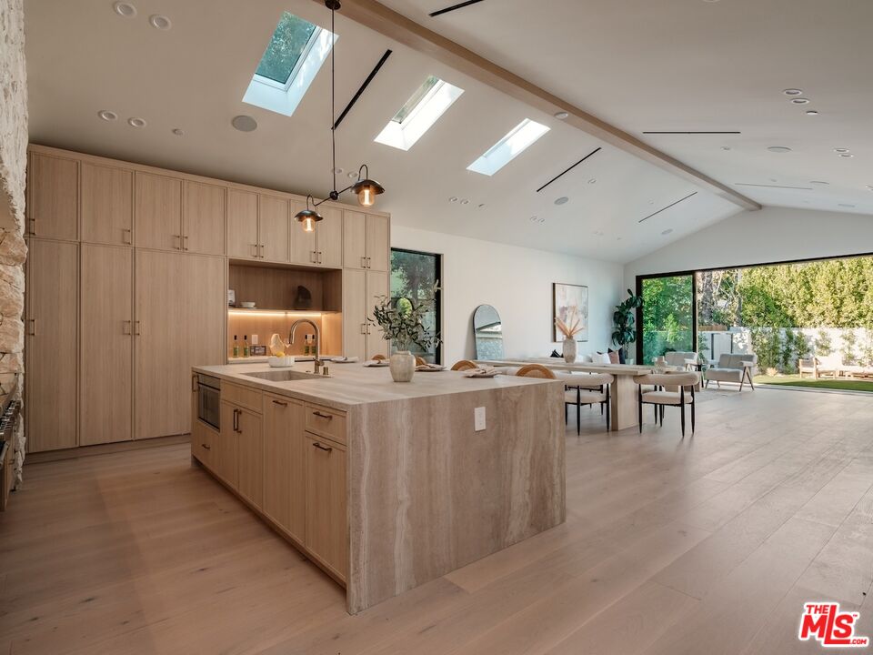 Architectural Organic-Modern Residence with Pool & Private ADU | Sherman Oaks. Tucked away on a quiet residential street, this newly constructed architectural home is a masterclass in organic-modern design, blending warm natural materials with refined contemporary lines. The main residence offers 4 bedrooms and 4.5 bathrooms, thoughtfully curated for effortless California living. 4th bedroom can also be converted into an ADU, it has a private entrance. Vaulted ceilings with exposed beams, skylights, and expansive walls of glass flood the interiors with natural light, while wide-plank hardwood floors and custom millwork create a calm, elevated aesthetic throughout. The open-concept living and dining areas seamlessly connect to the outdoors through oversized sliding glass doors, creating a true indoor-outdoor lifestyle. At the heart of the home, the chef's kitchen stuns with an oversized natural stone island, custom light-oak cabinetry, designer brass fixtures, and a sculptural stone hood framing the professional-grade range. Integrated appliances, abundant storage, and architectural details make this space as functional as it is beautiful. The primary suite is a private retreat, featuring vaulted ceilings, serene garden views, and a spa-like ensuite with a double vanity, custom cabinetry, and a glass-enclosed walk-in shower. A thoughtfully designed walk-in closet completes the suite with both style and practicality . Step outside to a private resort-style backyard, where a sparkling pool, lush landscaping, and multiple lounging areas create an intimate setting for entertaining or quiet relaxationperfectly framed by the home's clean architectural lines. An attached 1-bedroom, 1-bathroom ADU currently as an 4th bedroom includes a private entrance, separate address, offering exceptional flexibility for extended family, guests, or rental income. Finished with designer lighting, custom stonework, energy-efficient upgrades, and timeless materials throughout, this turnkey property delivers architectural sophistication, lifestyle versatility, and long-term value, all just moments from top-rated schools, dining, shopping, and major commuter routes.
