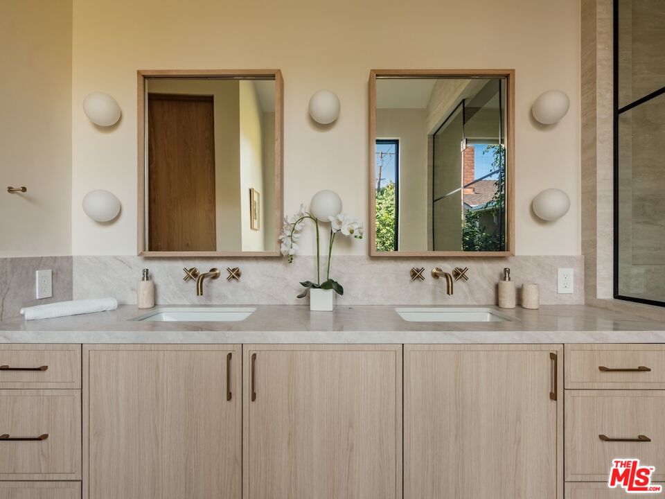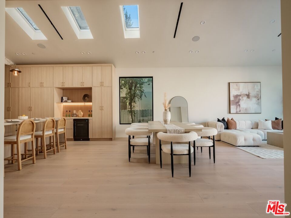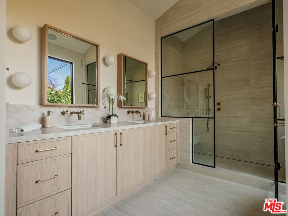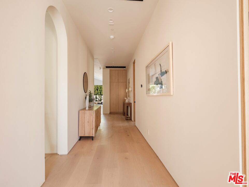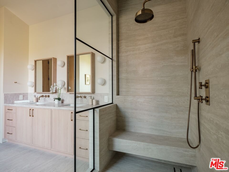 Architectural Organic-Modern Residence with Pool & Private ADU | Sherman Oaks. Tucked away on a quiet residential street, this newly constructed architectural home is a masterclass in organic-modern design, blending warm natural materials with refined contemporary lines. The main residence offers 4 bedrooms and 4.5 bathrooms, thoughtfully curated for effortless California living. 4th bedroom can also be converted into an ADU, it has a private entrance. Vaulted ceilings with exposed beams, skylights, and expansive walls of glass flood the interiors with natural light, while wide-plank hardwood floors and custom millwork create a calm, elevated aesthetic throughout. The open-concept living and dining areas seamlessly connect to the outdoors through oversized sliding glass doors, creating a true indoor-outdoor lifestyle. At the heart of the home, the chef's kitchen stuns with an oversized natural stone island, custom light-oak cabinetry, designer brass fixtures, and a sculptural stone hood framing the professional-grade range. Integrated appliances, abundant storage, and architectural details make this space as functional as it is beautiful. The primary suite is a private retreat, featuring vaulted ceilings, serene garden views, and a spa-like ensuite with a double vanity, custom cabinetry, and a glass-enclosed walk-in shower. A thoughtfully designed walk-in closet completes the suite with both style and practicality . Step outside to a private resort-style backyard, where a sparkling pool, lush landscaping, and multiple lounging areas create an intimate setting for entertaining or quiet relaxationperfectly framed by the home's clean architectural lines. An attached 1-bedroom, 1-bathroom ADU currently as an 4th bedroom includes a private entrance, separate address, offering exceptional flexibility for extended family, guests, or rental income. Finished with designer lighting, custom stonework, energy-efficient upgrades, and timeless materials throughout, this turnkey property delivers architectural sophistication, lifestyle versatility, and long-term value, all just moments from top-rated schools, dining, shopping, and major commuter routes.
