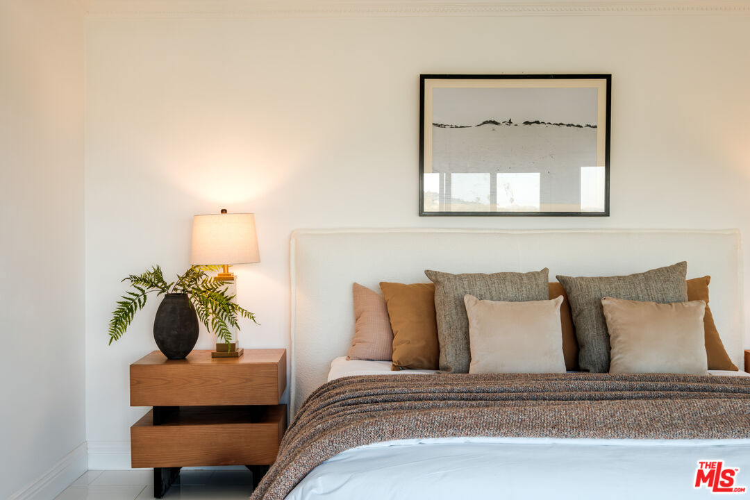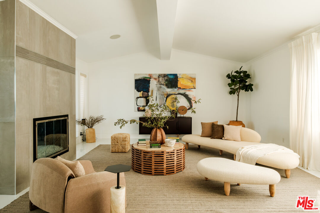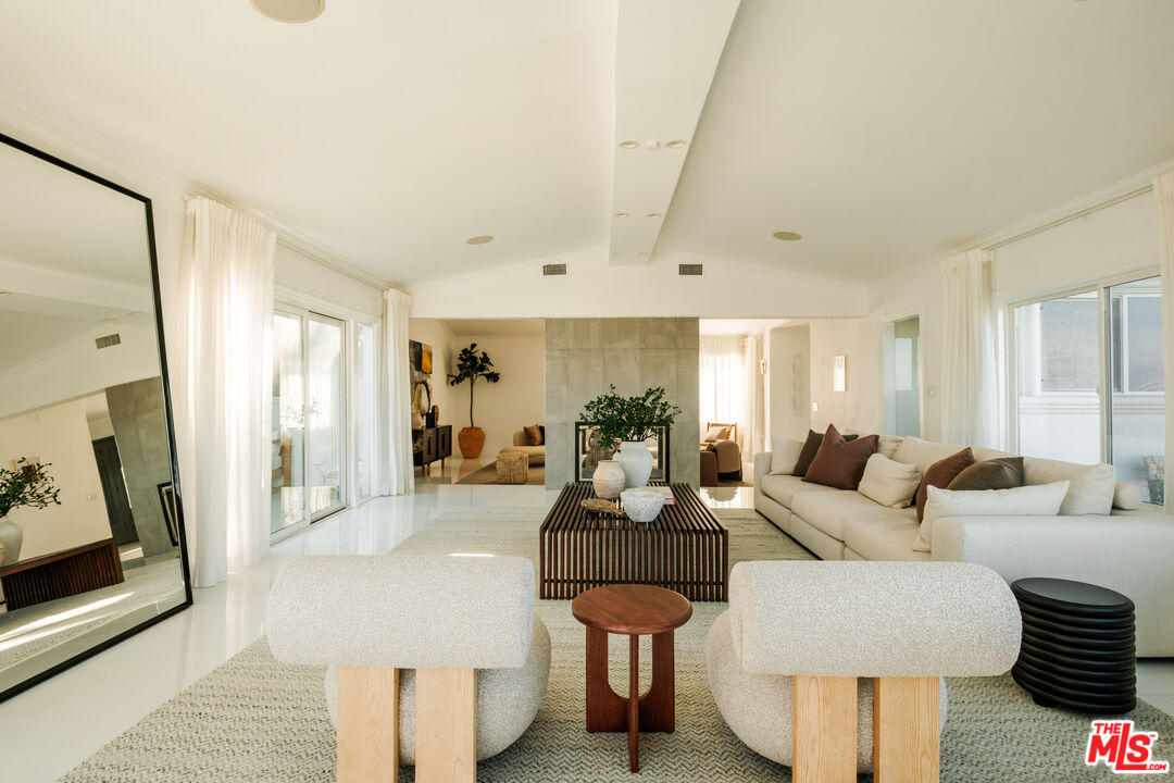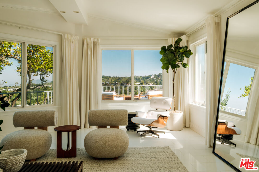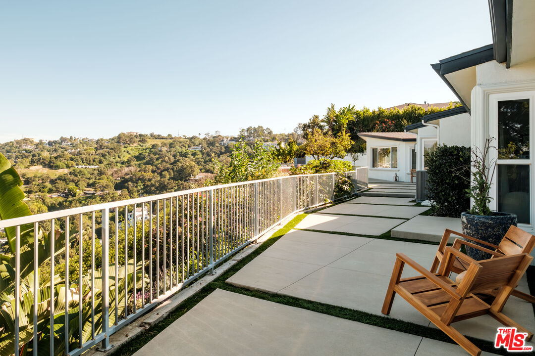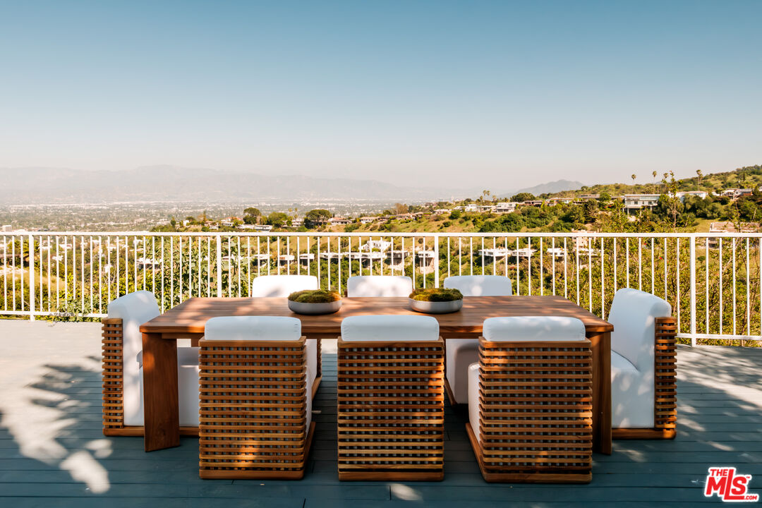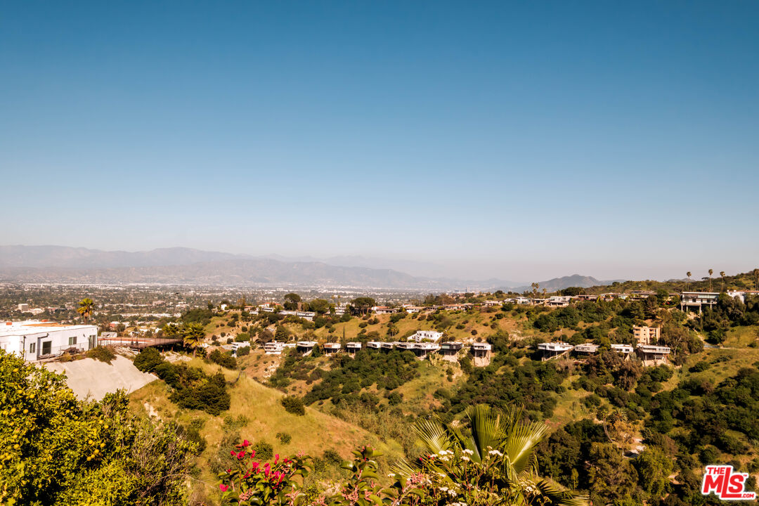 Set on a ridge promontory, in secluded Skyview Estates, this contemporary view home commands unobstructed 180-degree valley, canyon and mountain vistas from nearly every room. Privately positioned on approximately 18K sq ft cul-de-sac lot, south of Ventura Blvd, the residence offers clean contemporary design, high ceilings, and seamless indoor/outdoor flow through walls of glass. The open living and family spaces center around a sleek modern fireplace and connect to the dining area and updated view kitchen with custom cabinetry, premium appliances, and an eat-in bar. The primary suite captures sweeping views and features a walk-in closet and spa level bath with soaking tub, oversized shower, and dual vanities. Two guest bedrooms, a separate bonus room (converted garage), and abundant natural light complete the interior. Outside, a resort style pool and spa, expansive decking, and wraparound entertaining areas overlook the dramatic ridge setting, with a terraced garden and fruit trees below. Another great benefit of this enclave, is the underground utilities! Gated parking and a central location with quick access to the Westside, Bel Air, Brentwood, Beverly Hills, and Sherman Oaks add to the appeal. Don't miss this fantastic promontory offering with powerful views and a turnkey contemporary aesthetic.
