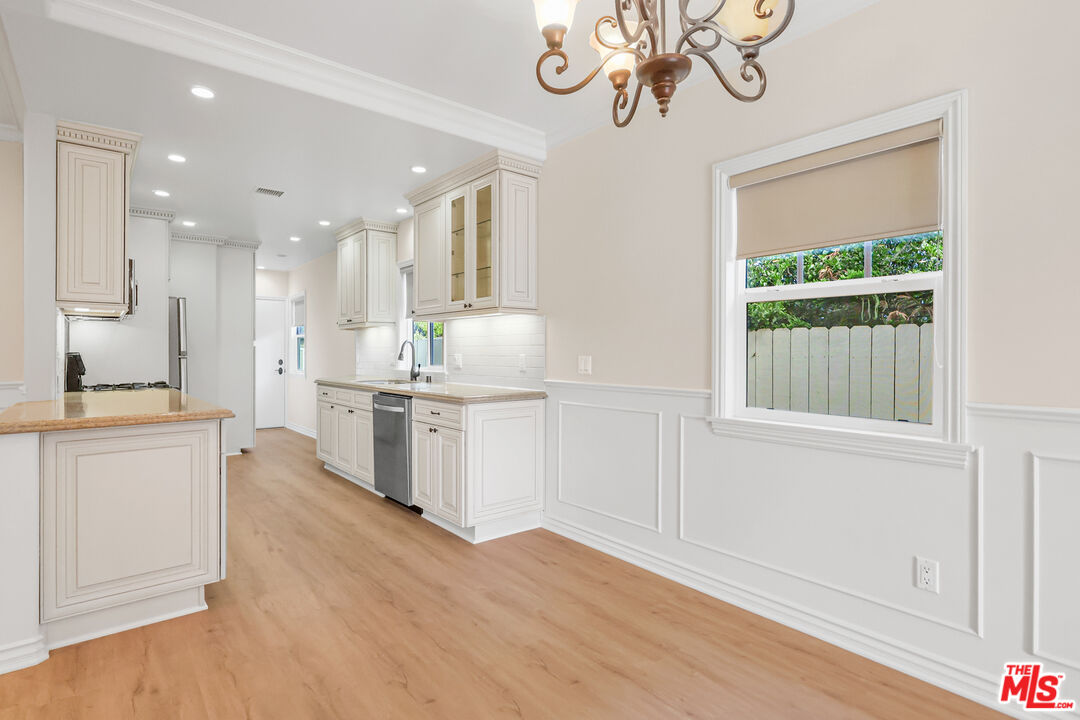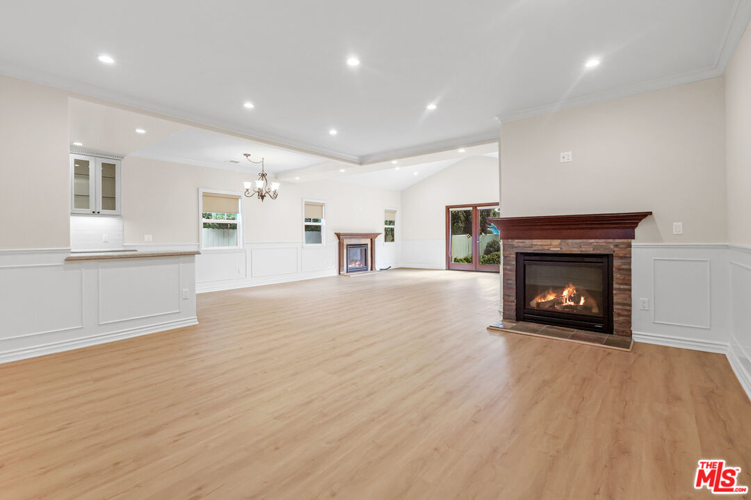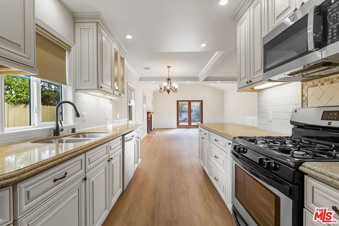 Exciting Sherman Oaks Offering.Beautifully remodeled and expanded home on a quiet, tree lined cul-de-sac. This open and spacious floor plan has 4 bedrooms, 3 baths, kitchen, family room and formal living room. Two of the bedrooms have en suite baths. The other two share a bath situated in the hall between them. The primary suite includes a walk-in closet with custom built features. The large bathroom has both a glass enclosed shower and jetted tub for bathing. Double vanities finish the bathroom. Through the bedroom French doors, there is access to the patio and back yard. All bedrooms feature generous closets. The galley kitchen has a pantry, stainless steel appliances, granite countertops and beautiful cabinetry, all allow for comfortable use. The family room is open, light, and expansive. With vaulted ceilings, wainscoting, a fireplace and French doors to the patio and back yard, this creates a gorgeous centerpiece in the home. A dining area is located between the family room and the formal living room. Crown molding,wainscoting and a second fireplace continue in the living room. Newly installed SVP flooring flows smartly throughout the home. The yard is a delight with its colorful landscaping and mature trees, including many types of citrus. It provides a quiet oasis in this prime SHERMAN OAKS location. The two car attached garage is home to a newer washer and dryer. There is a secondary stackable laundry facility in the hallway closet. The home has been renovated and shows beautifully. A one of a kind home to enjoy for a lifetime!