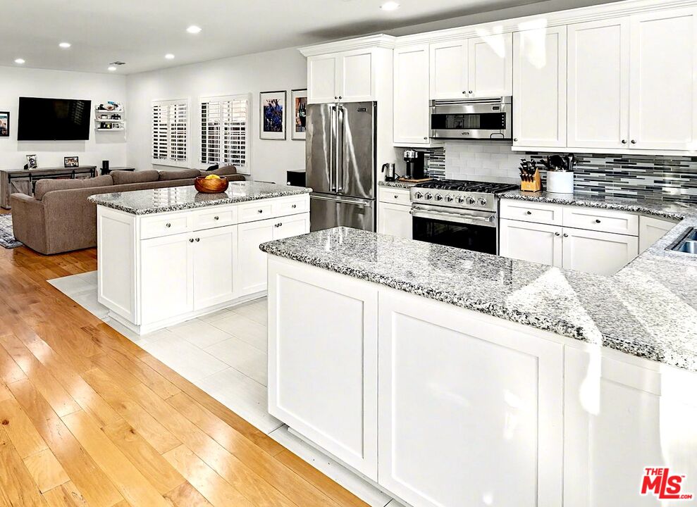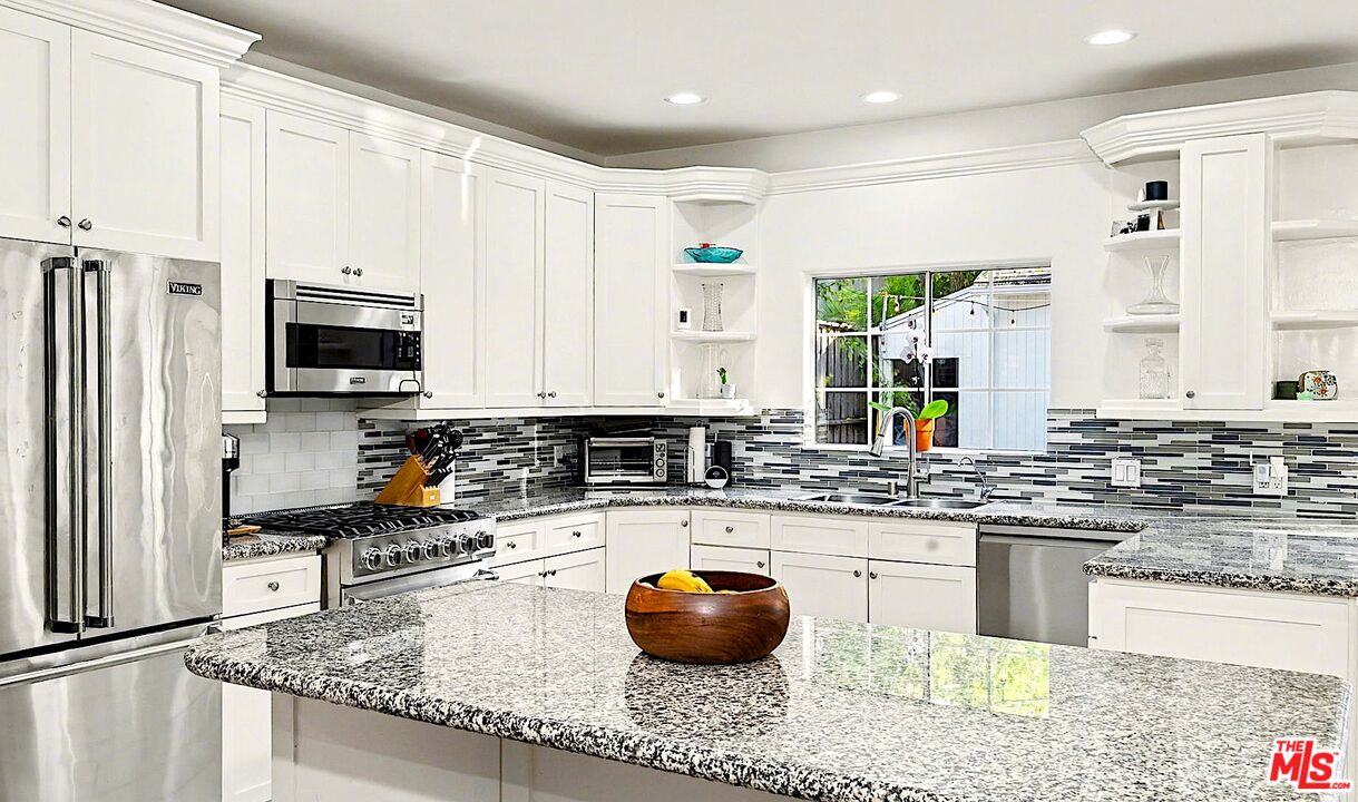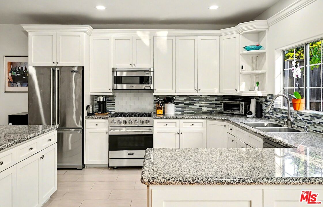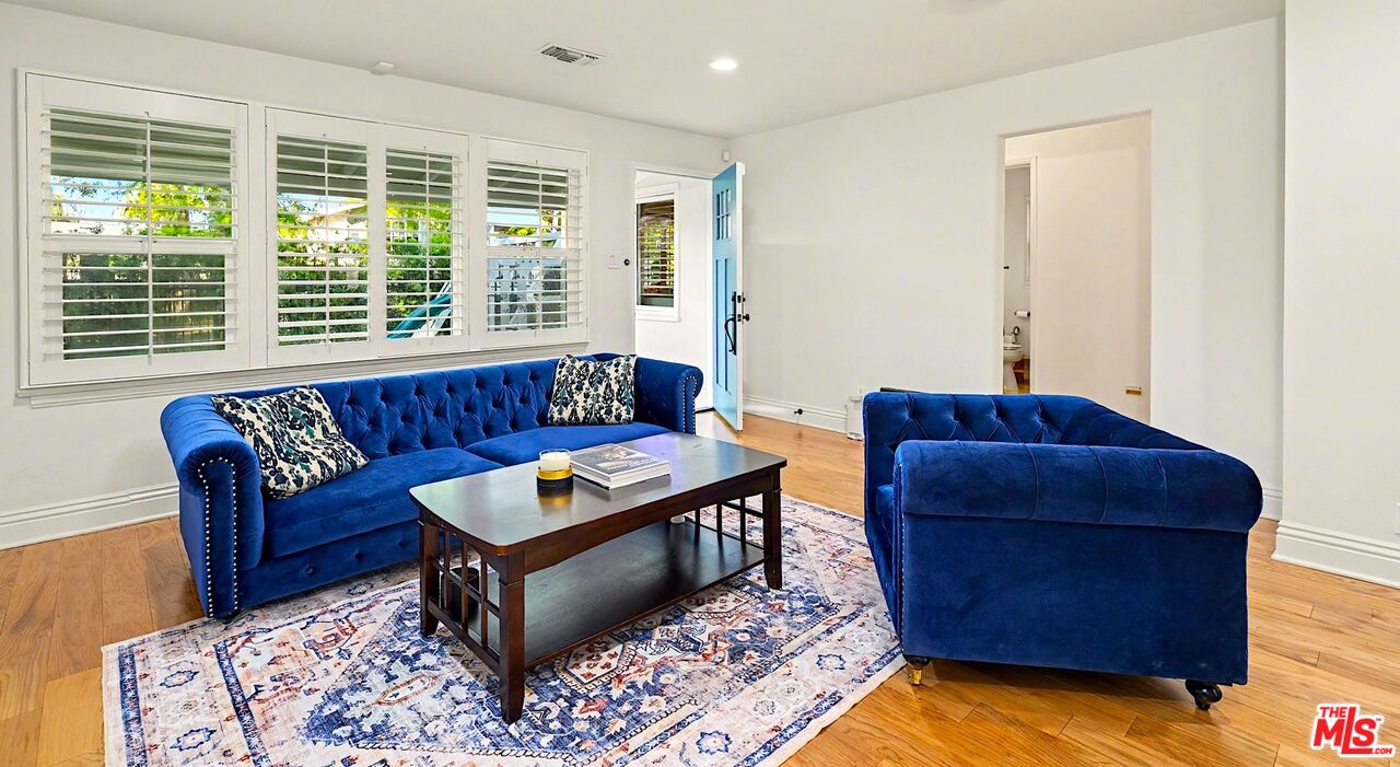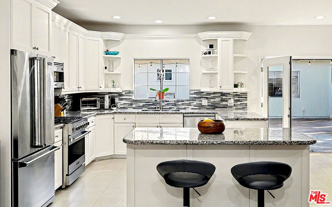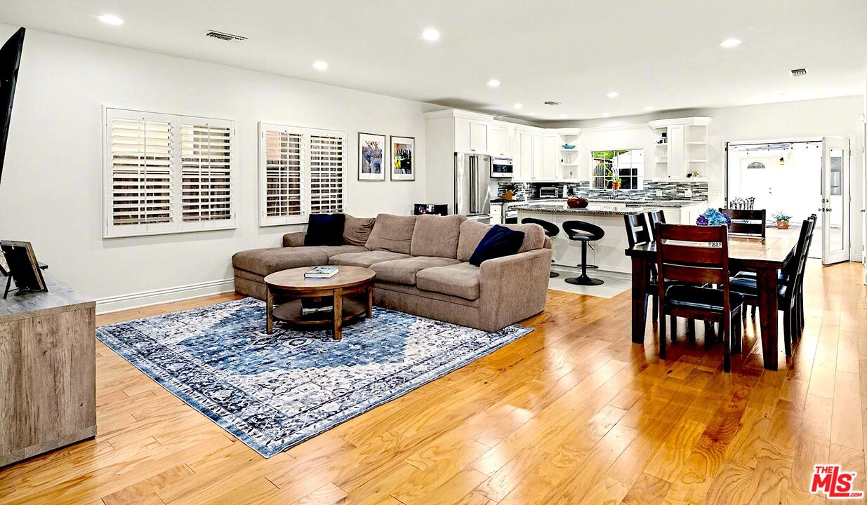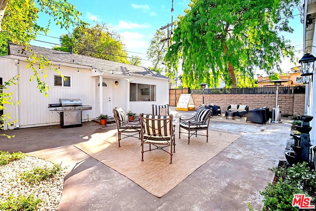This bright and spacious home with ADU on a corner lot awaits! Enter the fully enclosed, grassy front yard beneath a canopy of mature trees. The charming front patio of this updated California Ranch home is ready for gathering during sunny days and relaxing on cool nights. Once inside, you will be welcomed by loads of natural light, gleaming wood floors, and charming window shutters that nod to the homes architectural style. Pass through the elegant formal living room that ushers you into a large open plan kitchen, dining, and family room. The main home has four bedrooms, one currently serves as an exercise room, with a fully updated primary and en-suite spa-like bathroom. Enjoy modern updates such as Viking appliances and a conveniently tucked away laundry area. Double doors from the kitchen take you to the expansive backyard ready for entertaining or quiet evenings enjoying gorgeous sunsets. At the end of this lot you will find a guest house with the fifth bedroom, its own bathroom, and separate kitchen and living area. The attached two car garage has loads of storage space and enters directly into the home. When you do choose to leave this oasis, take your pick of the best shopping, dining, and recreation options nearby. Located in the coveted Kester Elementary school district.