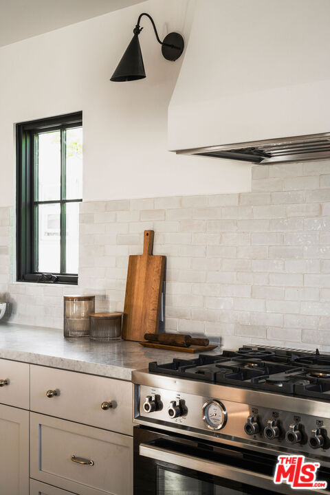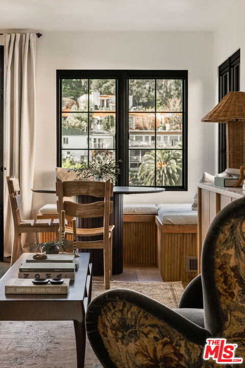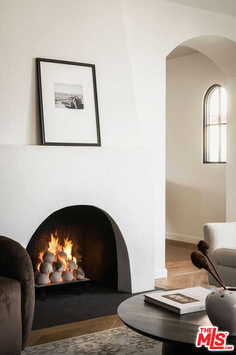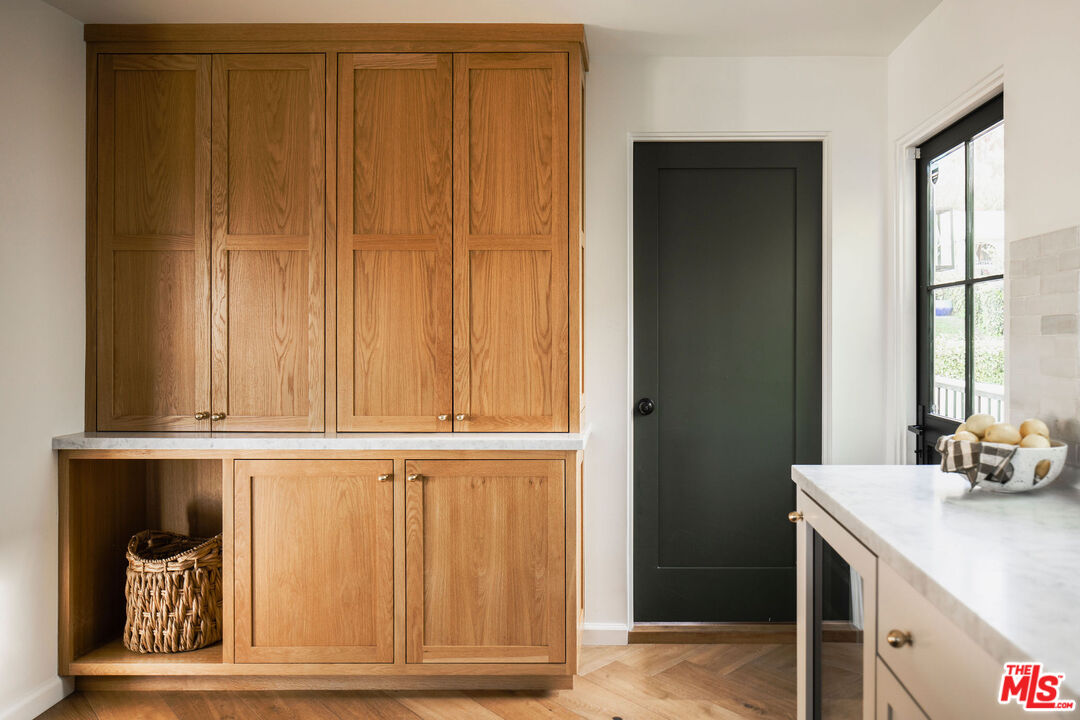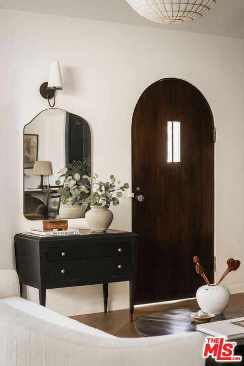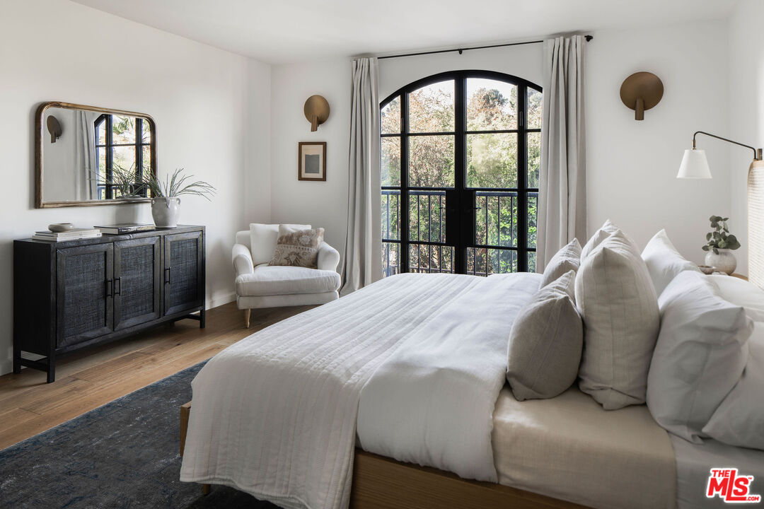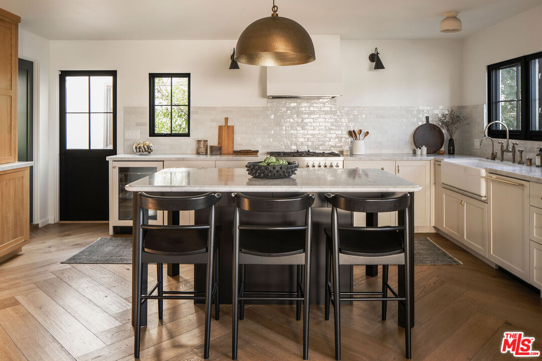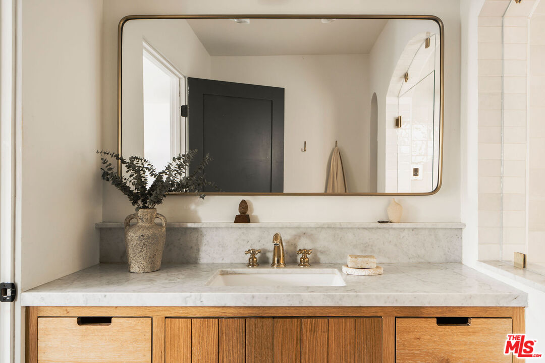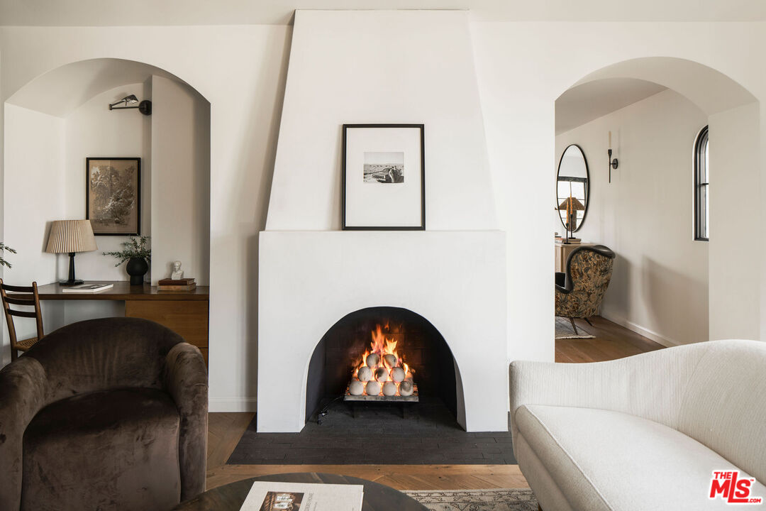 Originally built in 1926, this gorgeous, renovated 2 bed, 2.5 bath Adams Hill home offers striking hillside views and Spanish Revival design, a peaceful and elevated setting. Fully reimagined in collaboration with design firm AV Studio, the residence was renovated and rebuilt in 2020, and now offers an ideal floor plan with curated, high-end finishings and fixtures, as well as all new systems -- a move-in ready retreat in Glendale's most sought-after hillside neighborhood. Past the front patio, enter the home to find a moody front den featuring custom built-in floor-to-ceiling millwork and a traditional plaster fireplace with a center striking Capiz Shell Globe Pendant Light. Replete with timeless character, the corner built-in desk offers an idyllic setting to work or relax. The adjacent open-concept living space is designed for both everyday ease and effortless entertaining, with a living room, dining area, and open kitchen, anchored by a large center island finished in white Carrera marble with bull-nose edging. The kitchen is the heart of the home, featuring custom cabinetry with unlacquered brass hardware and faucets, zellige tile backsplash, and thoughtfully layered lighting. The appliance suite includes a Bertazzoni gas range with six brass burners and a matching hood, a Bosch Benchmark refrigerator, a Bosch drawer microwave, a Miele dishwasher, and a Zephyr wine fridge. The meticulous renovation makes the kitchen both functional and visually striking. A charming powder room with Cle tile flooring is well-appointed for guests. Downstairs, find the home's two bedrooms, two bathrooms, and a laundry room. The primary suite is a true retreat, arched windowed doors, a walk-in closet, spa-inspired bathroom featuring curated finishes, and a luxurious steam shower. The steam shower features penny-round tile flooring, custom-tiled walls and ceiling, and a marble bench. The secondary bedroom is ideal for guests, an office, or flexible living. Interior upgrades extend well beyond aesthetics, with newer HVAC and ducting with Nest thermostats, copper plumbing, newer electrical wiring and panel, a tankless water heater, and energy-efficient appliances throughout. The home also features a whole-house reverse osmosis water filtration system and a water softener, as well as improved drainage with new gutters. Outside, find a backyard private oasis, complete with a brand new wood deck, drought-tolerant landscaping, and privacy hedging lining the perimeter. A cowboy tub and outdoor shower elevate the space, creating an inviting environment for relaxing, entertaining, or enjoying warm California evenings. Ideally situated, the home is just moments from Adams Square, where neighborhood favorites like Kafn Coffee, Grand Kitchen, and Adams Square Mini Park invite you to linger and enjoy the day. Little Ripper is also nearby for casual bites and coffee, while the Glendale Galleria and The Americana at Brand are just a short drive away, offering a vibrant mix of shopping, dining, and entertainment options. With its blend of character, modern upgrades, and prime location, this Adams Hill residence is a truly special offering.