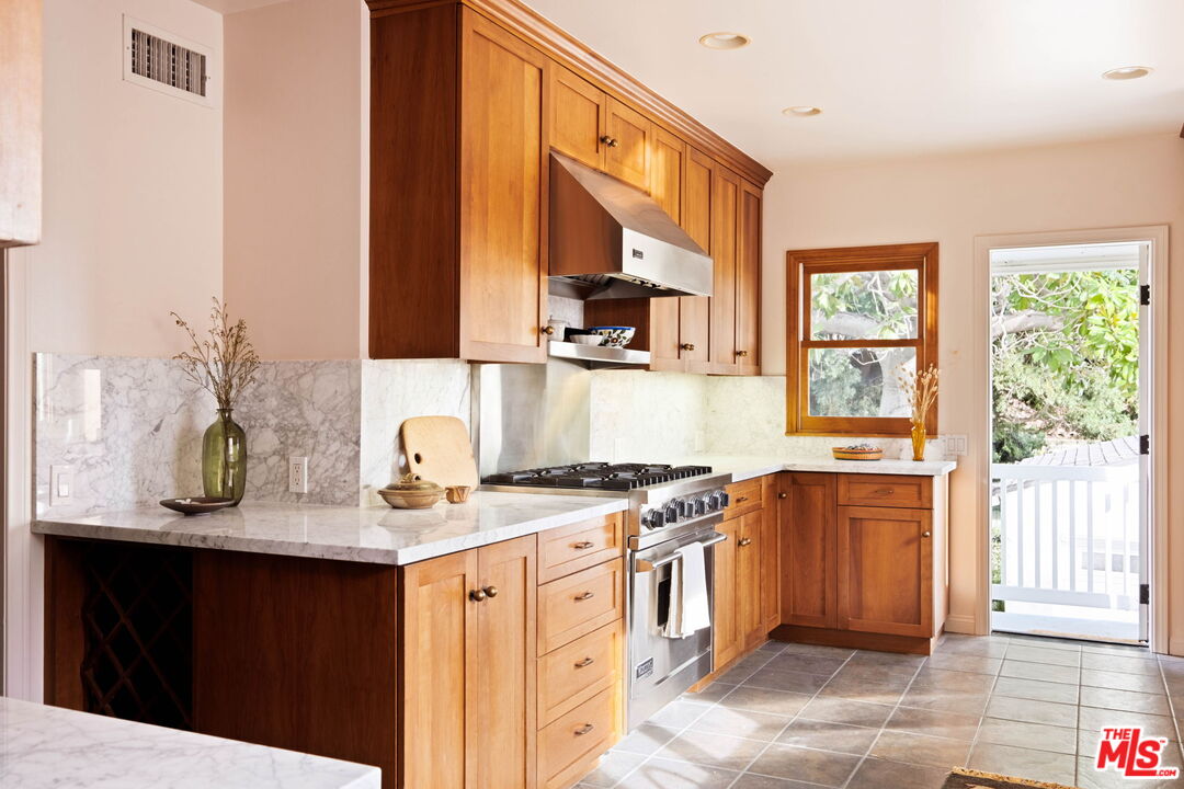 Nestled in Glendale's endlessly photogenic and architecturally storied El Miradero neighborhood, this gloriously illuminated 1929 Spanish Colonial exquisitely blends vintage character with modern design that is timeless--where modern updates have been carefully chosen to complement the home's original character, creating a sense of enduring style that feels authentic to both the residence and its historic surroundings. Located within the highly coveted Glendale school district with sought after dual-language immersion magnet programs, this alluring Grande Dame is surrounded by striking 1920s homes and sits just one block from spectacular Brand Park--home to The Japanese Shoseian Teahouse and historic Brand Library. Upon entering, natural light floods this four-bedroom, three-bath residence, with sunlight glistening across freshly refinished original hardwood floors. In the living room, an oversized picture window frames the picturesque street while the marble flanked fireplace beckons guests to relax and linger. Stepping down from the living room is the captivating primary suite with soaring beamed and vaulted ceilings, its own fireplace, walk-in closet, and French doors that open to the patio and backyard. The spa-like primary bath impresses with a freestanding soaking tub within a generous shower, dual sinks, and custom cabinetry. Beyond the living room, the formal dining room features a bank of vintage windows that pour light into the space. The adjacent chef's kitchen is as functional as it is stunning, showcasing custom wood cabinetry, quartz counters, an enviable six-burner Viking gas range, pantry, and abundant storage. A door off the kitchen invites effortless al fresco dining and gathering on the deck. Tucked behind the kitchen are the laundry area, a second bedroom, currently used as an office, and a full guest bathroom. Upstairs, two oversized bedrooms offer views, generous closets and share a third bath. Storage throughout the home is exceptional, highlighted by a rare walk-out basement with nearly 600 square feet of usable space--ideal for a studio, workshop, or potential ADU while preserving the two-car detached garage. The backyard is a verdant oasis, a tranquil respite from the city, inviting moments of calm beneath mature trees with glorious canopies. Additional upgrades include an owned solar system, new sewer line, and a newer roof. Located in the most desirable part of El Miradero, tucked between Brand Park and just two blocks from the delightfully charming Kenneth Village shops, cafes and restaurants, this preeminent beauty on an idyllic, tree-lined street will ensure you'll never set eyes on another again.