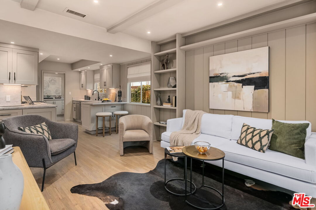 Casual sophistication is the result of a successful blend of traditional and contemporary styles. This delightful and welcoming poolside home celebrates both. A traditional entry hall affords access to all bedrooms and to living and entertaining areas -- which in contemporary fashion flow from the all-new kitchen through the dining/family area overlooking the patio and pool to the fireside living room. Milgard glass panels bring the patio and pool in -- in true SoCal indoor/outdoor living style (which extends to the primary bedroom as well). There are 3 bedrooms in all (one functions equally well as a den or office). Notable here is the ideal, sensible and efficient floorplan: every room is where it should be, and the result is a feel of greater space than its nearly 1600 sq.ft. The finished garage offers the flexibility to be a gym, kids' playroom, studio or adapt to an ADU. The hand of a noted designer is evident in the selection of color palette, lighting, wood flooring, stone, textures, appliances, hardware, cabinetry and other finishes. Updated electrical, plumbing, lighting, etc. Convenient location should you wish to venture out of this warm, charming, private and sophisticated nest. Enjoy the photos, but come and enjoy a visit even more.