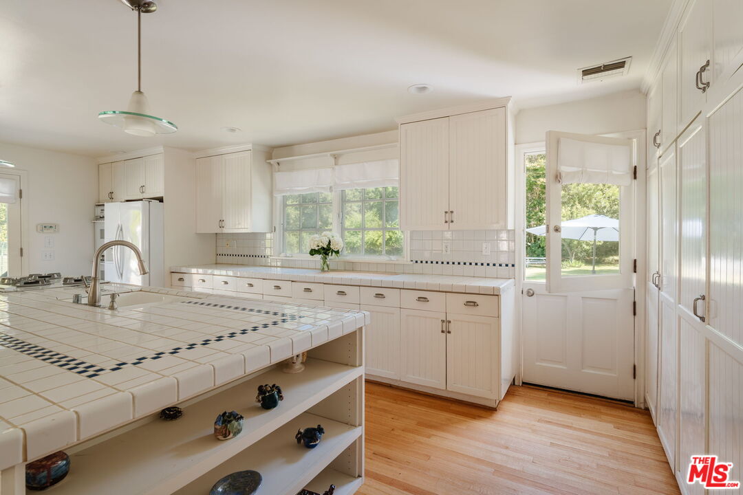 Own a Topanga Landmark. At the far end of the Historic Bonnell Park, a storied Cape Cod home is set in lush, verdant, meadows, framed by towering oaks, cottonwood, maple, and ash trees. With the park serving as a de facto front yard, the white house with inky black shutters sits on a vast flower-framed lawn, beckoning as if from a dream. Set at the end of the Bonnell Cul de sac, this cherished home harkens to farm country, sitting on over 1 1/3 acre of flat lawns, orchards, and gardens. Strawberry peak and Little Rock, two local icons, serve as a backdrop to this home. The history of Topanga is told here. The home was once part of the original John Bonnell estate which includes "The Old Stone House," considered the oldest house in Topanga, built by Jack Wood, a pioneer stage and Post Office mail driver. It has been owned by just 2 families over the past 70 years, and was reimagined by Topanga's renowned architect, Cary Gepner, into the graceful sanctuary it is today. The brief was to seamlessly meld the indoors and out, so every room took in the beauty of the incredible grounds. He delivered. Rooms flooded with abundant natural light, though 5 sets of French doors, encompass the perfect flow for celebrations, or quiet enjoyment. Visitors to the park often exclaim it is the "Most beautiful home in Topanga!" Now is your chance to own this lyrical property, with its oversized pool and spa, fruit trees, and gardens, all set along the banks of Old Topanga Creek. Over the years, this home has been cast as an East Coast home in movies and tv shows, because it calls nostalgically to us of simpler times. But the interiors are updated with serenely minimal rooms perfect for modern country living. Bare feet pad across polished old oak floors. The front foyer opens to a gracious, soaring, two story living room, with a classic fireplace. A wall of French doors looks out from the living room and spacious dining room to where deer meander, and hawks float on updrafts. The inviting open kitchen, with its vast island, hosts a crowd. Doors flung open to the huge patio, pool and spa, allow for that quintessential California indoor-outdoor life! The spacious primary suite opens to the pool through French doors. Its bright bath, with a steam shower, vintage fixtures, and a clawfoot tub opens to a poolside shower. Two other bedrooms with sun-splashed windows sit on the main level. A captivating suite of rooms under the eaves include an antechamber under automatic, venting skylights, that is perfect for reading or drawing. A small nook nearby entices as a hideaway play room. The bedroom up here is a fantasy space ripped from a classic tale, with windows overlooking the estate. Classical landscaping, with abundant flowers, bowers of roses, and trees laden with fruit surround the home. Birdsong brightens your mornings, and frogs, crickets, and the soft hoot of owls serenade you at night. Protected Bonnell Park, Topanga's Halloween destination, is owned by a neighborhood association, and development of the park is forbidden. Red Rock Park, Summit to Summit, and Backbone hiking trails are nearby. Topanga's cafes, shops, and cultural landmarks are close by. Malibu's fabled beaches are near enough to feel the coastal breezes. Easily get to the 101 or the westside. You can have your rural dreams, and your big city life, too. The magic of this home abides, with shooting stars, darting bats, and the burble of the creek. And now you can weave your life into the sweet tale of this storybook home.